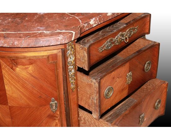 Piccolo cassettone smussato francese di metà 1800, stile Luigi XVI , in legno di bois de violette. Presenta piano in marmo rosso Francia, filetto di intarsio in palissandro, applicazioni in bronzo, 2 cassetti e gambe a spillo con bicchierini in ottone. Provenienza: Francia Epoca: metà 1800...