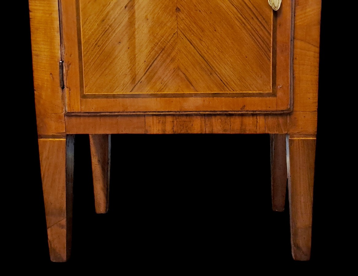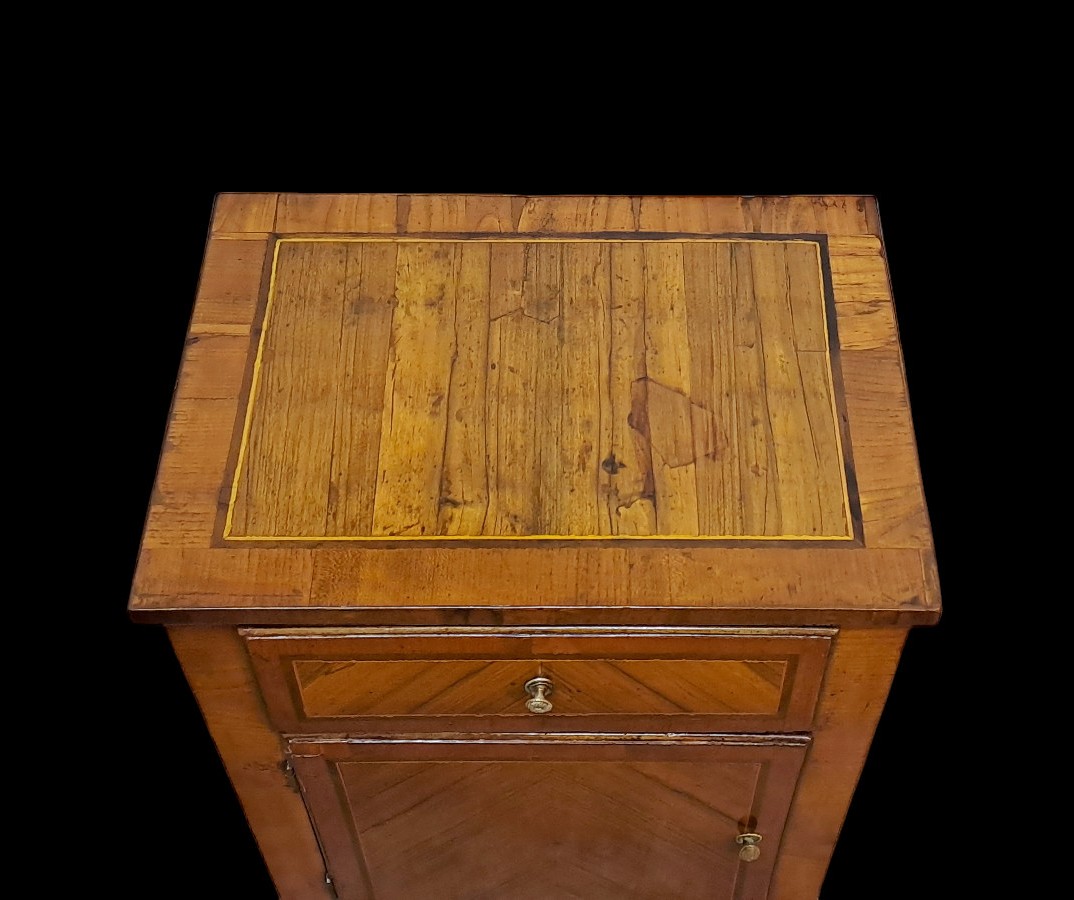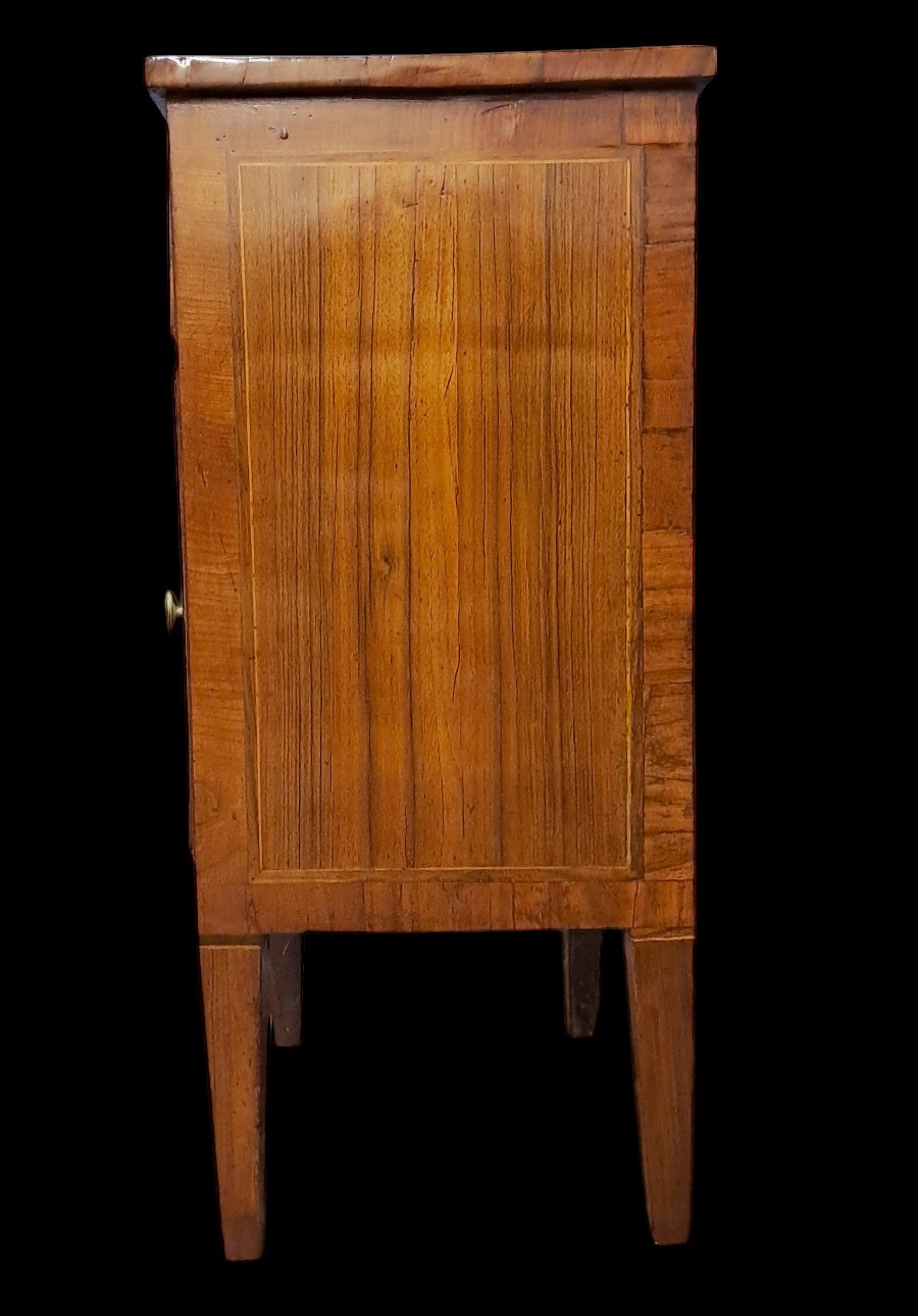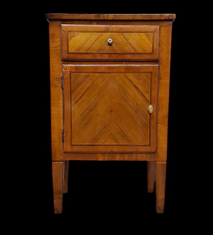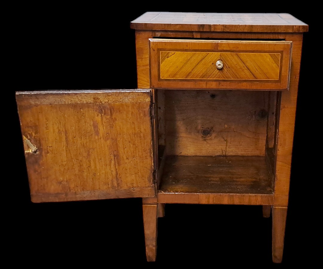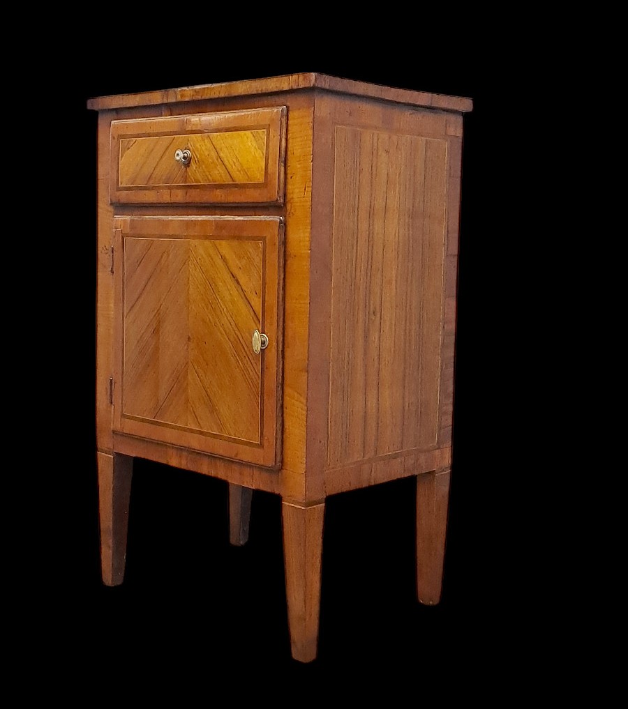 Comodino lastronato in legno di noce.Fronte con antina e cassetto sotto al piano.