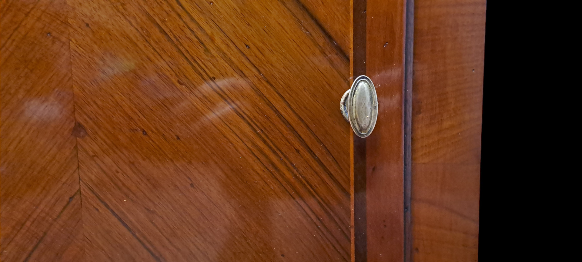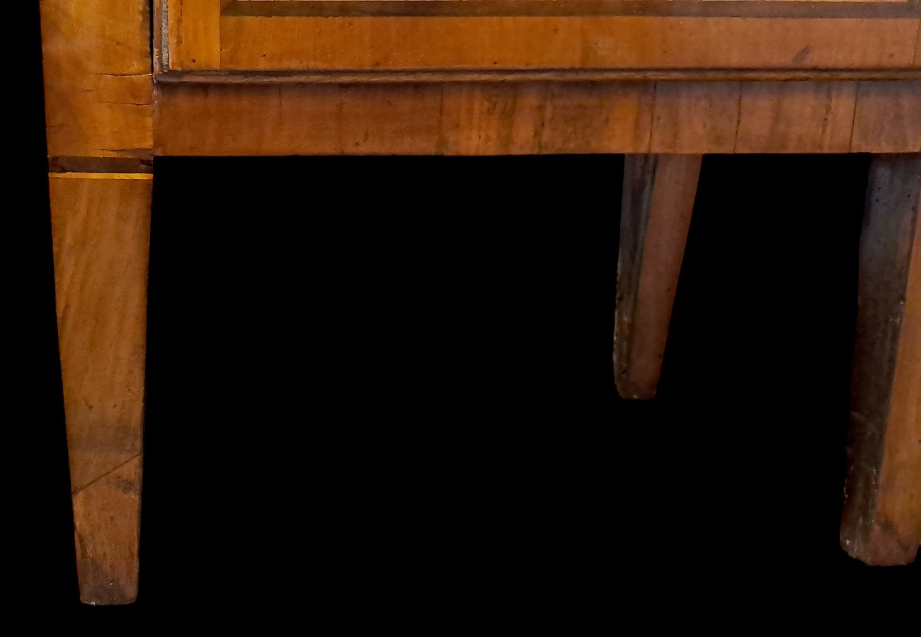 L' intera superficie è lastronata in legno di noce con la disposizione delle venature a lisca di pesce e incorniciature in legno di ciliegio e filetti in bosso.