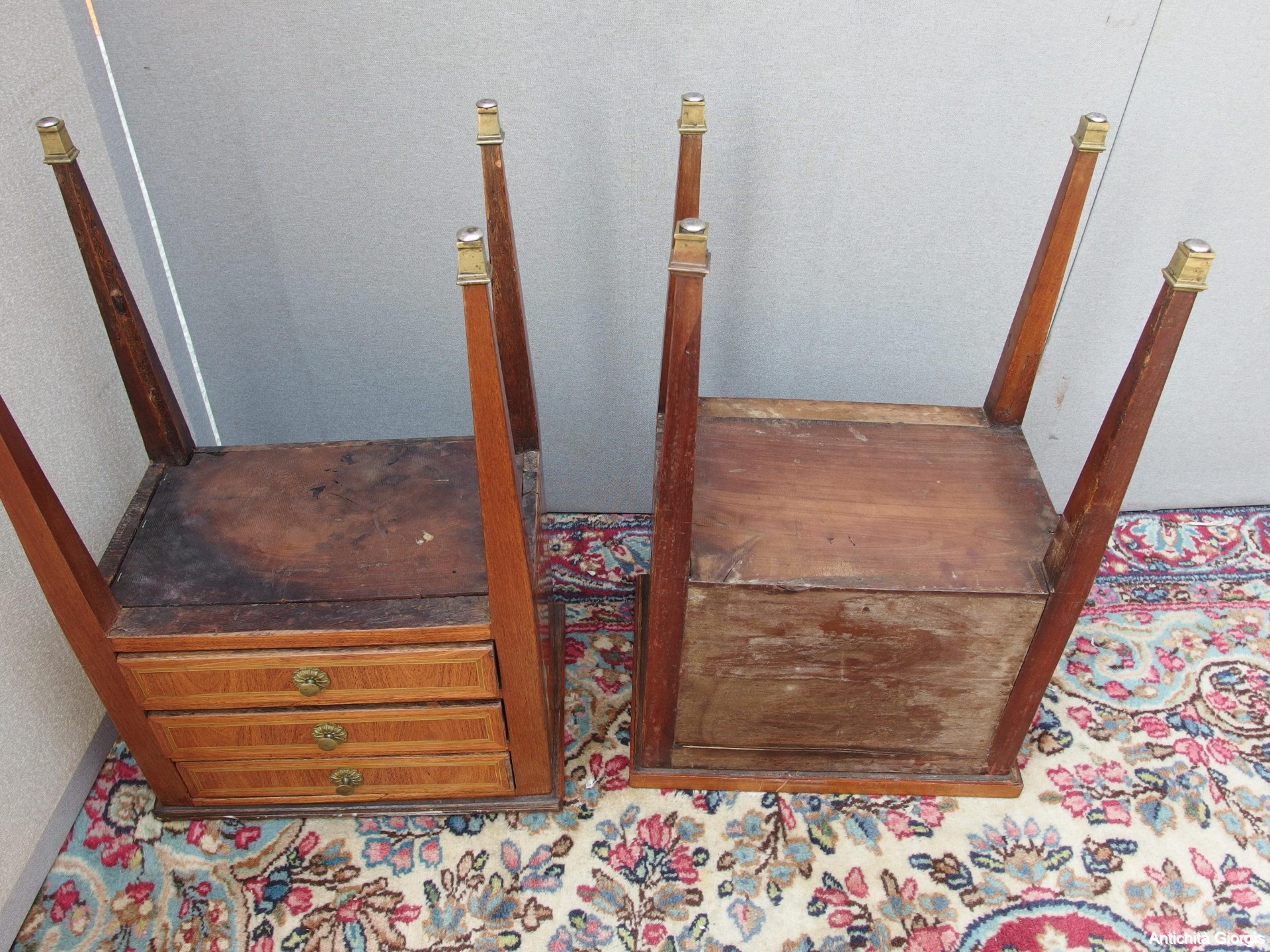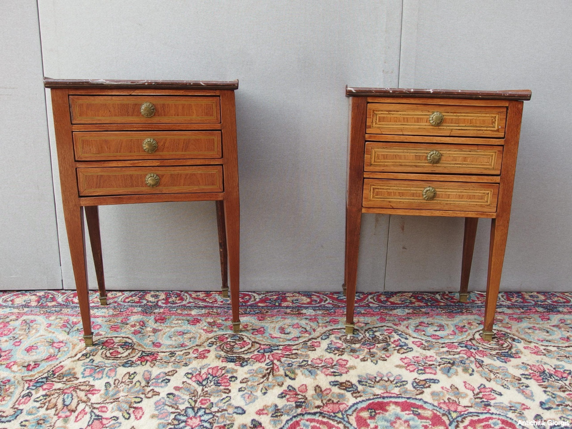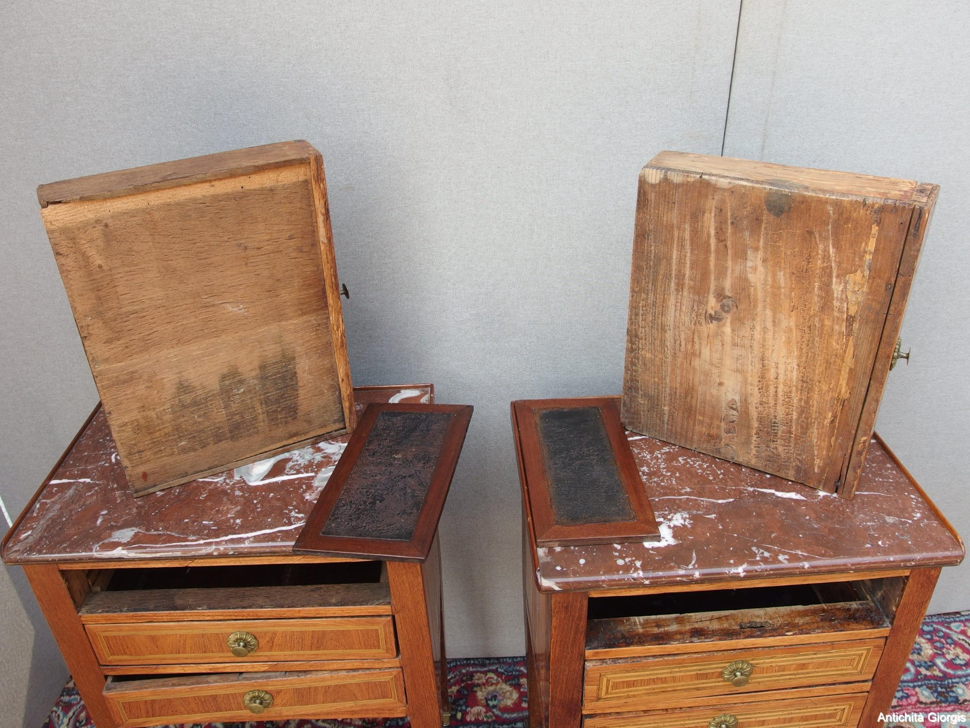 Il comodini necessitano di restauro (vedi foto) i marmetti molto probabilmente sono stati sostituti , da notare la piccola differenza tra loro specialmente sulla filettatura dei cassetti e sui laterali. Il primo cassetto ha un pianetto per poter scrivere, La parte inferiore dei piedi è completata da bronzi.