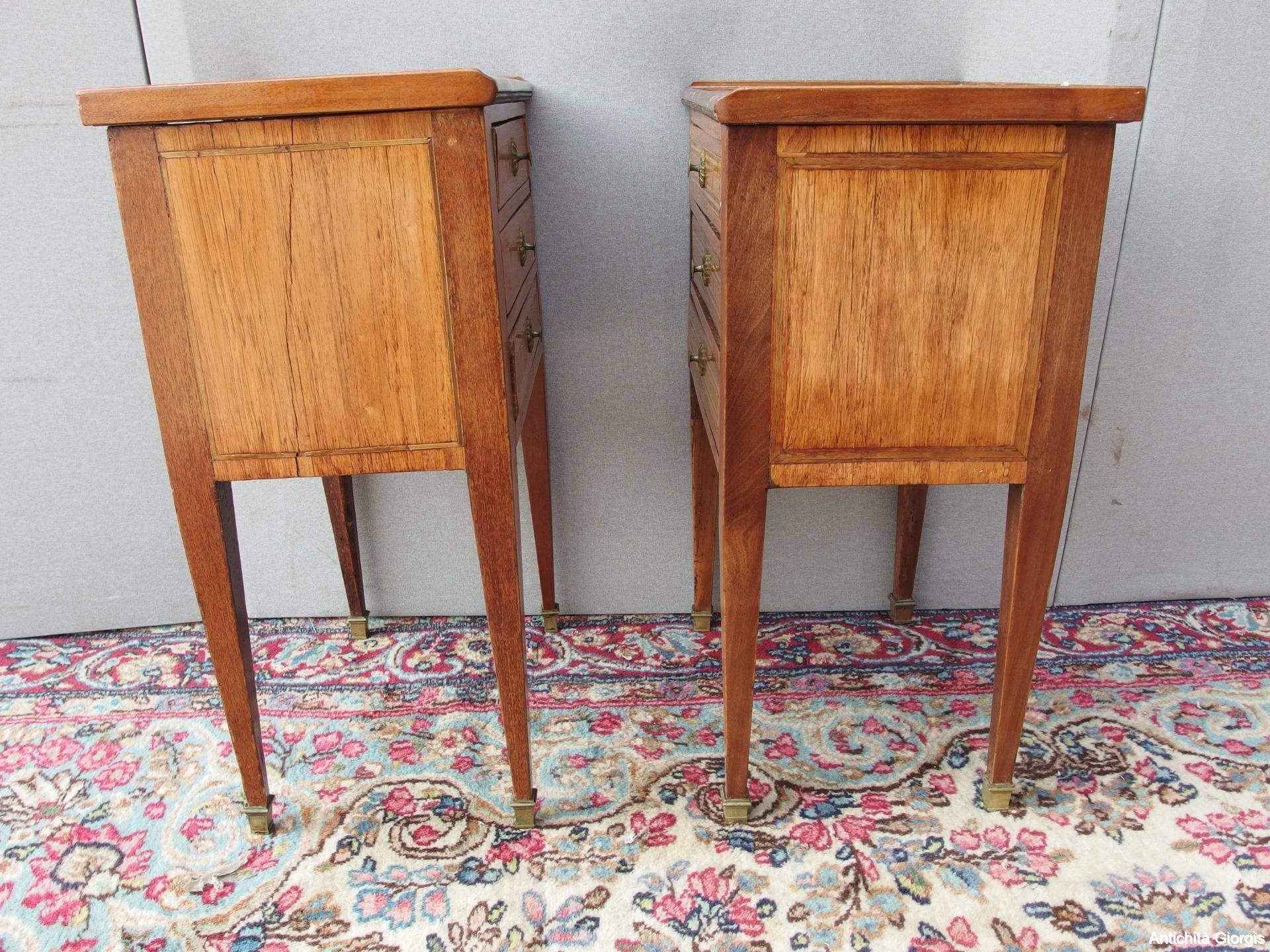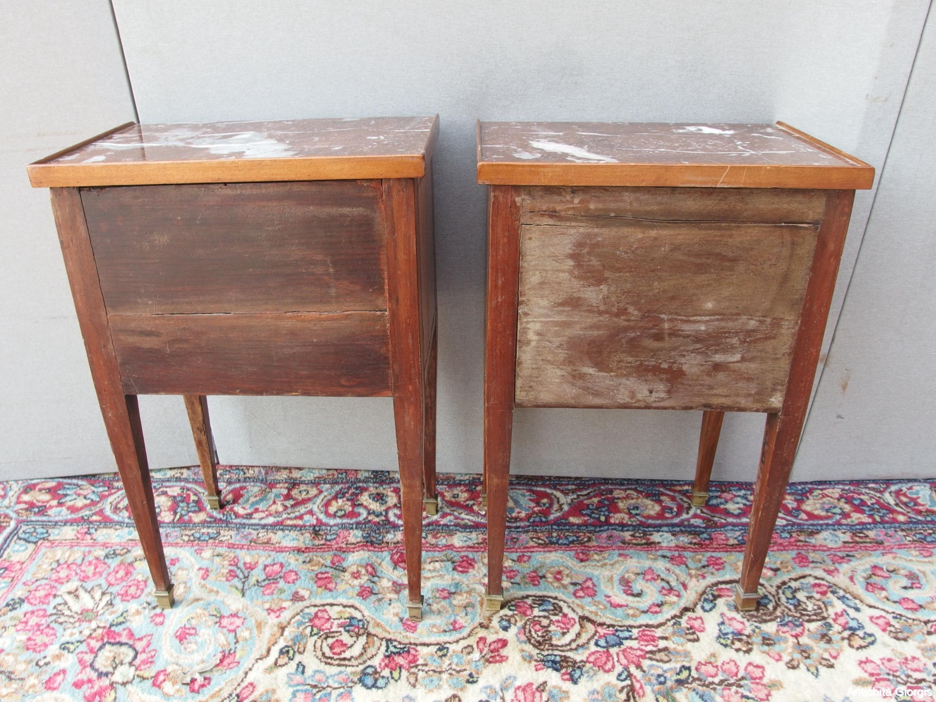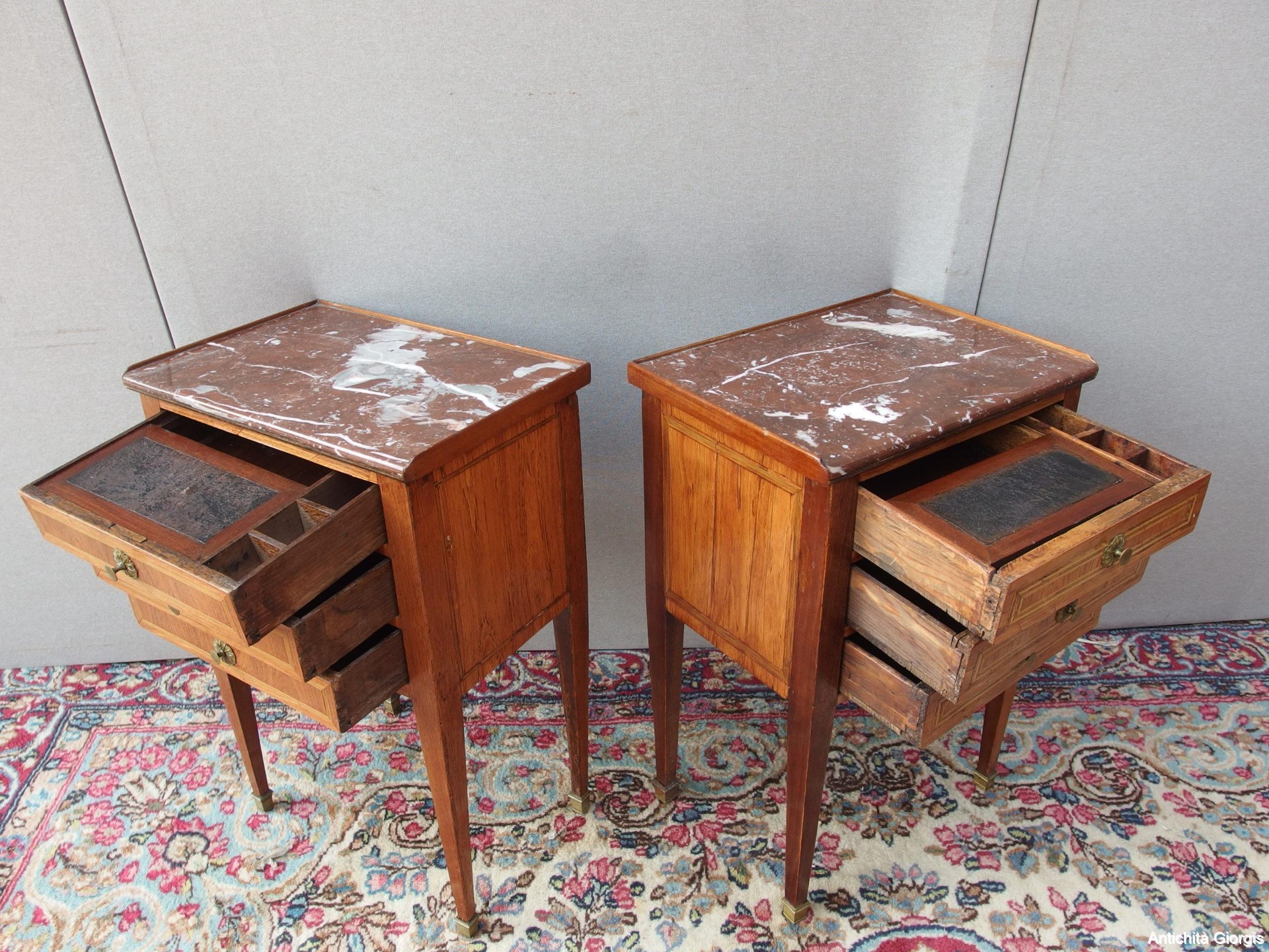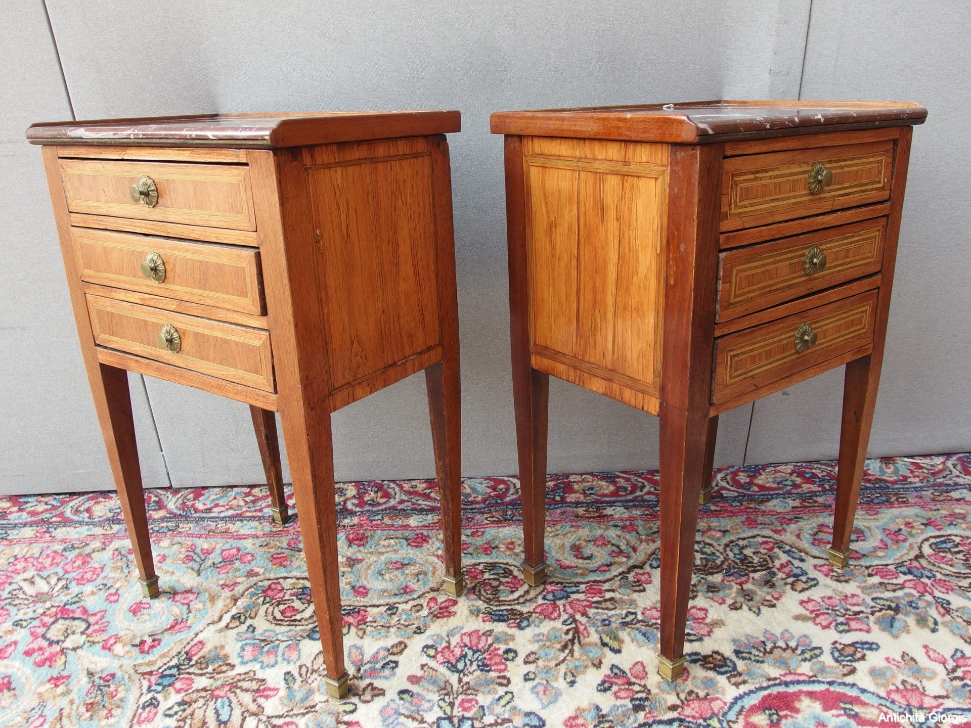 Il comodini necessitano di restauro (vedi foto) i marmetti molto probabilmente sono stati sostituti , da notare la piccola differenza tra loro specialmente sulla filettatura dei cassetti e sui laterali. Il primo cassetto ha un pianetto per poter scrivere, La parte inferiore dei piedi è completata da bronzi.