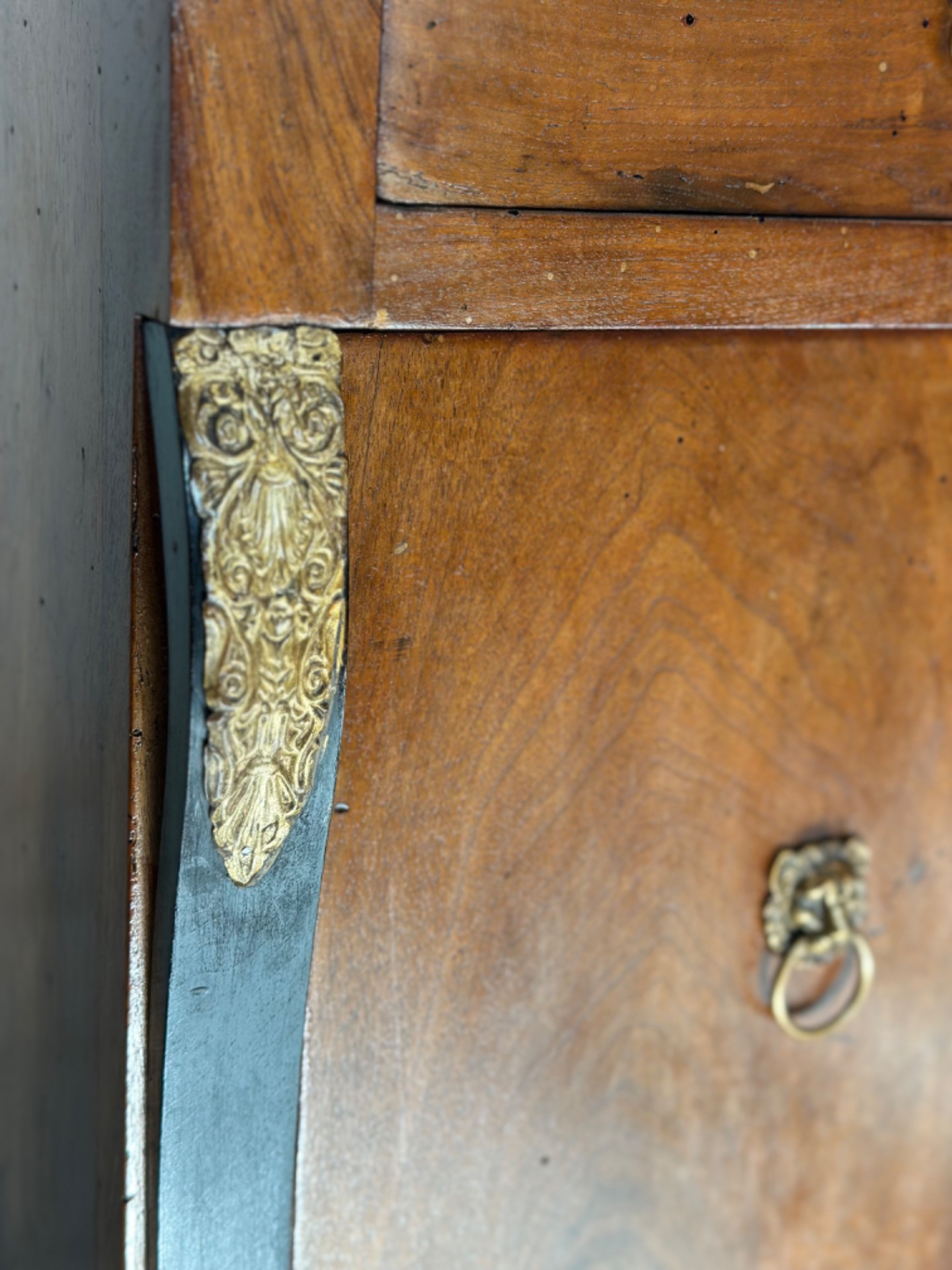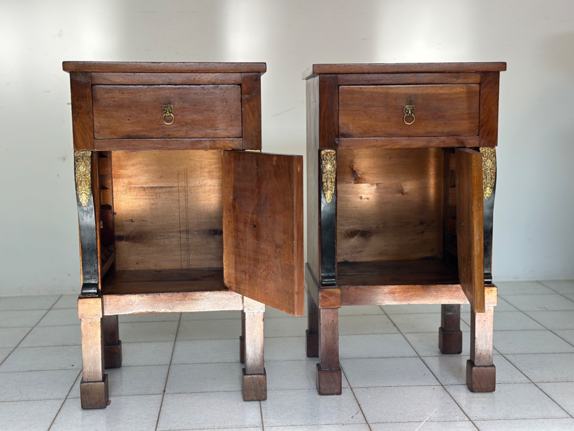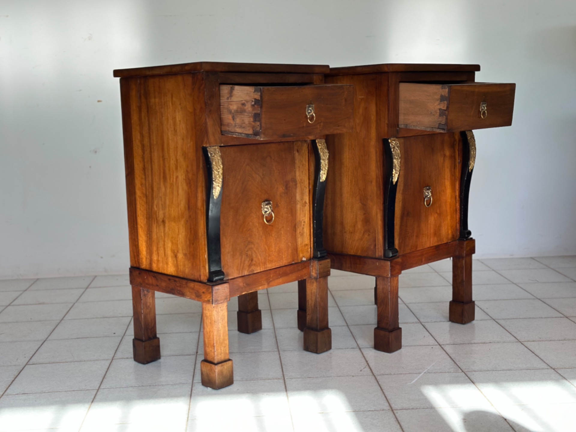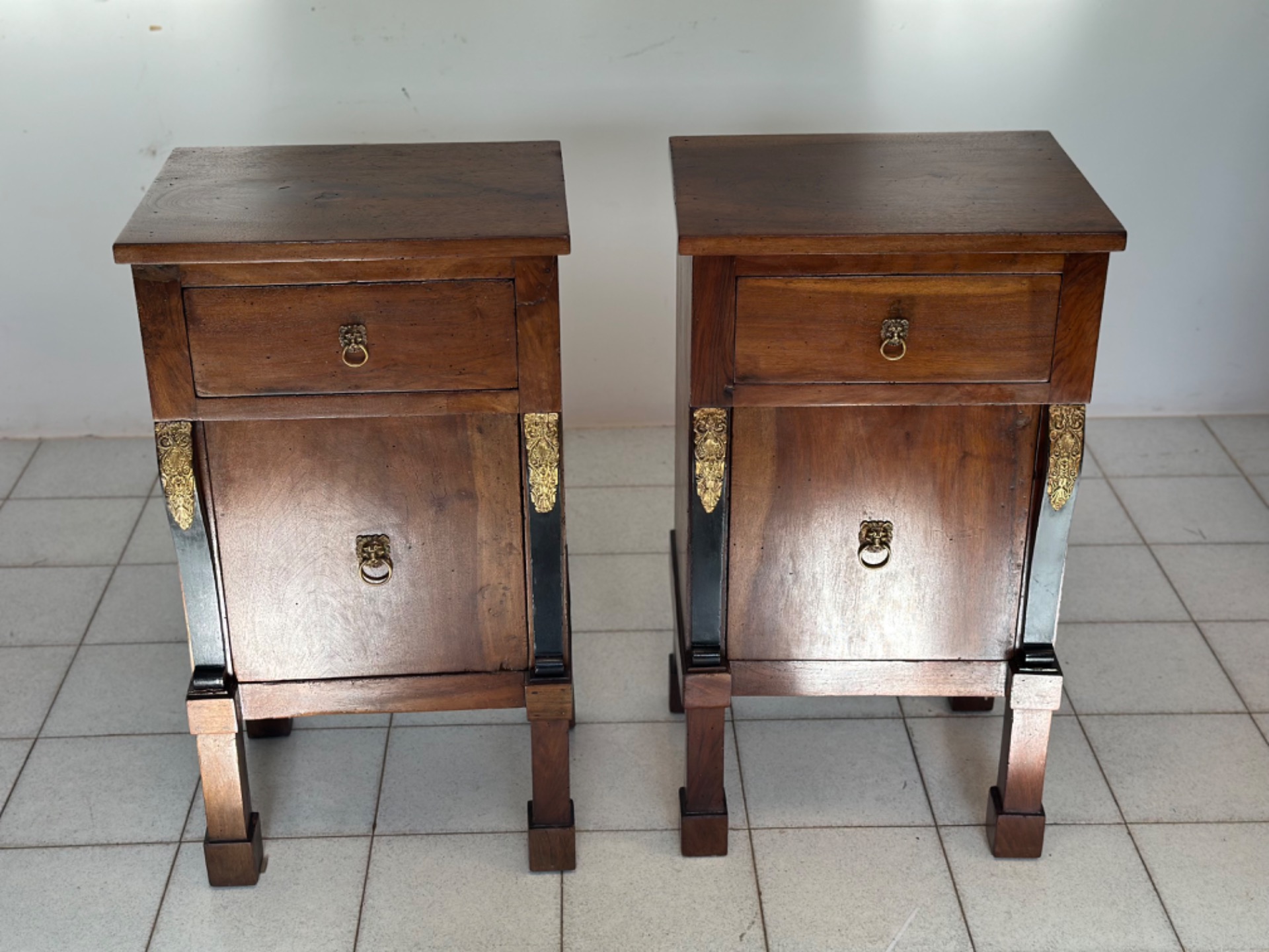 Coppia di comodini impero impero tutti costruiti in noce epoca inizio 800 poggianti su piedi a plinto alti , colonne a bretelle ebanizzate con fregi in bronzo dorato una porta con un cassetto sottopiano