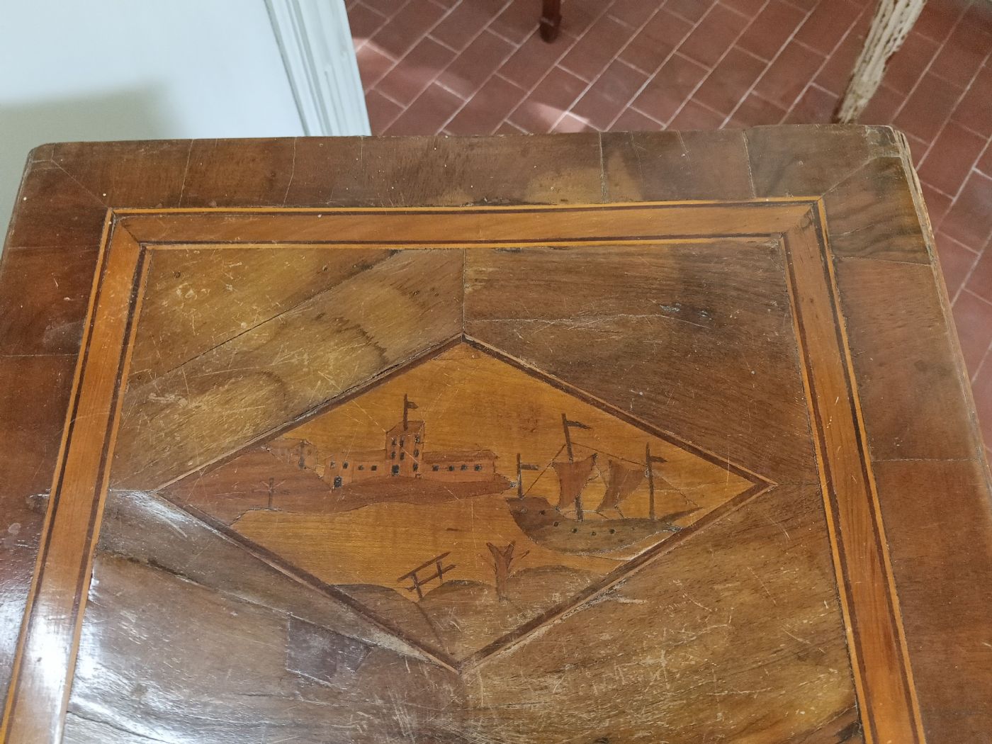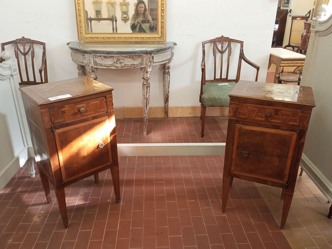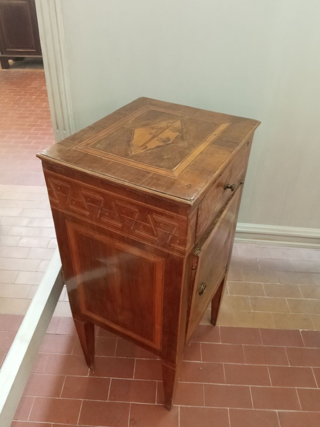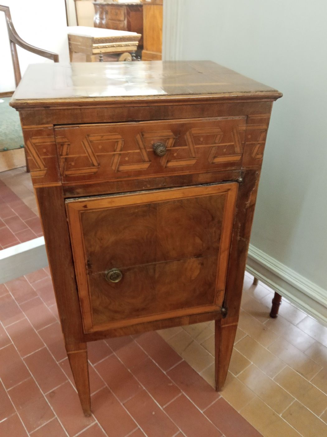 Coppia di comodini in noce con gambe a spillo,filettatura intarsiata e rombi intarsiati sui piani.Un comodino presenta cassetto e sportello,l 'altro sportellino sul cassetto non apribile.Dimenaioni :41x35xh.80