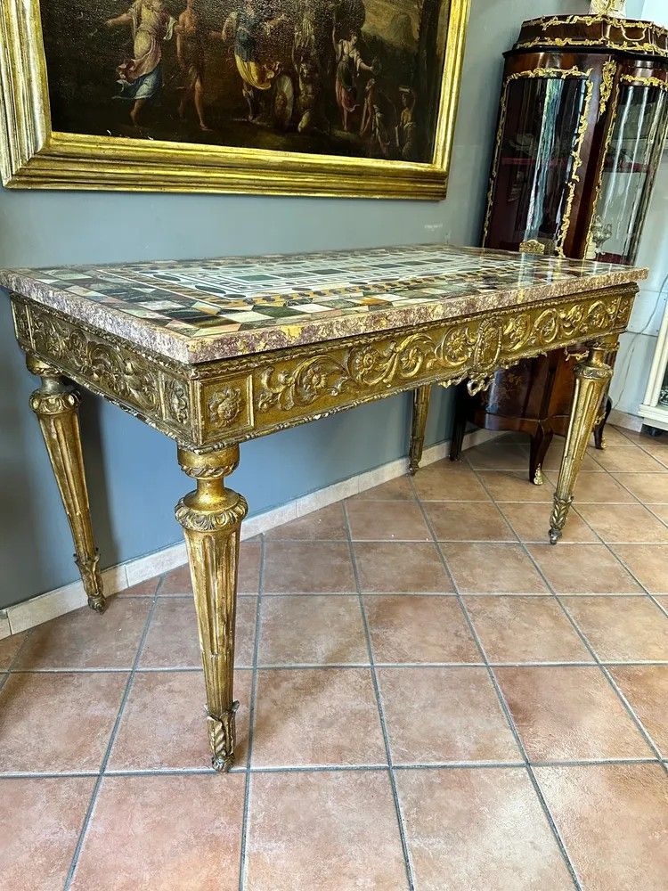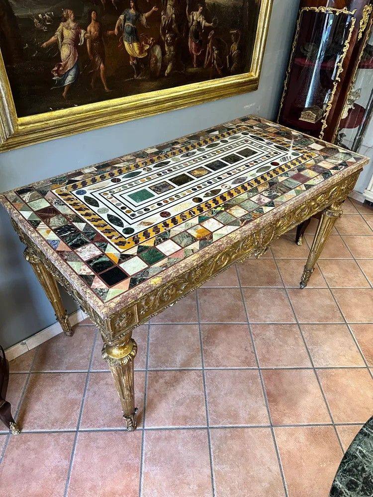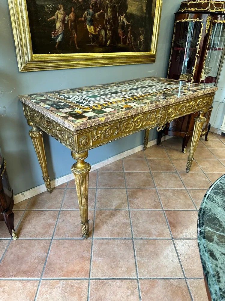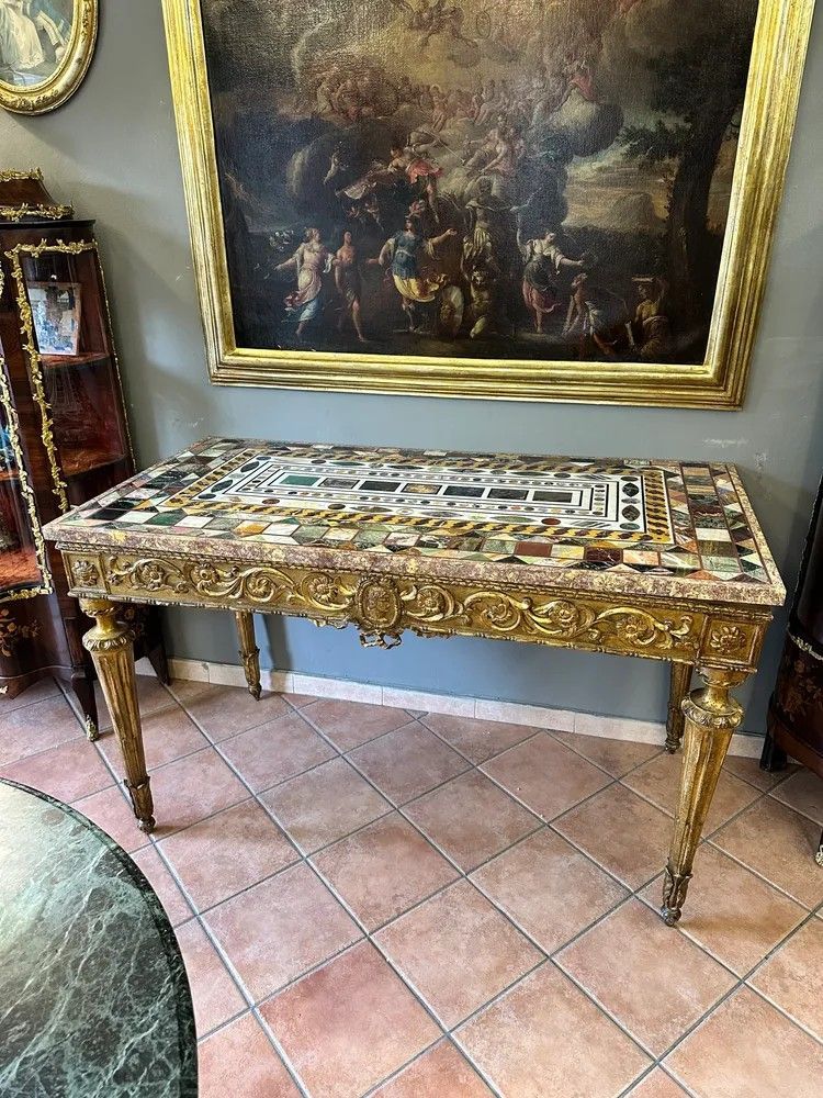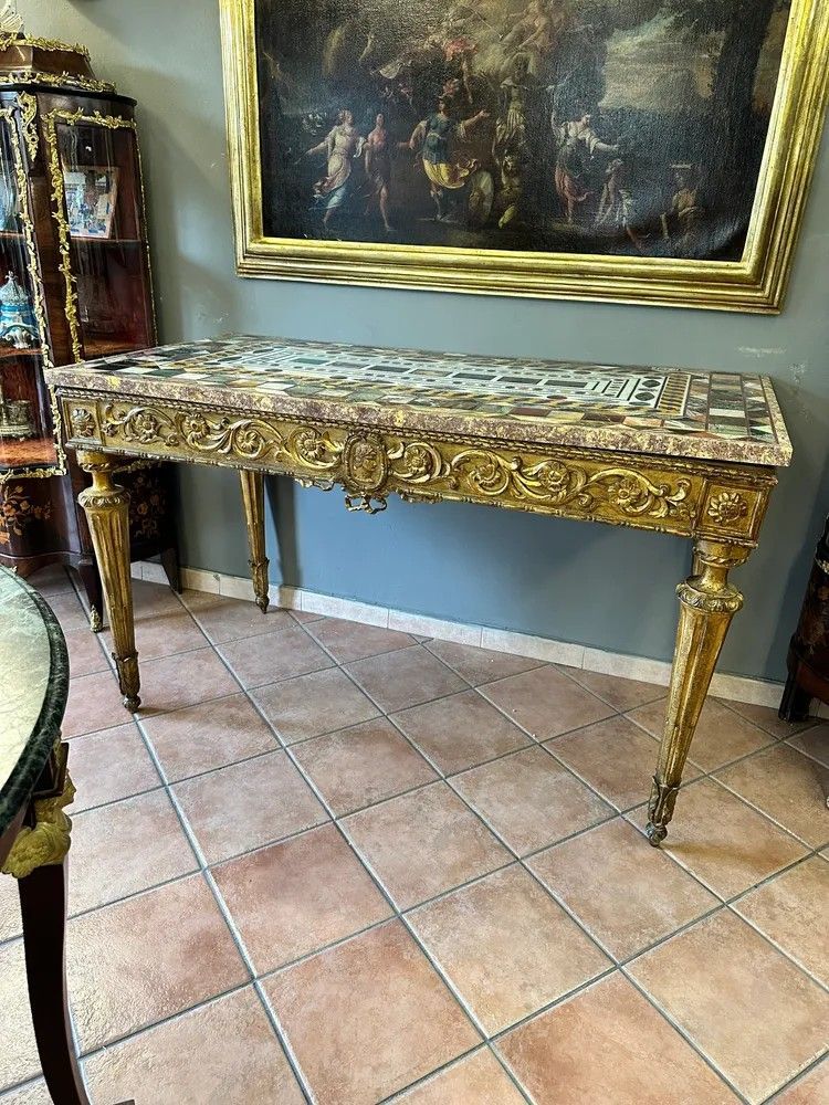 Questa consolle Luigi XVI di alta epoca (XVIII secolo) incarna l’eleganza dell’arredo aristocratico settecentesco. La struttura in legno intagliato e dorato sostiene un incredibile piano in marmo campionario intarsiato, composto da decine di pietre dure e marmi policromi provenienti da cave celebri d’Europa. Il piano presenta un raffinato commesso marmoreo: piccole tessere di diaspro, serpentino, giallo Siena, verde alpi, porfido rosso e molte altre varietà formano motivi geometrici, cornici concentriche e volute, impreziosendo ulteriormente l’ampia lastra di base in marmo bianco con i bordi realizzati in broccatello violetto. Dimensioni: 158 cm (L) x 80 cm (P) x 96 cm (H)Epoca: XVIII secolo – circa 1770Stile: Luigi XVIMateriali: legno scolpito e dorato; piano in marmo e pietre dureIl grembiale riccamente scolpito è decorato con motivi a foglie d’acanto, bouquet floreali e un medaglione centrale con volti allegorici. Le gambe scanalate, rastremate e concluse da capini ferini in bronzo, riprendono fedelmente il gusto neoclassico del periodo. Perfetta come pezzo da collezione o punto focale in un ingresso monumentale, la consolle conserva una patina autentica che ne testimonia i quasi tre secoli di storia. Un’opera unica, destinata a impreziosire ambienti eleganti e a tramandarsi come investimento di grande valore storico-artistico.Stile: Luigi XVI Materiale: LegnoAltezza (cm): 96Larghezza (cm): 158Profondità (cm): 80Epoca: XVIII Secolo - 1700