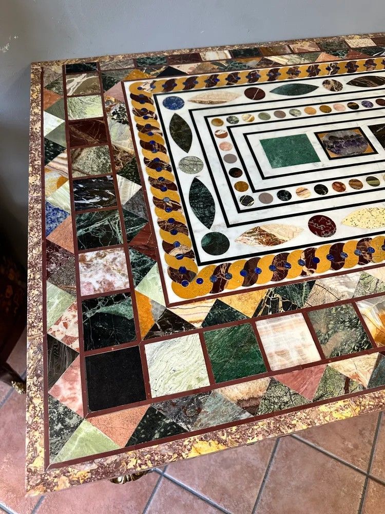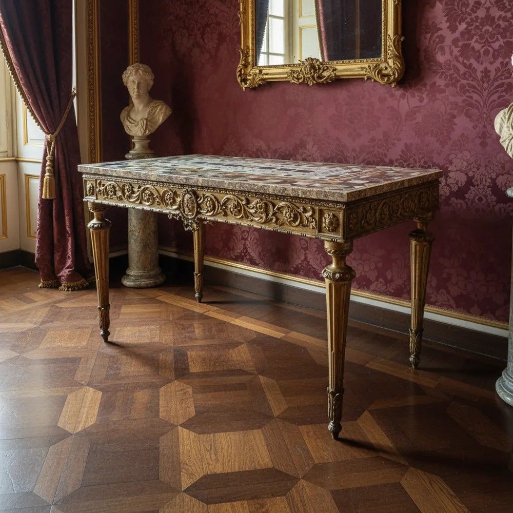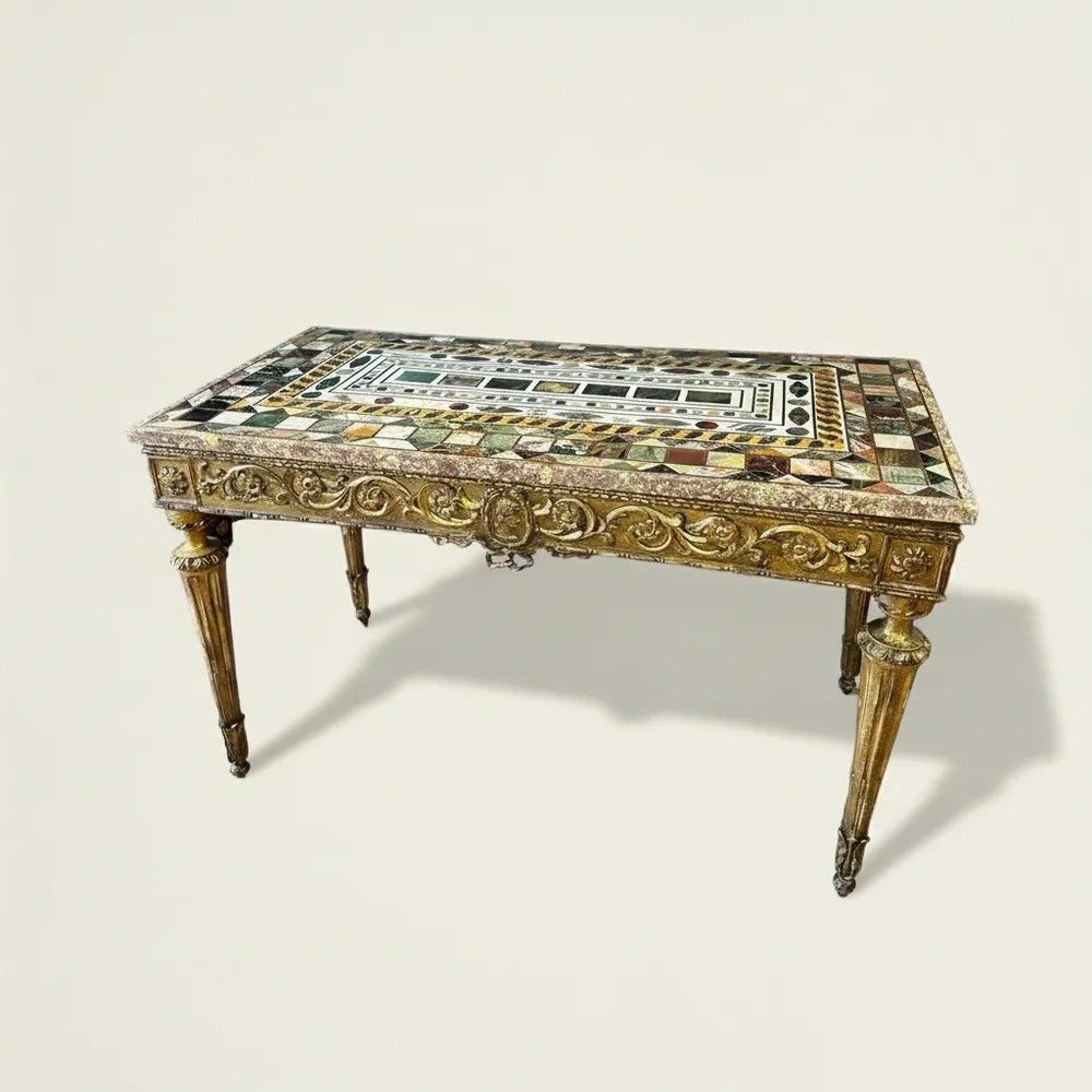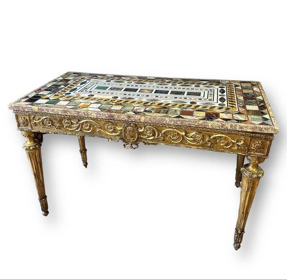 Questa consolle Luigi XVI di alta epoca (XVIII secolo) incarna l’eleganza dell’arredo aristocratico settecentesco. La struttura in legno intagliato e dorato sostiene un incredibile piano in marmo campionario intarsiato, composto da decine di pietre dure e marmi policromi provenienti da cave celebri d’Europa. Il piano presenta un raffinato commesso marmoreo: piccole tessere di diaspro, serpentino, giallo Siena, verde alpi, porfido rosso e molte altre varietà formano motivi geometrici, cornici concentriche e volute, impreziosendo ulteriormente l’ampia lastra di base in marmo bianco con i bordi realizzati in broccatello violetto. Dimensioni: 158 cm (L) x 80 cm (P) x 96 cm (H)Epoca: XVIII secolo – circa 1770Stile: Luigi XVIMateriali: legno scolpito e dorato; piano in marmo e pietre dureIl grembiale riccamente scolpito è decorato con motivi a foglie d’acanto, bouquet floreali e un medaglione centrale con volti allegorici. Le gambe scanalate, rastremate e concluse da capini ferini in bronzo, riprendono fedelmente il gusto neoclassico del periodo. Perfetta come pezzo da collezione o punto focale in un ingresso monumentale, la consolle conserva una patina autentica che ne testimonia i quasi tre secoli di storia. Un’opera unica, destinata a impreziosire ambienti eleganti e a tramandarsi come investimento di grande valore storico-artistico.Stile: Luigi XVI Materiale: LegnoAltezza (cm): 96Larghezza (cm): 158Profondità (cm): 80Epoca: XVIII Secolo - 1700