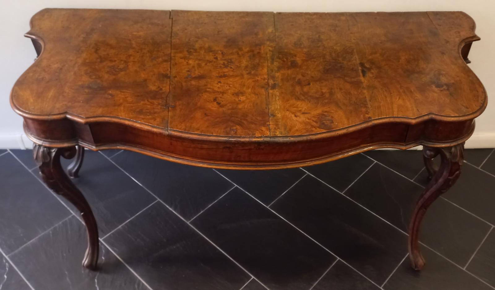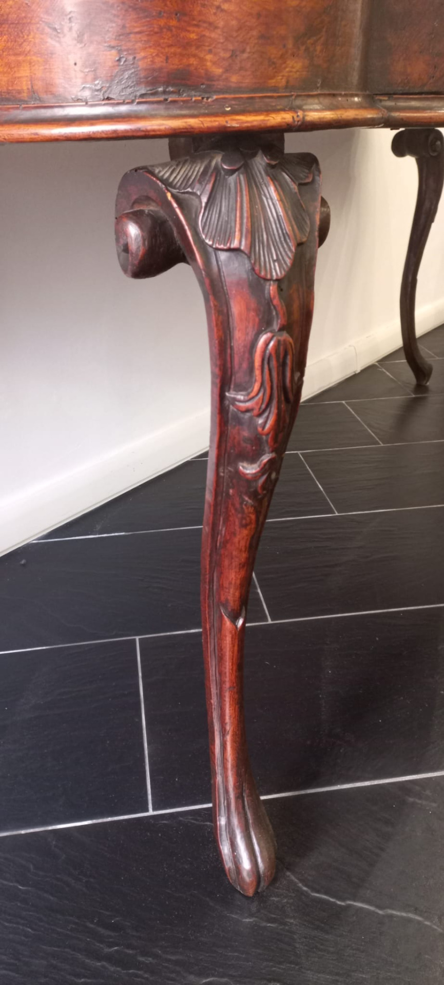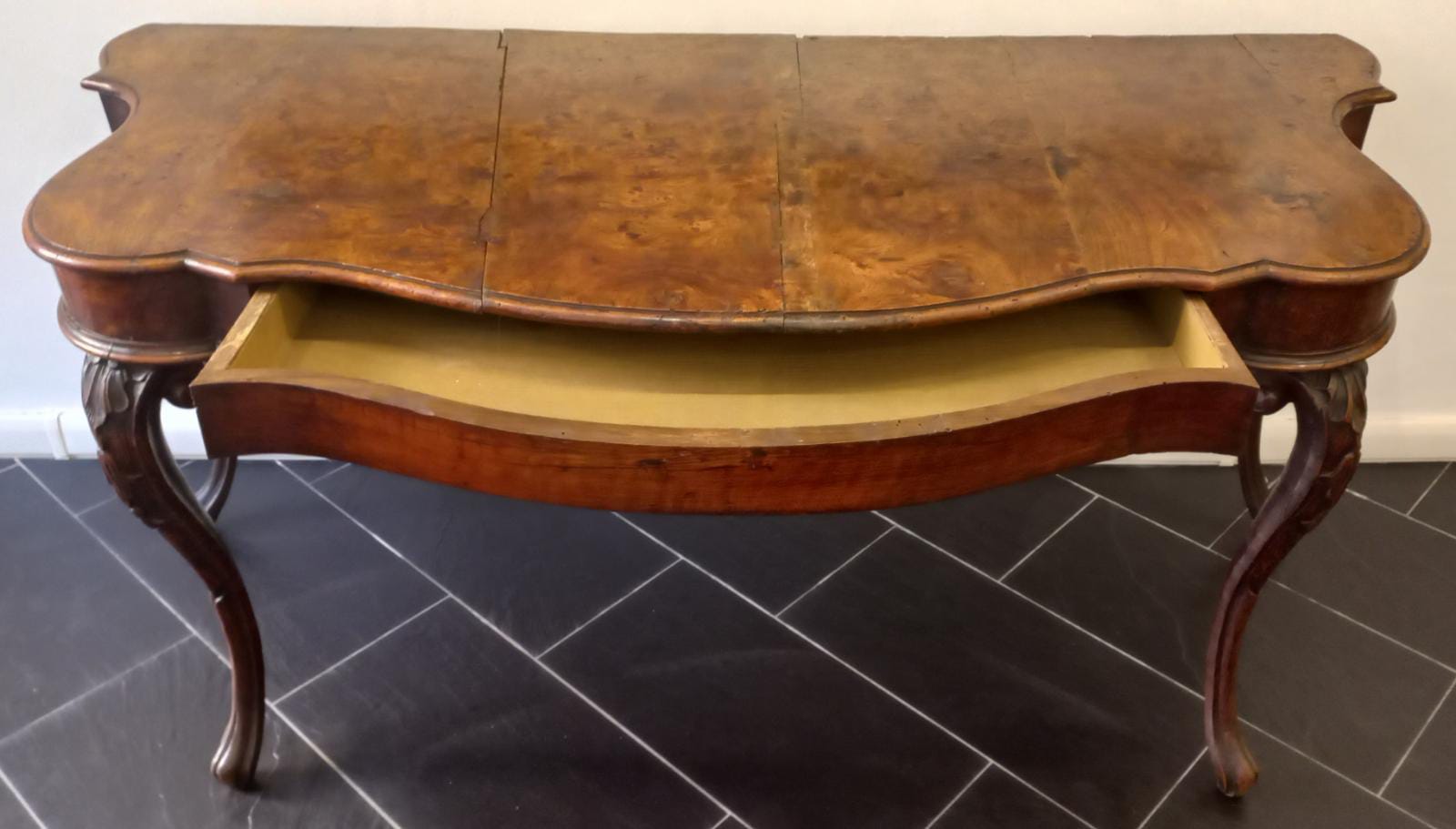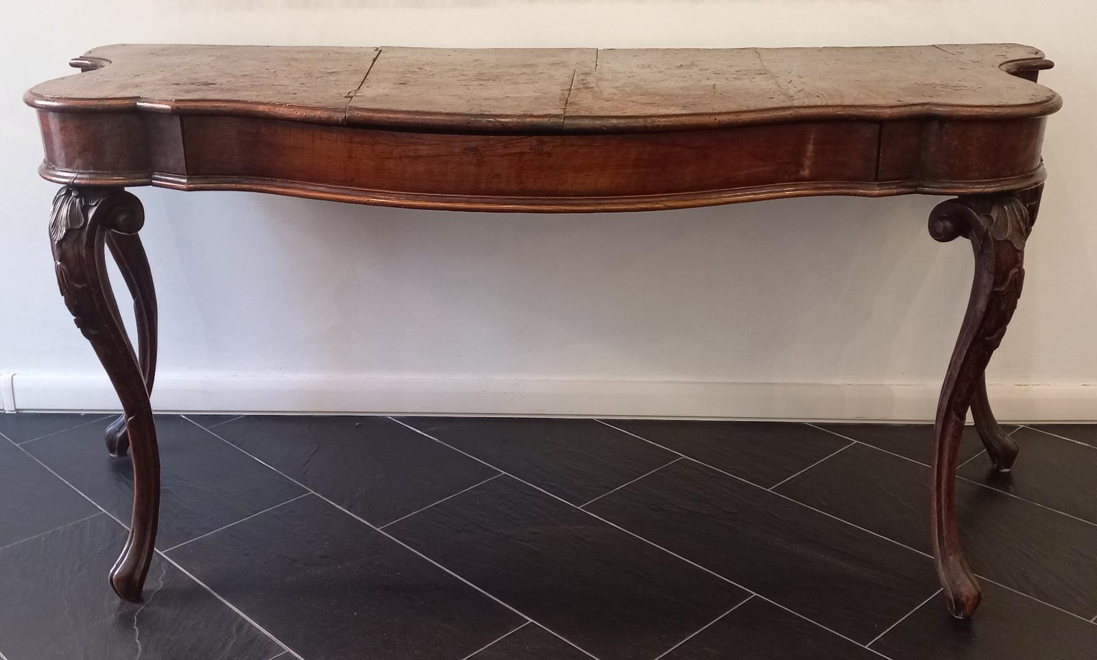 Console in legno massiccio epoca Luigi XIV, gambe finemente intagliate e mosse, area ferrarese, inizio XVIII secolo, cassetto a scomparsa, misure 171x80 cm, altezza 78 cm.