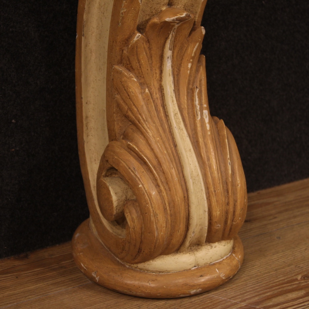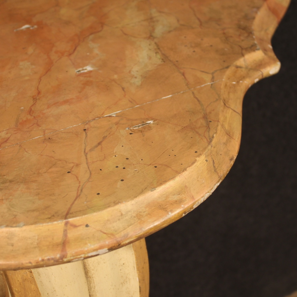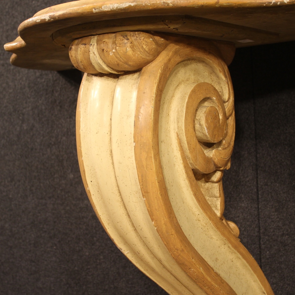 Console italiana della metà del XX secolo. Mobile di bella linea e piacevole arredamento in legno scolpito, laccato e dipinto. Console da parete, sostenuta da una solida gamba centrale finemente scolpita e laccata, da fissare a parete per una perfetta stabilità. Mobile munito di piano superiore ligneo laccato finto marmo di buona misura e servizio con qualche segno del tempo e di usura (vedi foto). Console per antiquari e arredatori che presenta alcune cadute di colore (vedi foto), in bella patina. Strutturalmente sana, nel complesso in buono stato conservativo.