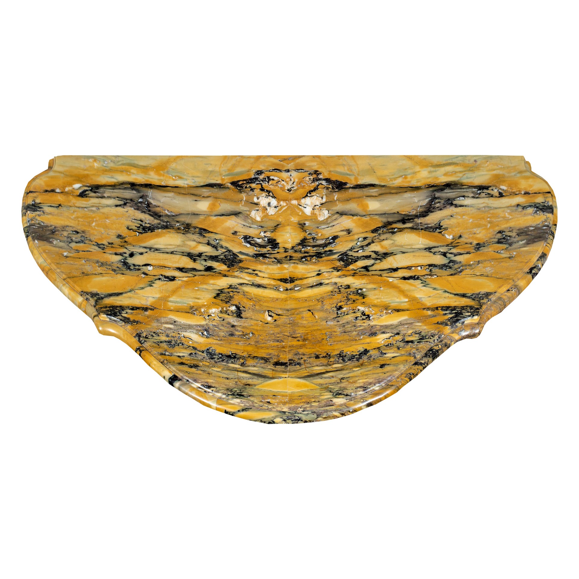 Realizzata interamente in legno finemente intagliato e dorato, reggente un piano in marmo giallo venato coevo. Decorazione di gusto Barocco raffigurante una figura antropomorfa alata realizzata su disegni di Giovanni Battista Foggini (Firenze 1655 - Firenze 1725).