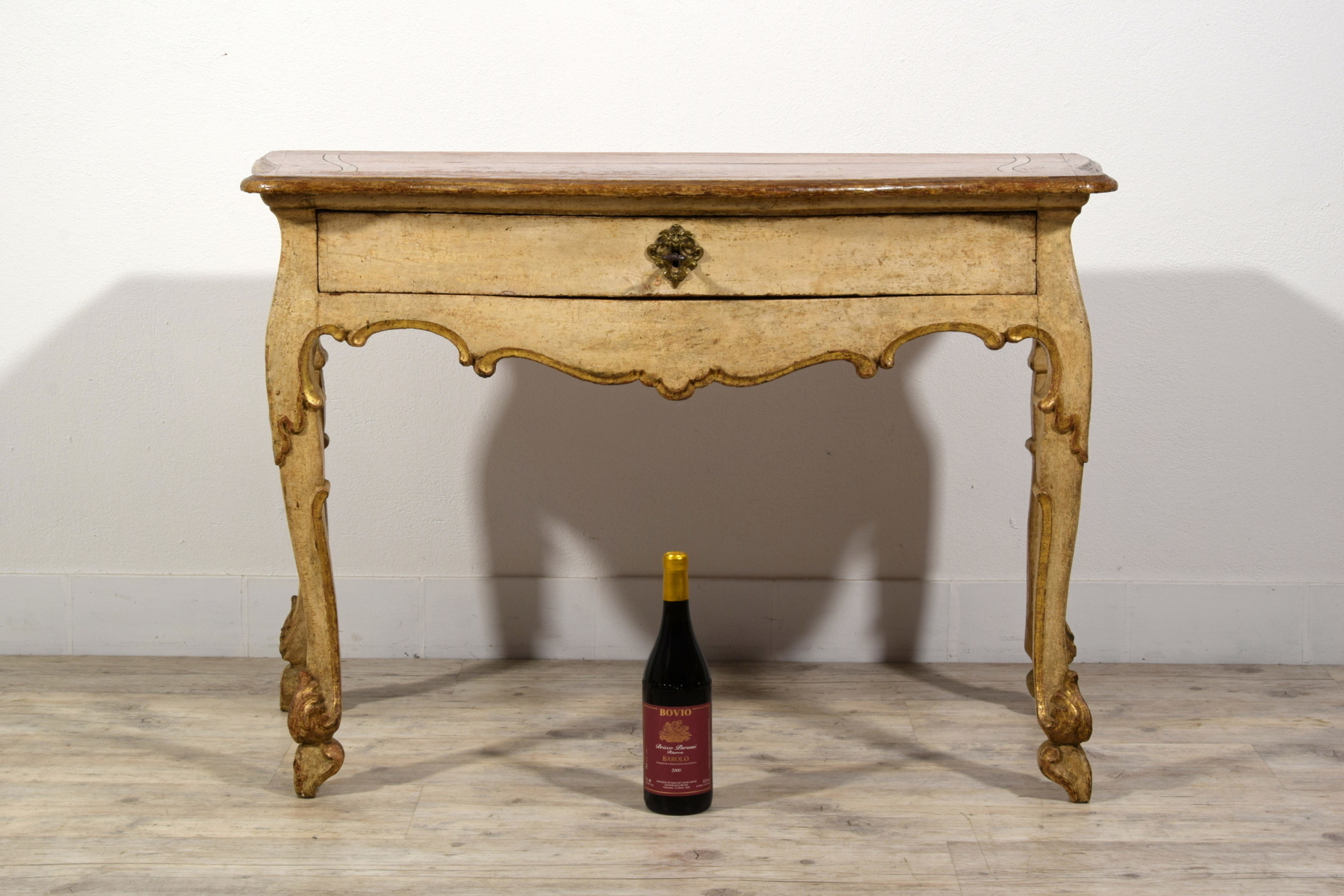 Questa elegante consolle barocca è stata realizzata nei primi anni del XVIII secolo, in epoca barocca. Detta “a ¾” ha delle dimensioni particolari, in quanto è leggermente più bassa delle consolle tradizionali, favorendo la sua collocazione. La sua struttura lignea è interamente laccata e dorata. Il piano, più largo posteriormente e dal profilo leggermente mosso e dorato, è laccato a finto marmo con riserva ocra. La fascia sottopiano, corredata da un cassetto con bocchetta in bronzo cesellato a foggia di mascherone, termina con un profilo intagliato mistilineo con bordo dorato molto decorativo e caratteristico dell’epoca barocca. Le gambe sono arcuate e mosse, intagliate con motivi fitomorfi dorati. I particolari piedi sono decorati da volute e foglie d’acanto intagliate e dorate.