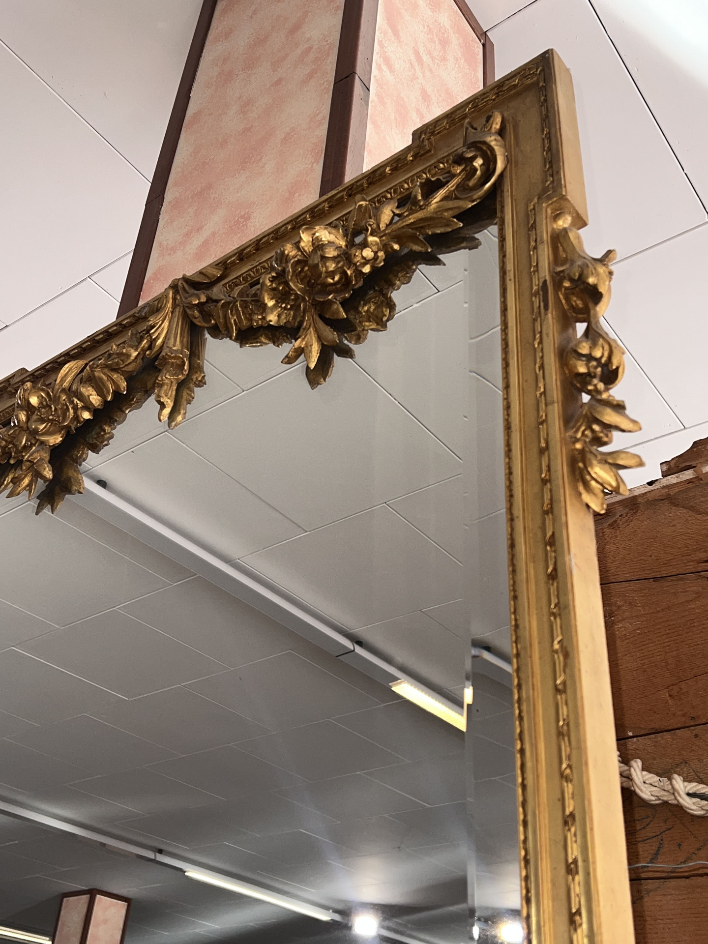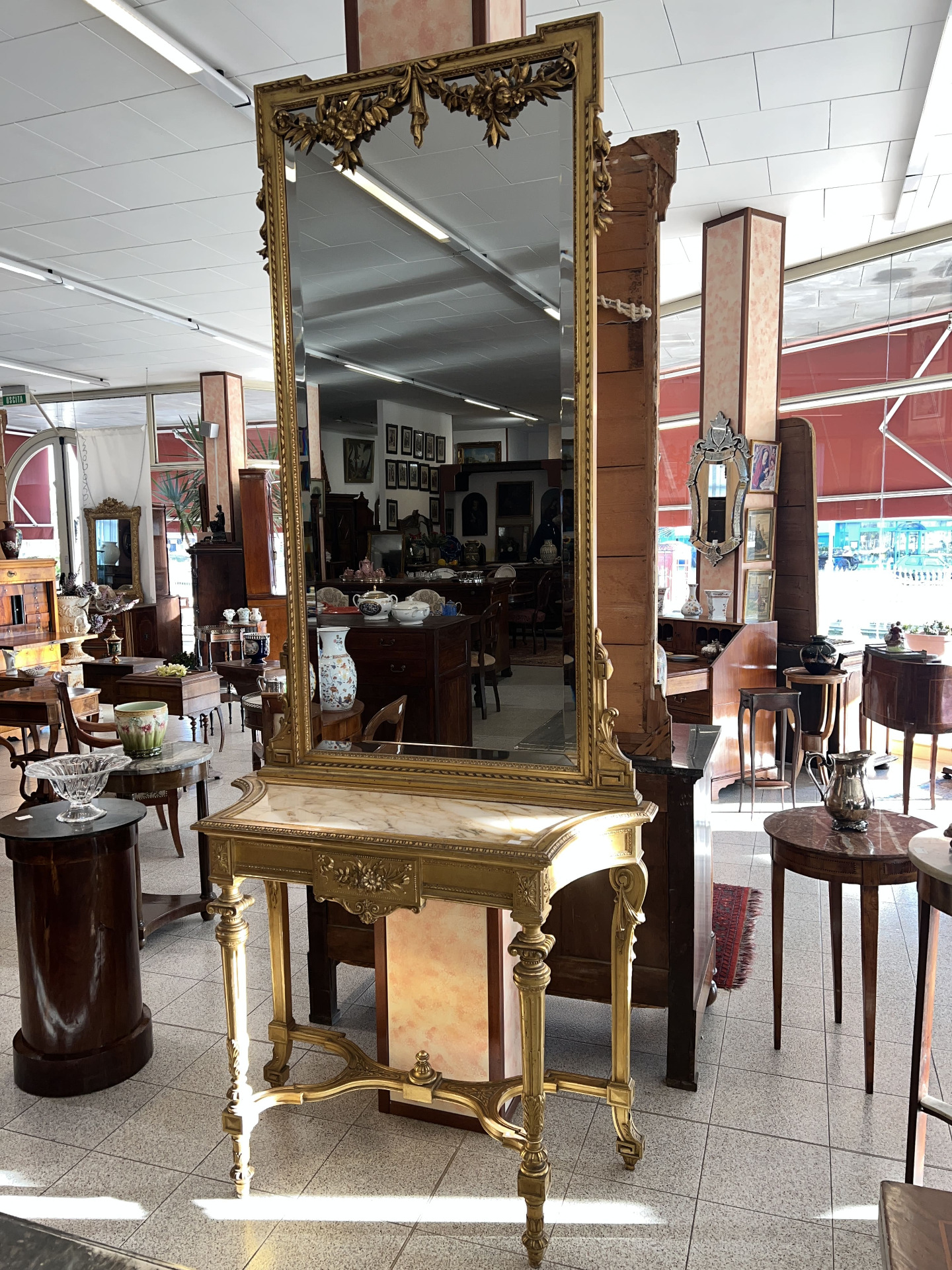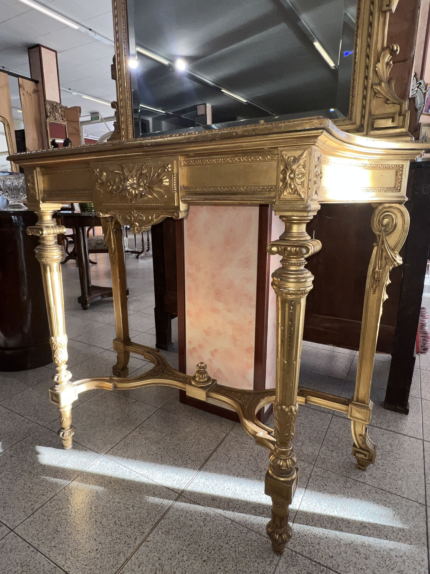 Consolle con specchiera dorata Stile Luigi XVI Epoca '800 Dimensioni: L. 114 cm, H. 270 cm, P. 50 cm. Spese di spedizione a carico cliente. Per maggiori informazioni: info@antichitadaziano.com