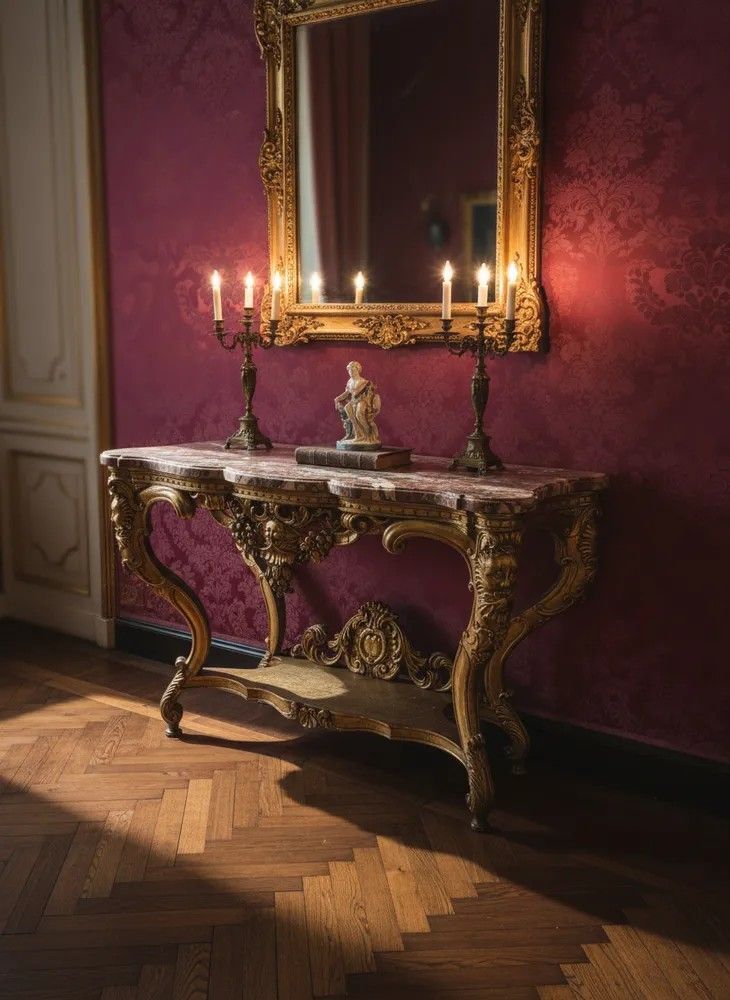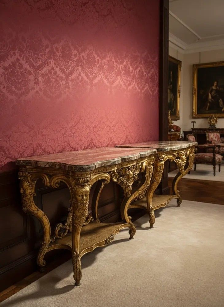 Questa coppia di consolle Luigi XV incarna lo sfarzo del Rocaille settecentesco italiano. Realizzate intorno alla metà del XVIII secolo, presentano una struttura in legno finemente intagliato e dorato a mecca, impreziosita da volute di acanto, conchiglie e mascheroni che si susseguono in un movimento fluido e teatrale. Le gambe sinuose, unite da uno stretcher sagomato, sorreggono i sontuosi piani in marmo diaspro siciliano, apprezzato per le sue venature rosse, verdi e crema che creano un effetto cromatico di grande impatto.Epoca: XVIII secolo – circa 1750Stile: Luigi XVMateriali: legno dorato, marmo diasproDimensioni: L 158 x P 48,5 x H 103 cm ciascunaLa doratura originale, con leggere usure dovute al tempo, regala una patina autentica che valorizza la profondità degli intagli. Il marmo, spesso e rifinito a becco di civetta, è in ottime condizioni senza restauri visibili.Perfette come console da ingresso, tavoli da appoggio in un salone o contro pareti rivestite di boiserie, queste consolle trasformano qualsiasi ambiente in un piccolo palazzo barocco. Possono essere completate da specchiere dorate, candelabri o sculture, come mostrano le suggestive foto ambientate.Stato di conservazione: eccellente! Marmo integro.Spedizione professionale in cassa di legno con assicurazione completa. Ulteriori dettagli e video a 360° disponibili su richiesta.Stile: Luigi XV Materiale: LegnoAltezza (cm): 103Larghezza (cm): 158Profondità (cm): 48,5Epoca: XVIII Secolo - 1700