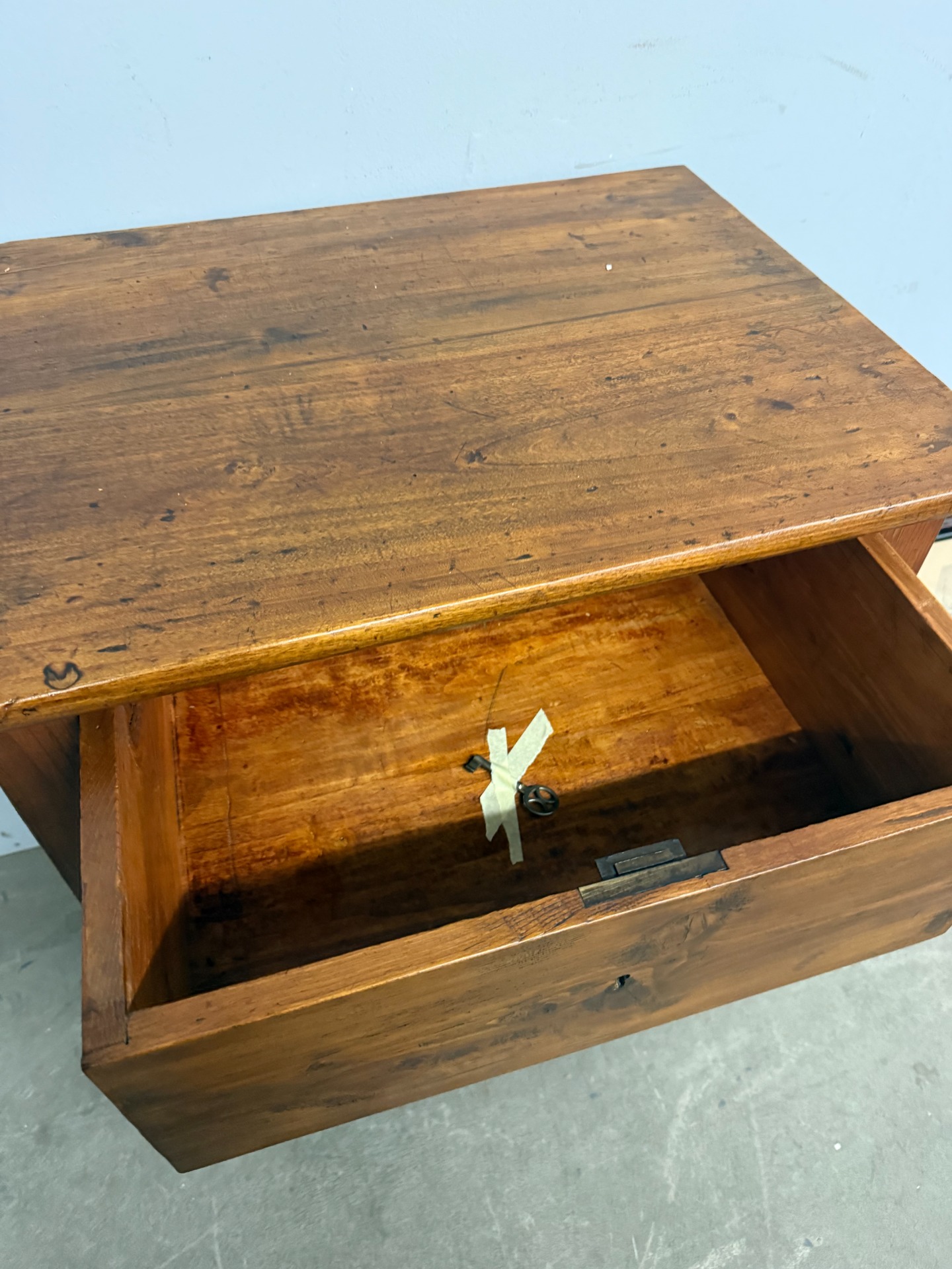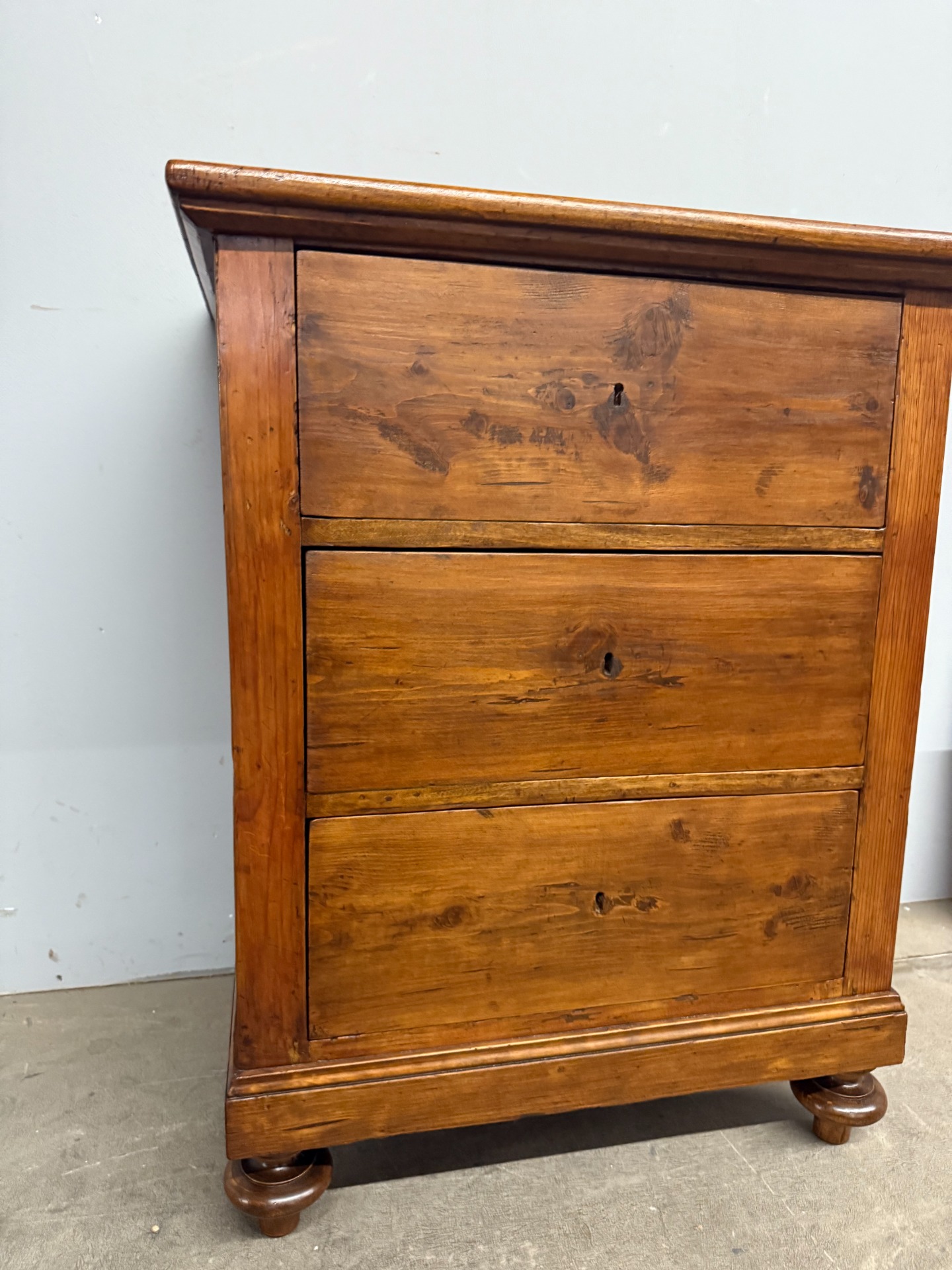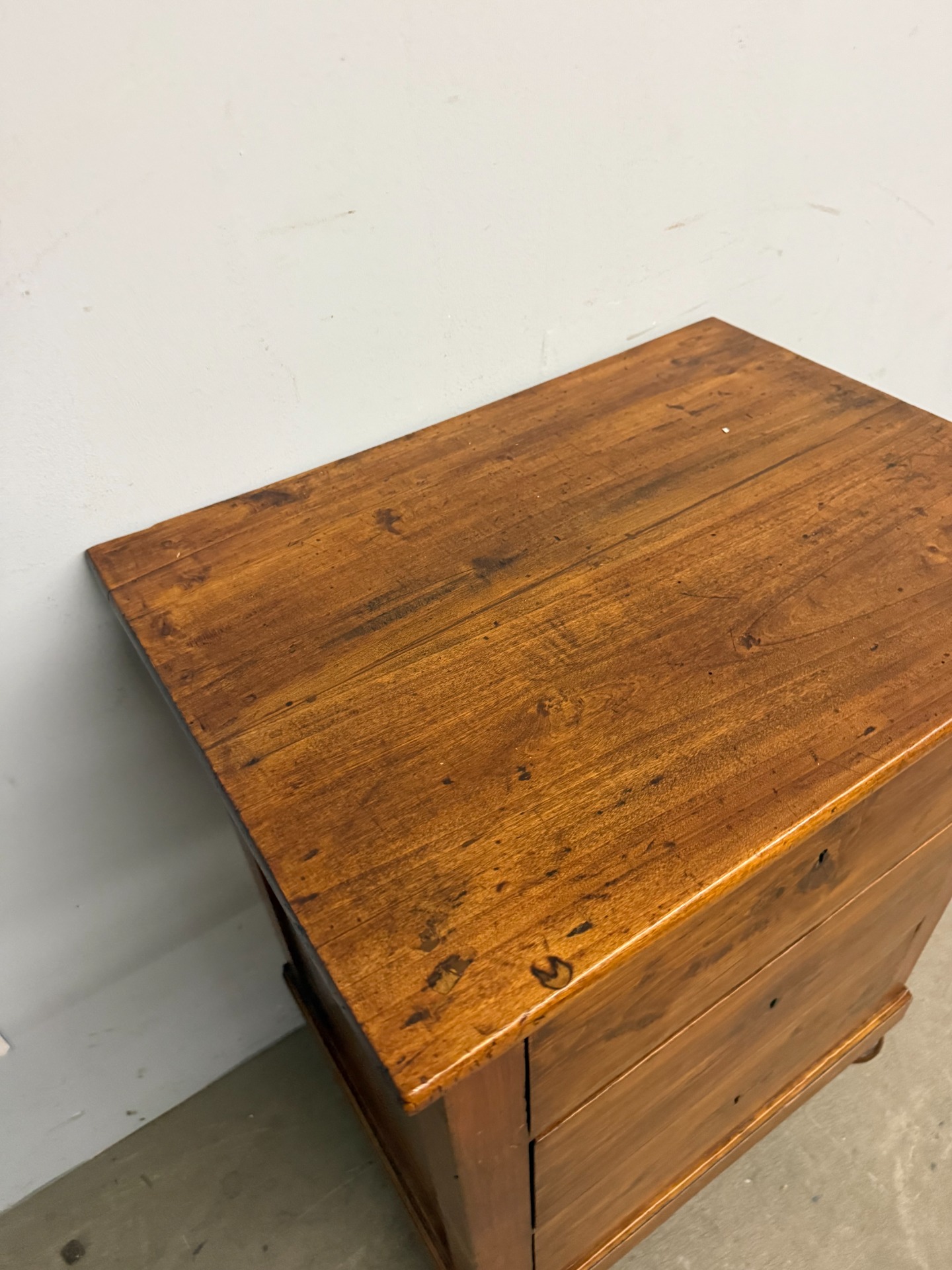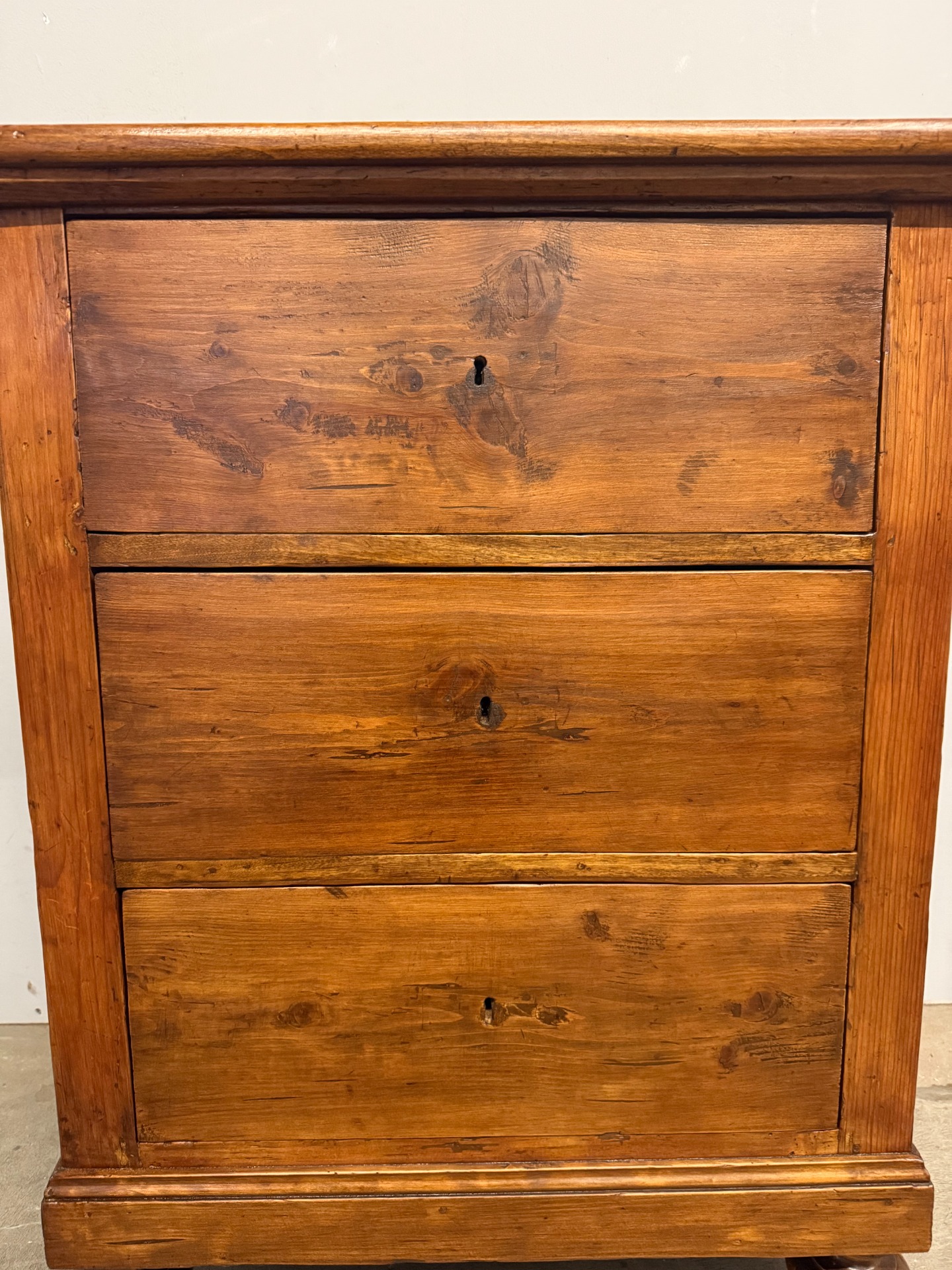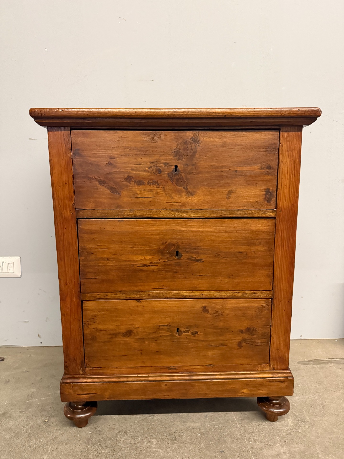 Antico mobiletto credenzino toscano tre cassetti, epoca XIX sec., mis 84x66x49cm. Arte povera, appena restaurato con finitura a cera d'api. Presente chiave.
