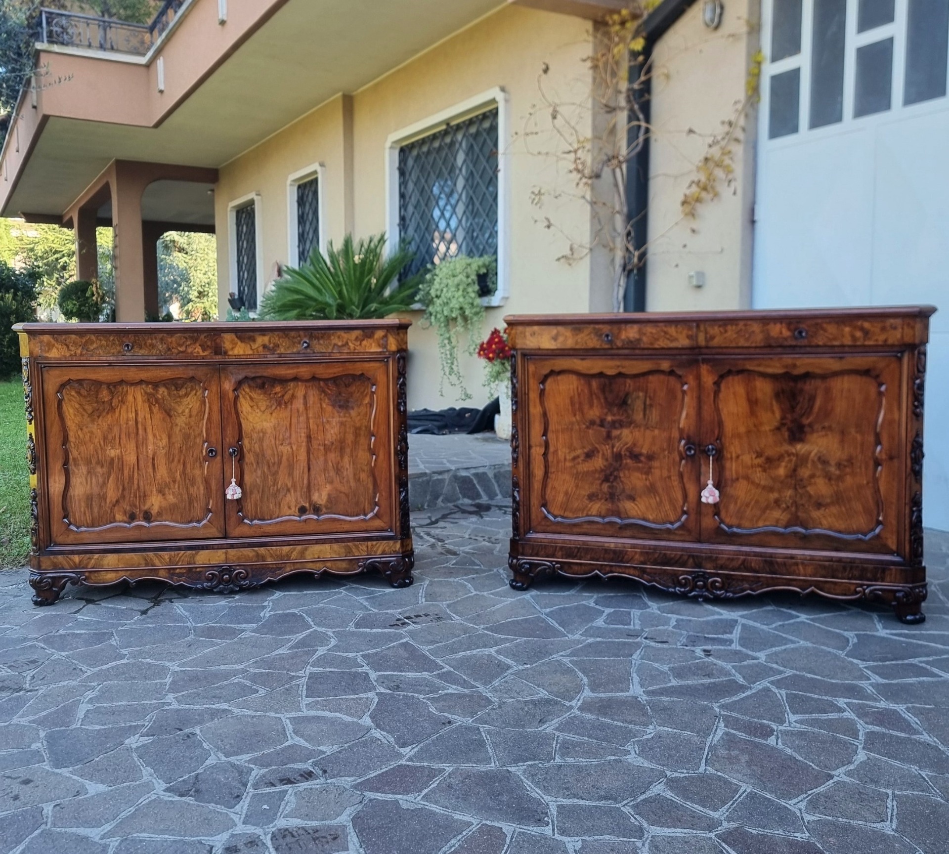 Coppia di credenze bolognesi 1830 Carlo X in radica di noce