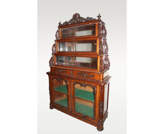 Antica credenza doppio corpo francese della prima metà del 1800, stile Luigi Filippo, in legno di mogano. Presenta corpo superiore formato da 3 ante ribalta a vetro con specchio, corpo inferiore formato da 2 cassetti e 2 ante a vetro con mensola, il tutto imprezziosito da motivi di intaglio e intaglio a traforo.