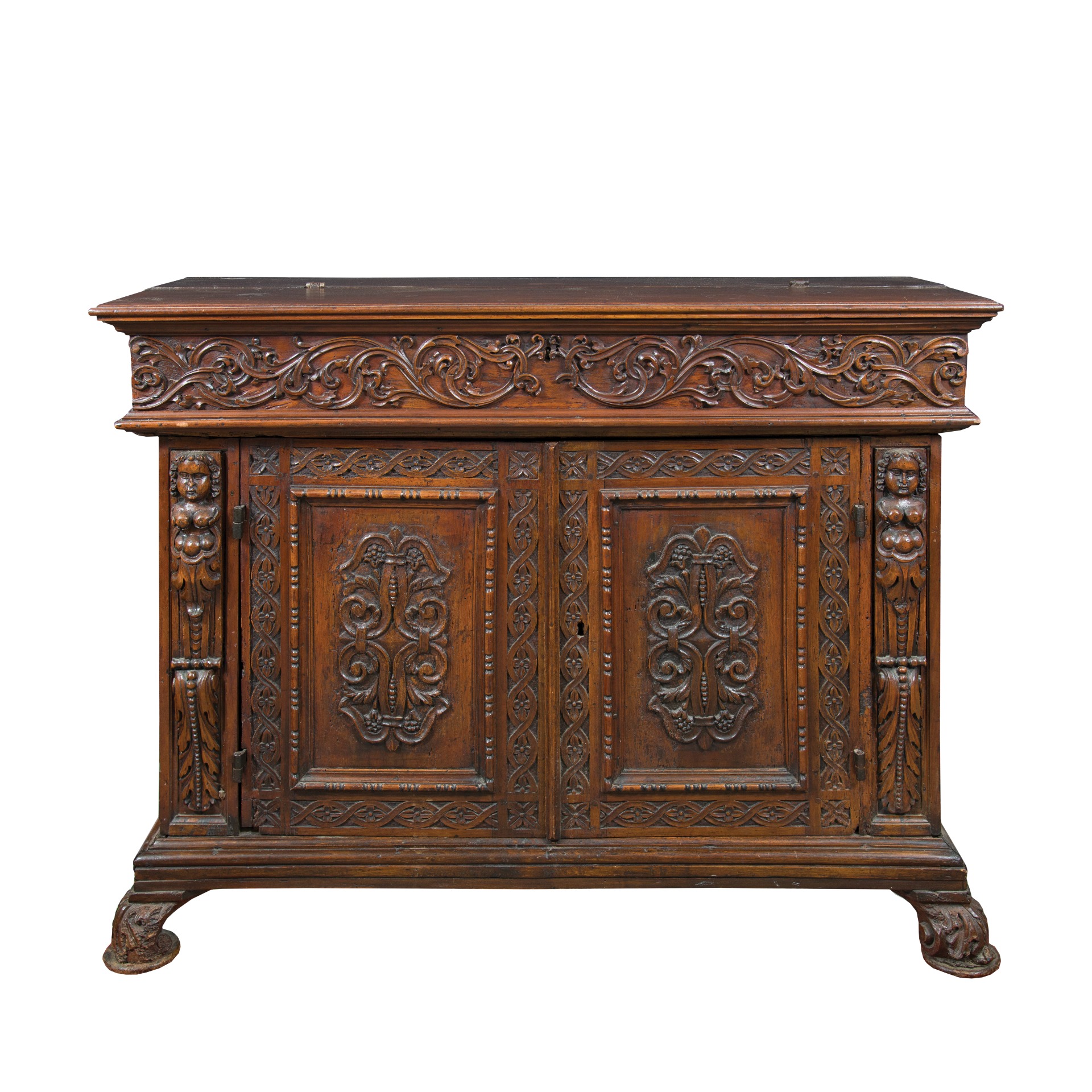 Credenza in legno intagliato. Italia, XVII secolo. 133 x 55 x h 104 cm. Realizzato interamente in legno intagliato a motivi vegetali e figure antropomorfe. Due ante centrali e calatola con serie di piccoli cassetti. - Tutte le spedizioni in UE sono gratuite ed imballate professionalmente. - Ogni articolo viene venduto con certificato di autenticità con validità legale. - Ulteriori approfondimenti sul condition report sono disponibili su richiesta. - Viezzi Arte garantisce qualità e professionalità a prezzi competitivi, contattaci su info@viezziarte.it o via What’sApp al +39 3402841279. *Messaggio rivolto agli acquirenti non italiani: Tieni presente che quest'opera non ha ancora ottenuto il certificato di libera esportazione dall'Italia presso la Soprintendenza dei Beni Culturali. Questo documento attesta che l'opera non fa parte del patrimonio culturale italiano. Normalmente i tempi di rilascio degli attestati sono 40 giorni dalla data di appuntamento: La nuova normativa in vigore dal 2021 prevede, per importi dichiarati inferiori a 13.500€, tempi più brevi a discrezione della commissione di esperti. Tutti i costi di questa operazione sono inclusi.