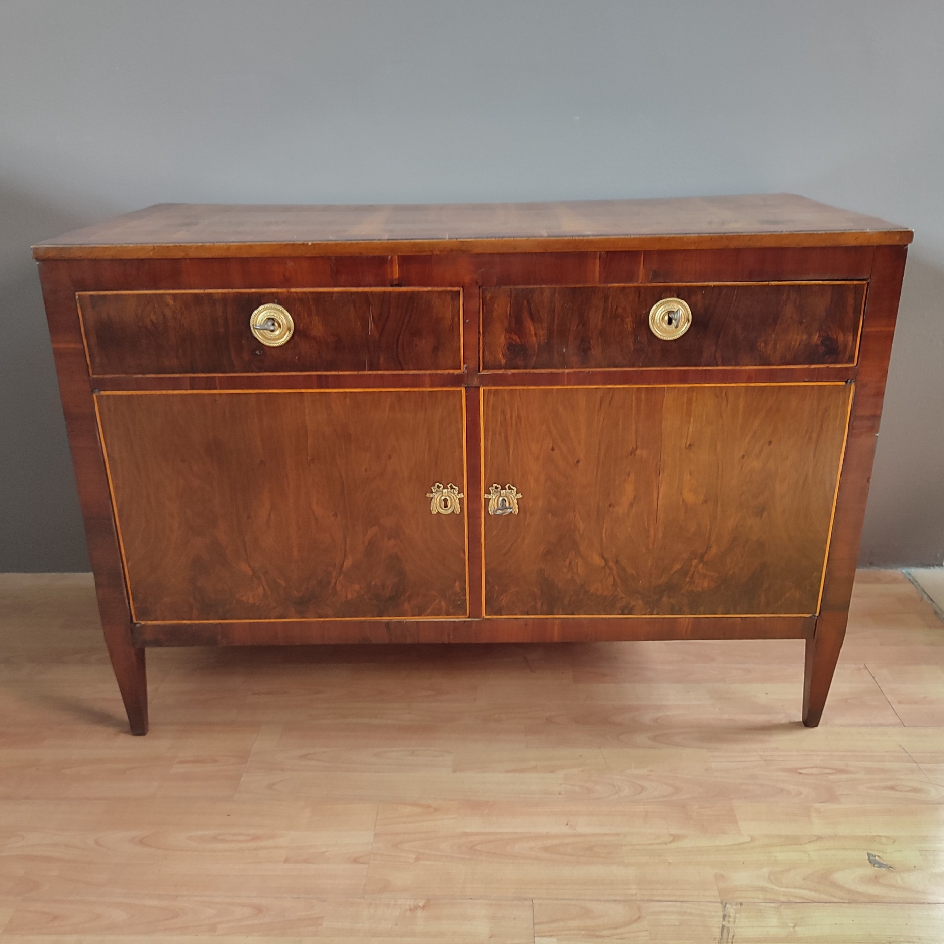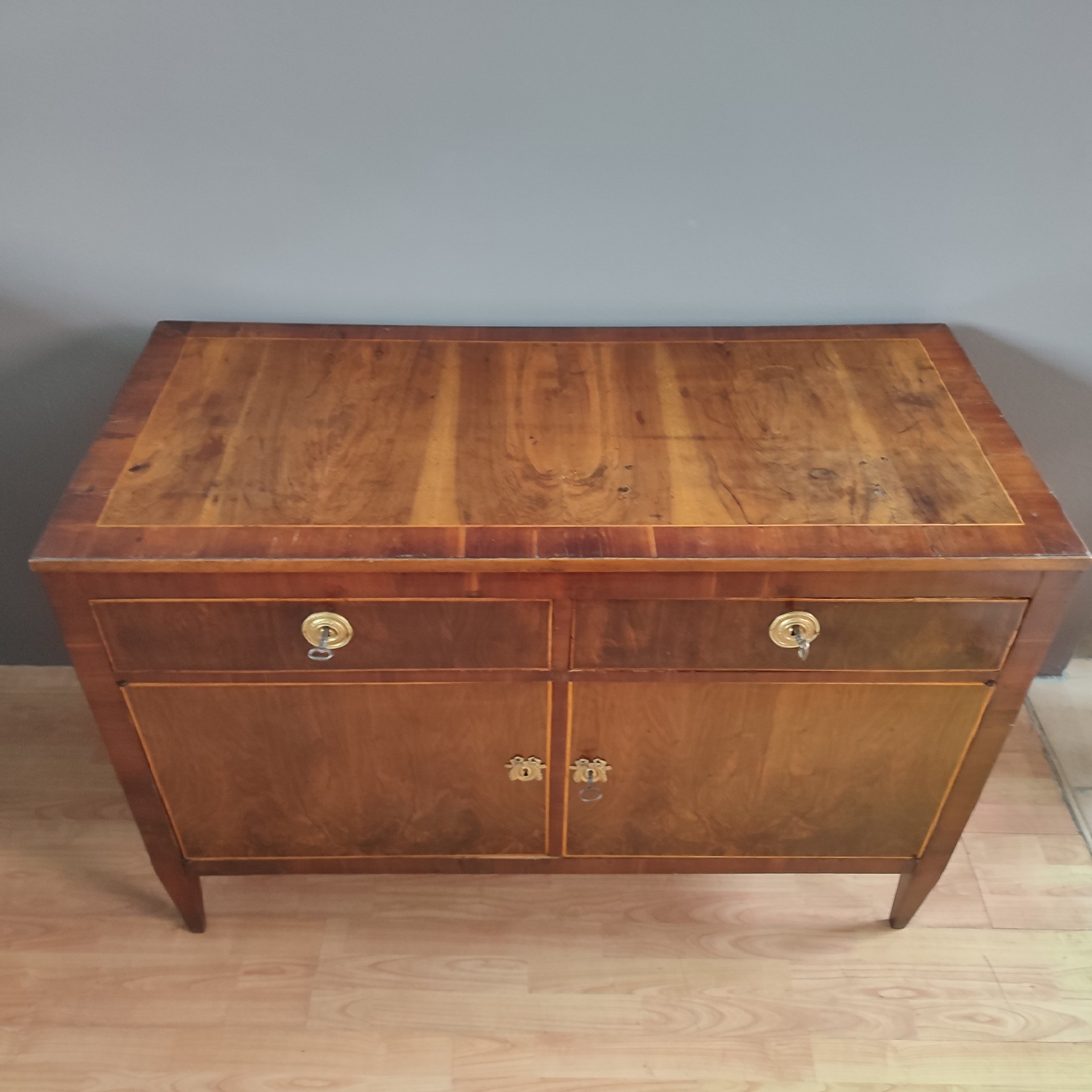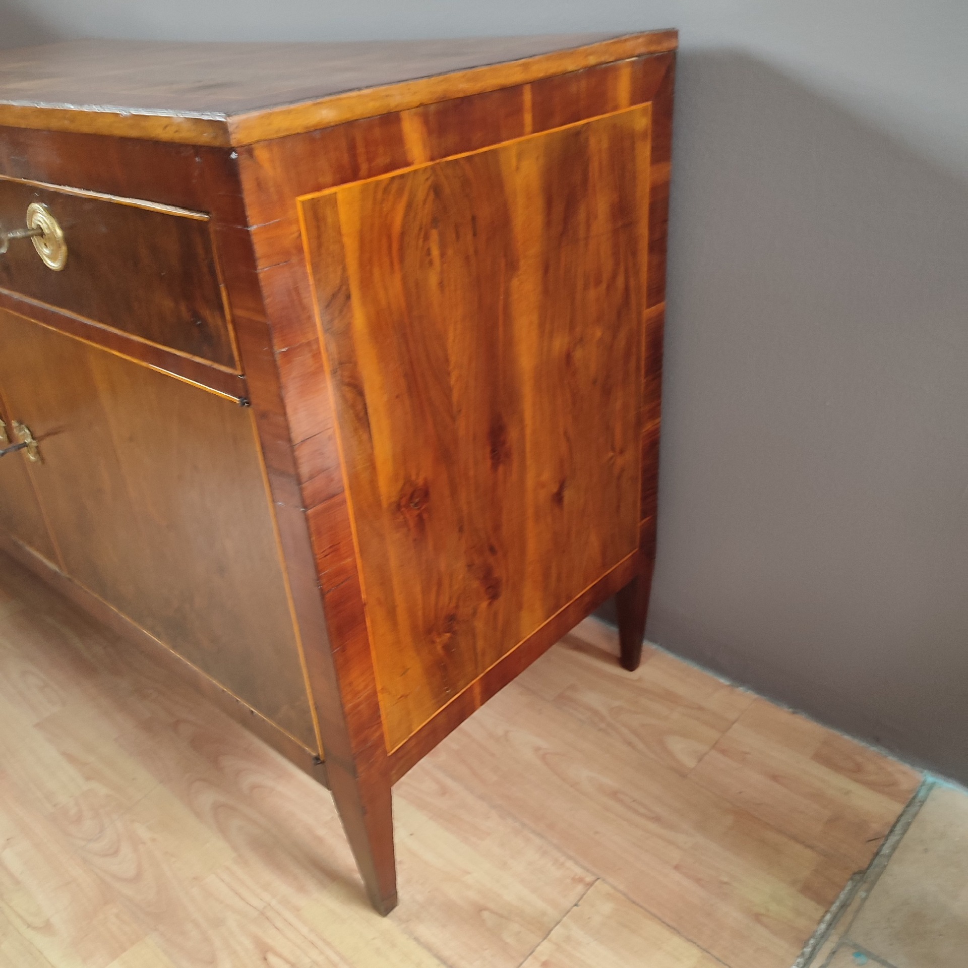 Credenza Luigi XVI in noce e ciliegio con filettatura in acero.Area veneta. Mis : L 125 P 57 H 88 Siamo a vostra disposizione per foto o domande.