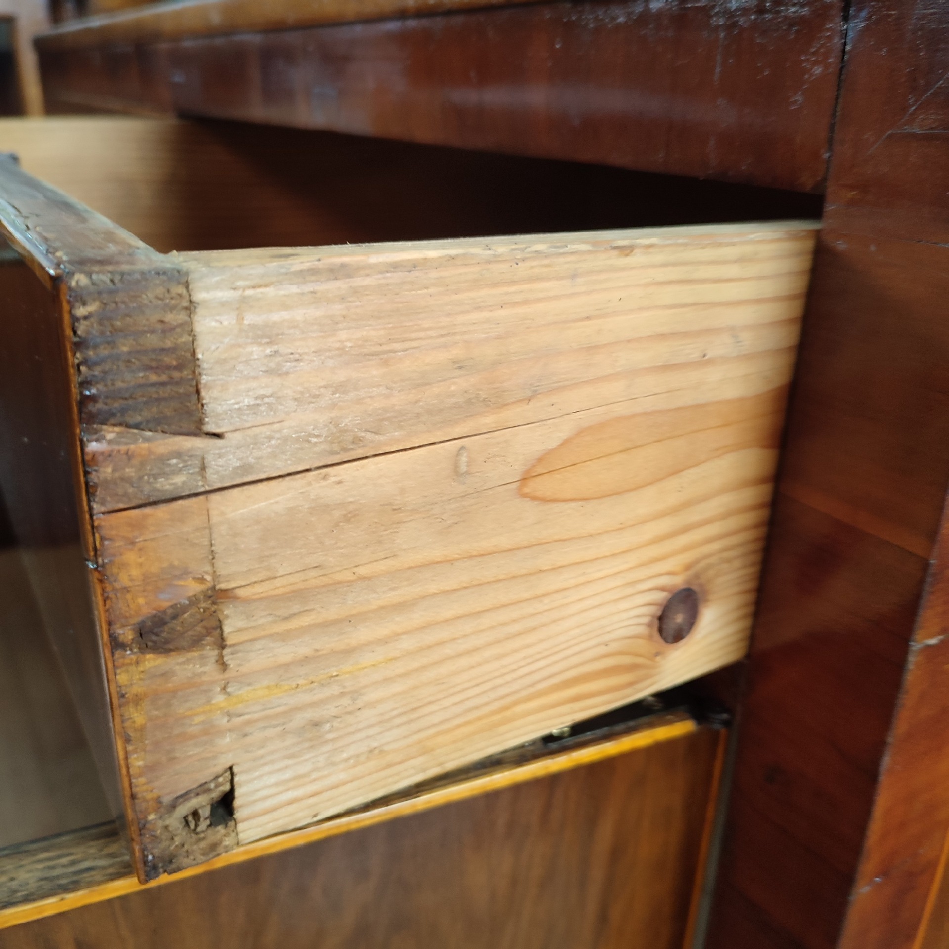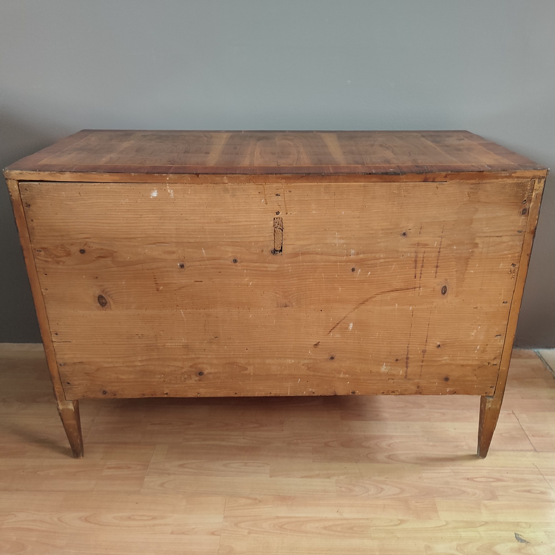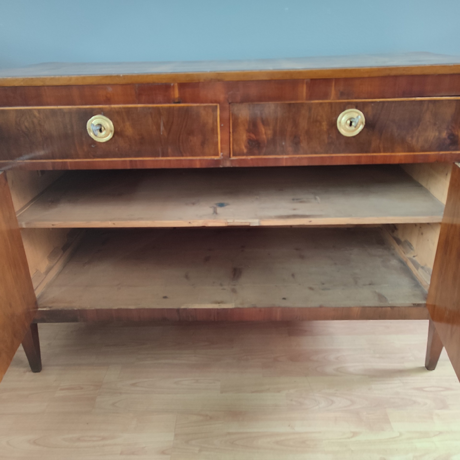 Credenza Luigi XVI in noce e ciliegio con filettatura in acero.Area veneta. Mis : L 125 P 57 H 88 Siamo a vostra disposizione per foto o domande.