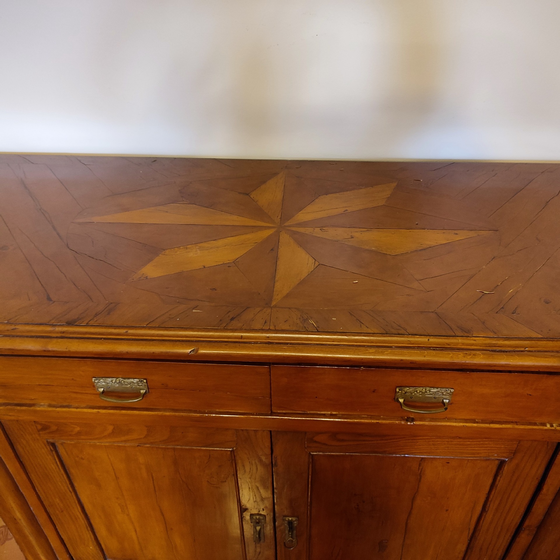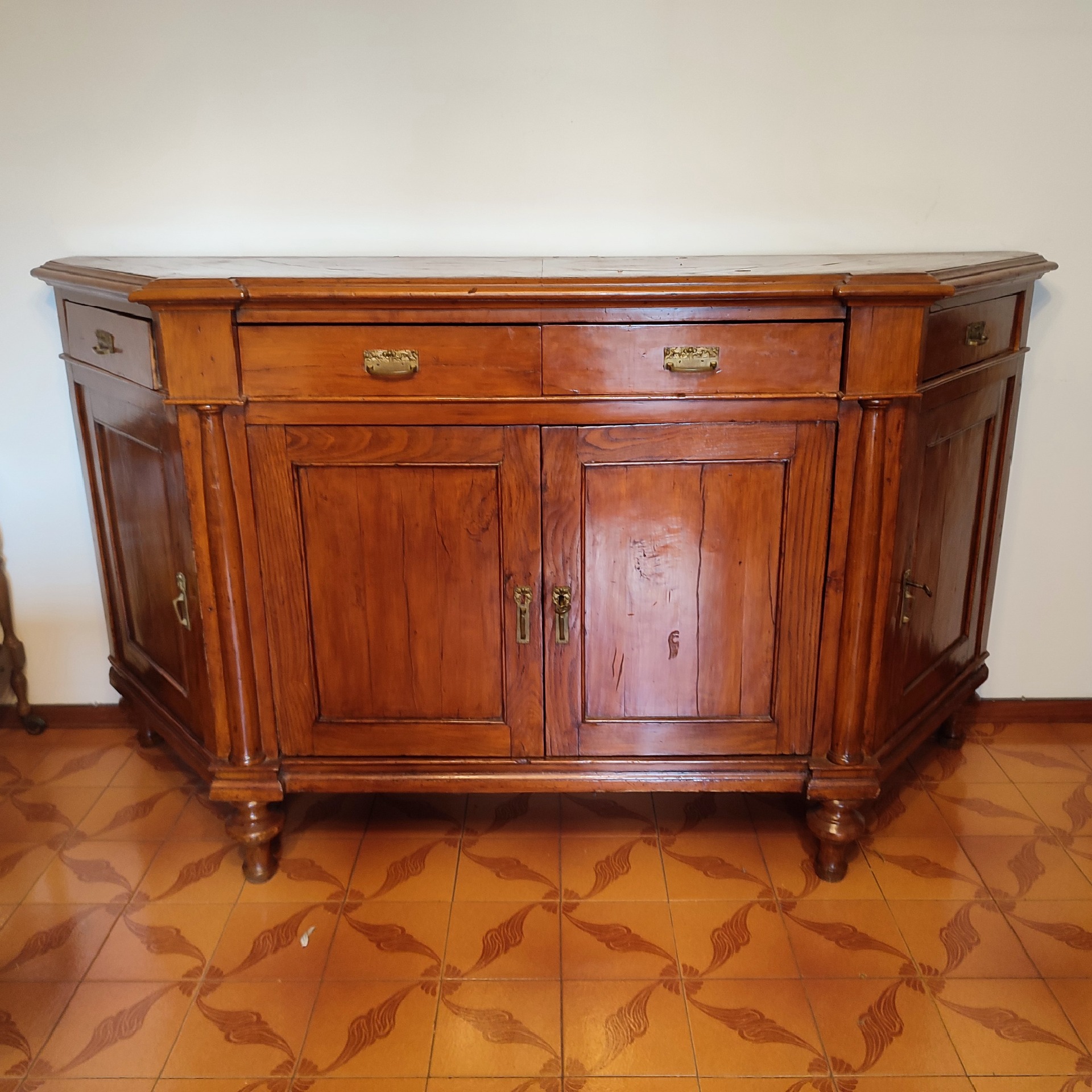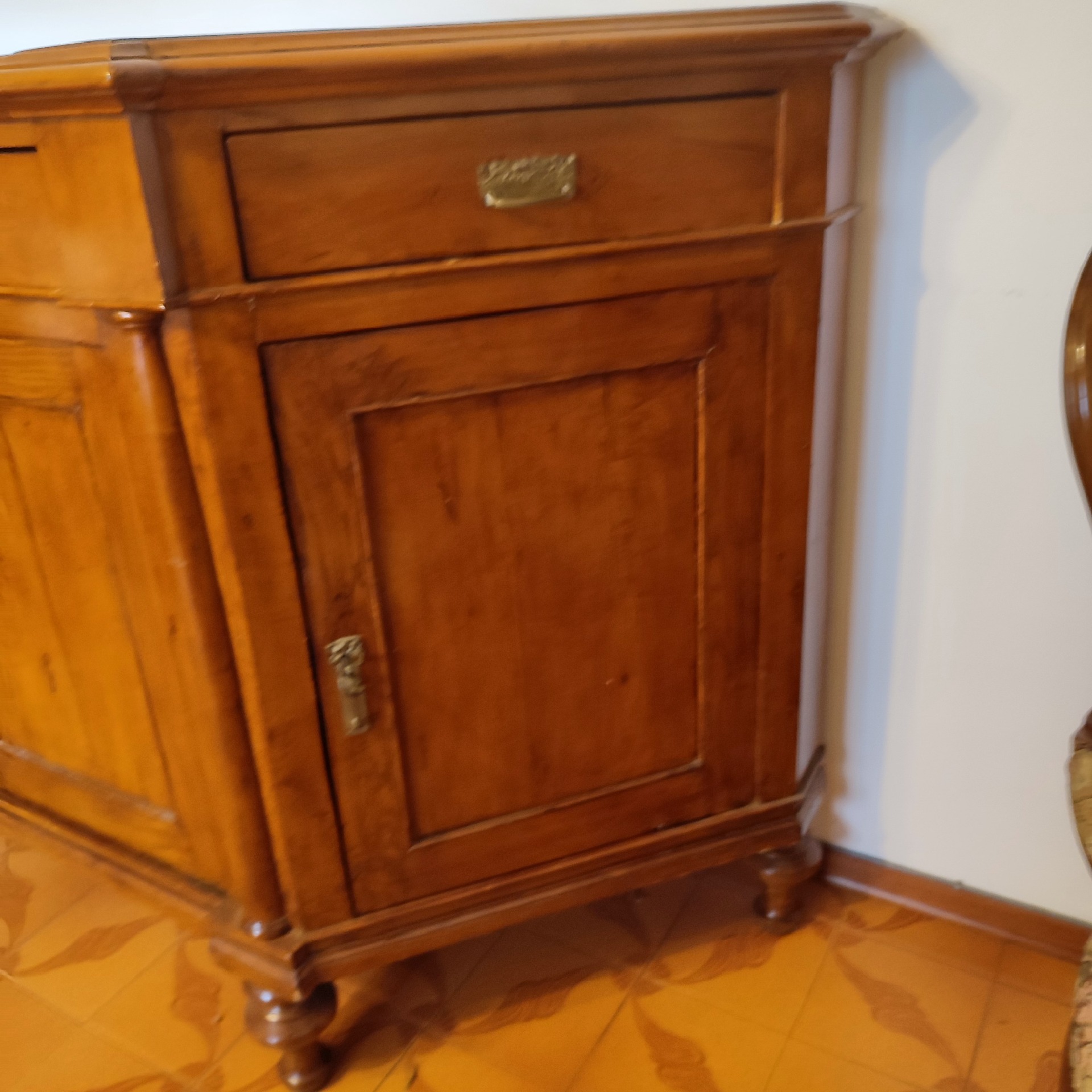 Credenza scantonata in ciliegio epoca 800. Ferramenta antica ,tenuta molto bene.Mis : L 200 H 114 P 60 Siamo a vostra disposizione per foto o domande.