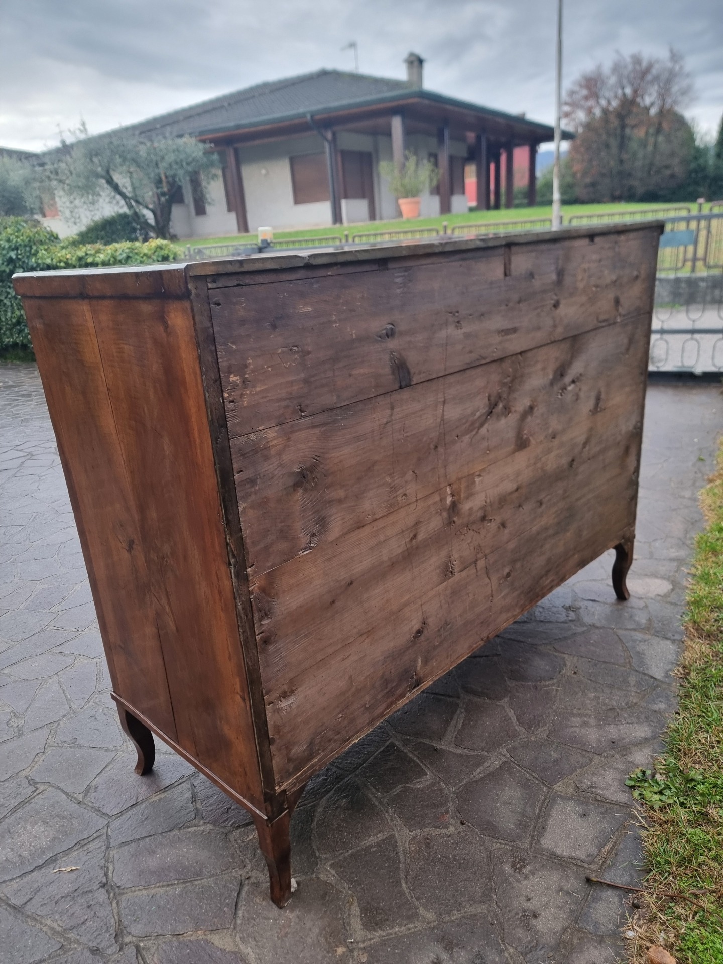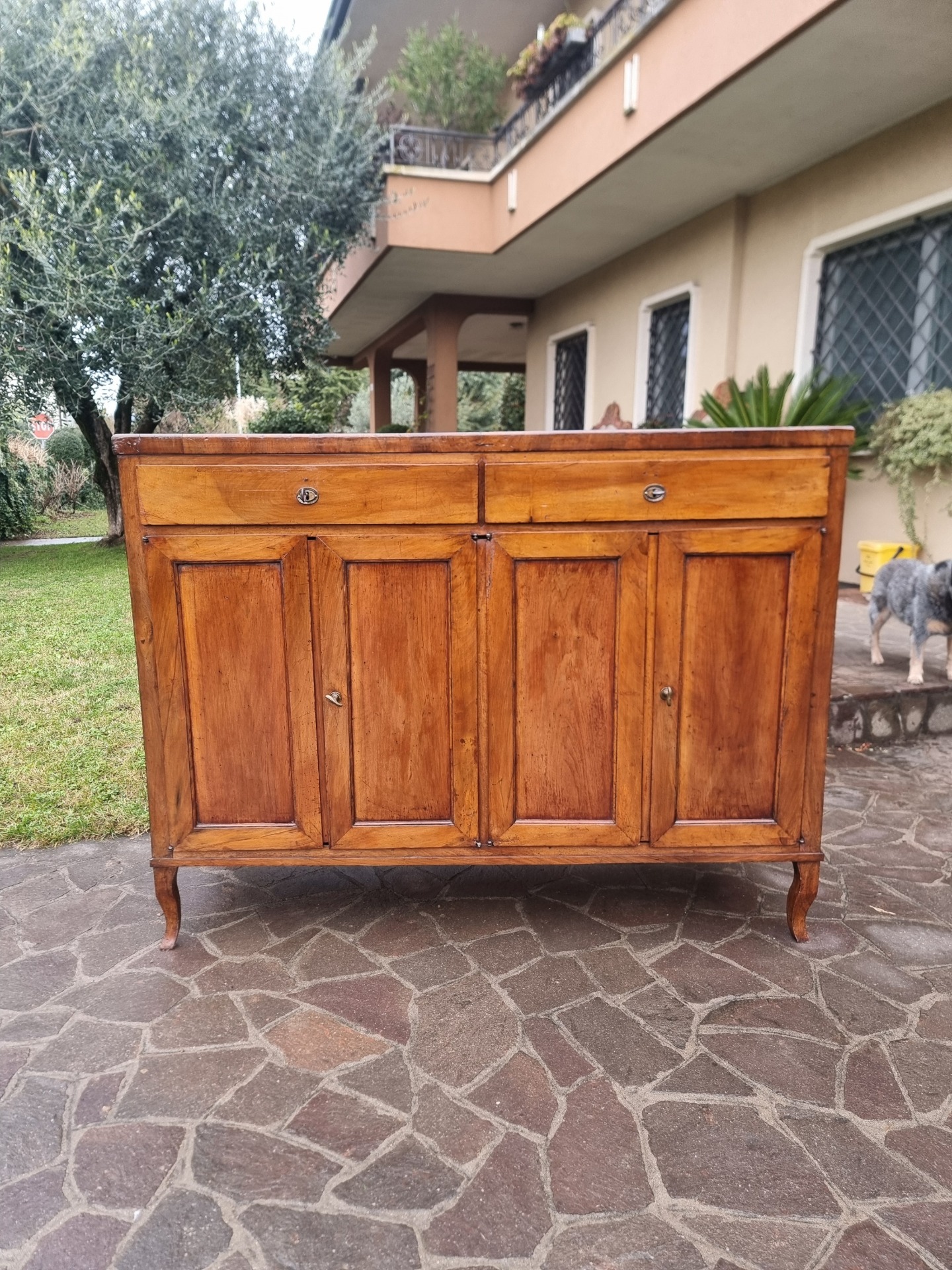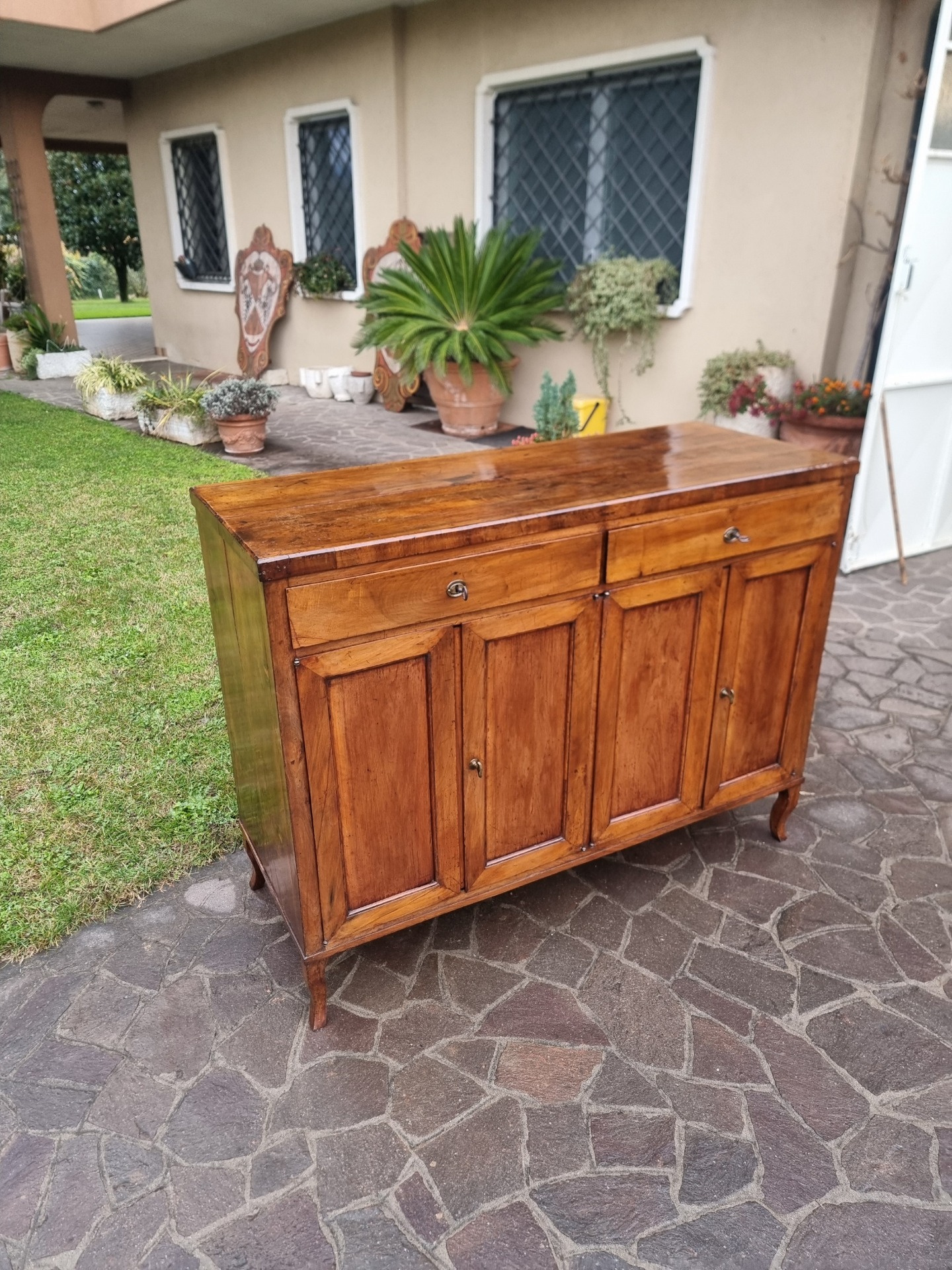 Questa credenza veneta esprime, infatti, tutto il valore del legno di noce, un materiale apprezzato da secoli per la sua robustezza, la sua venatura calda e la capacità di invecchiare con grazia. Nonostante la sua struttura imponente, la credenza mantiene un’eleganza misurata che la rende facilmente collocabile in diversi contesti. In particolare, le superfici levigate e la patina naturale donano profondità e carattere, mentre l’interno spazioso offre una funzionalità che, dunque, la rende utile oltre che bella. Pertanto, parliamo di un mobile che unisce estetica e praticità, perfettamente adatto a chi cerca un pezzo unico.