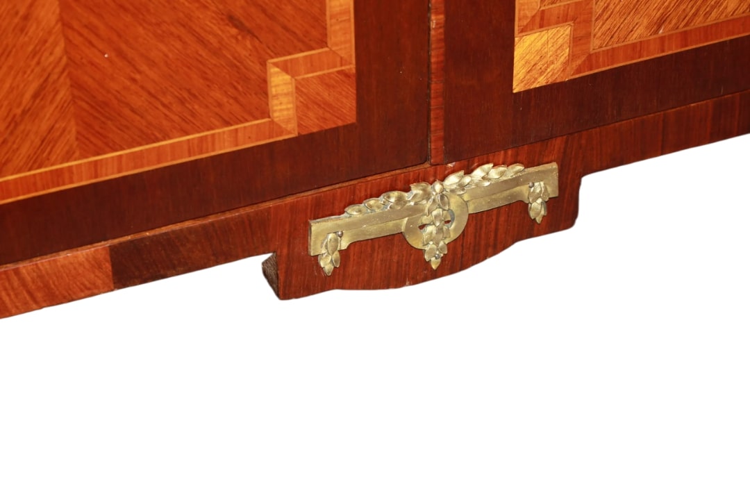 Credenzino francese della seconda metà del 1800, stile Transizione, in legno di bois de rose. Presenta piano in marmo macchia vecchia, cassetto sottopiano, 2 antine chiuse e applicazioni in bronzo.