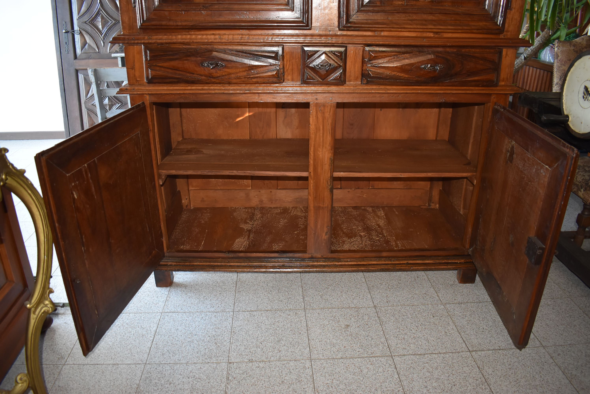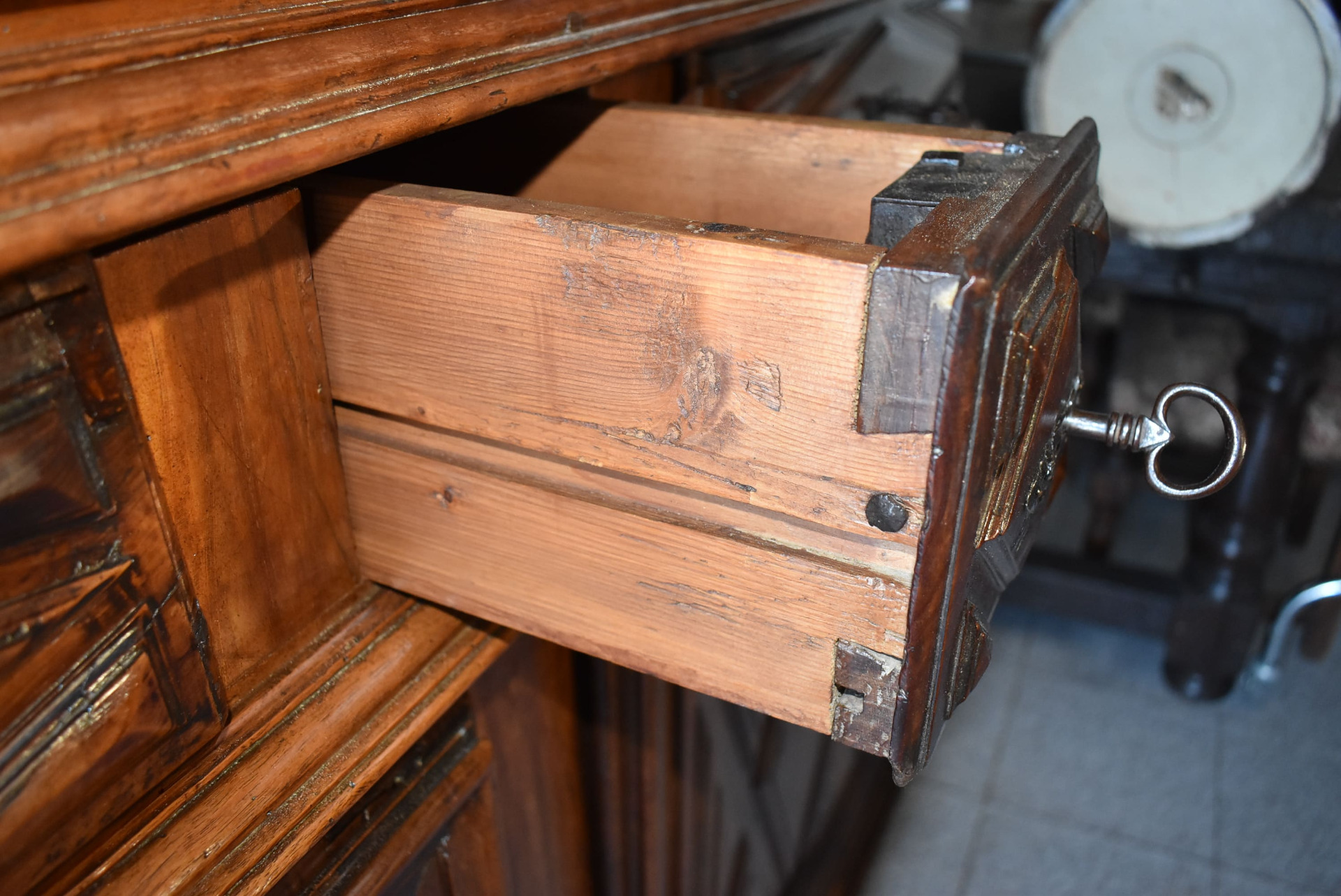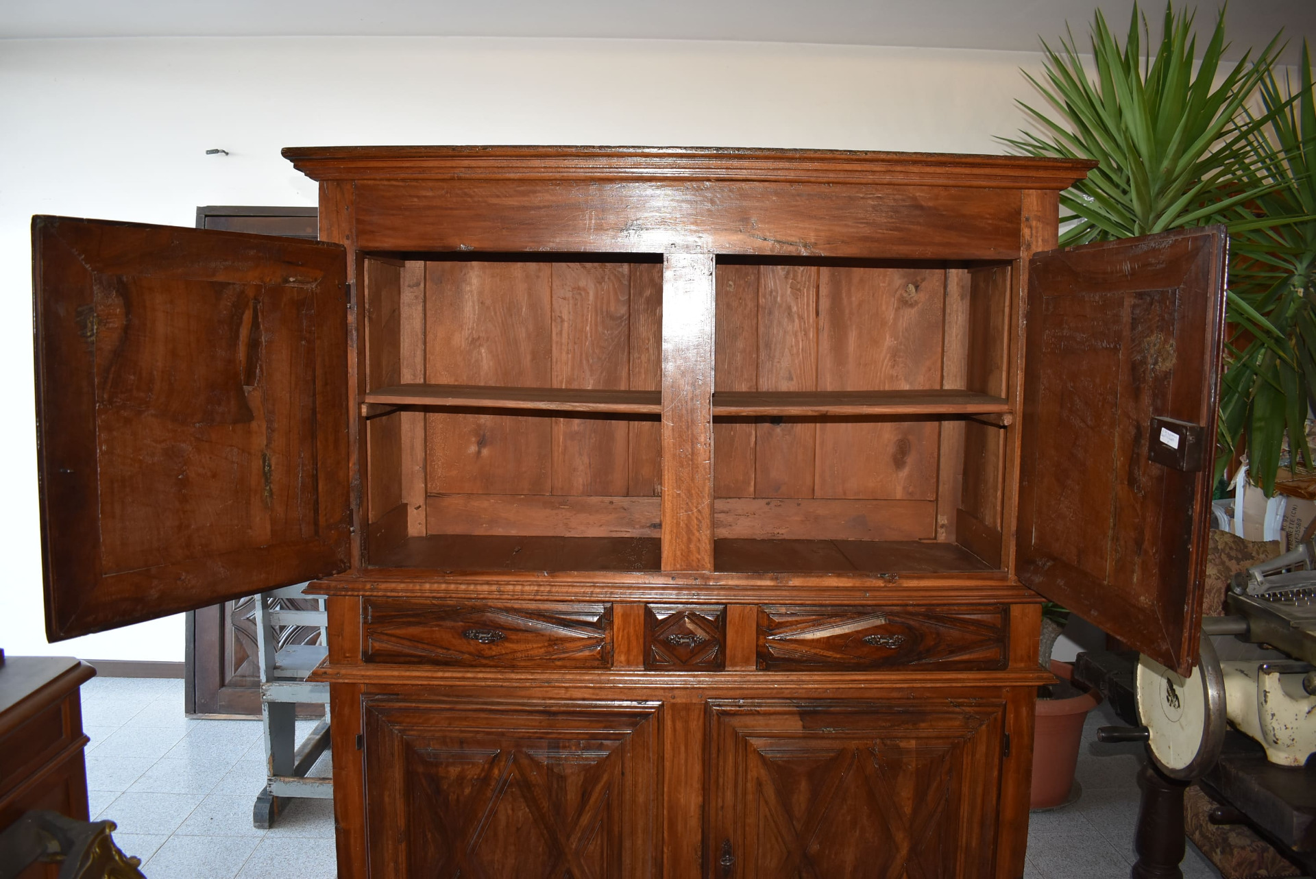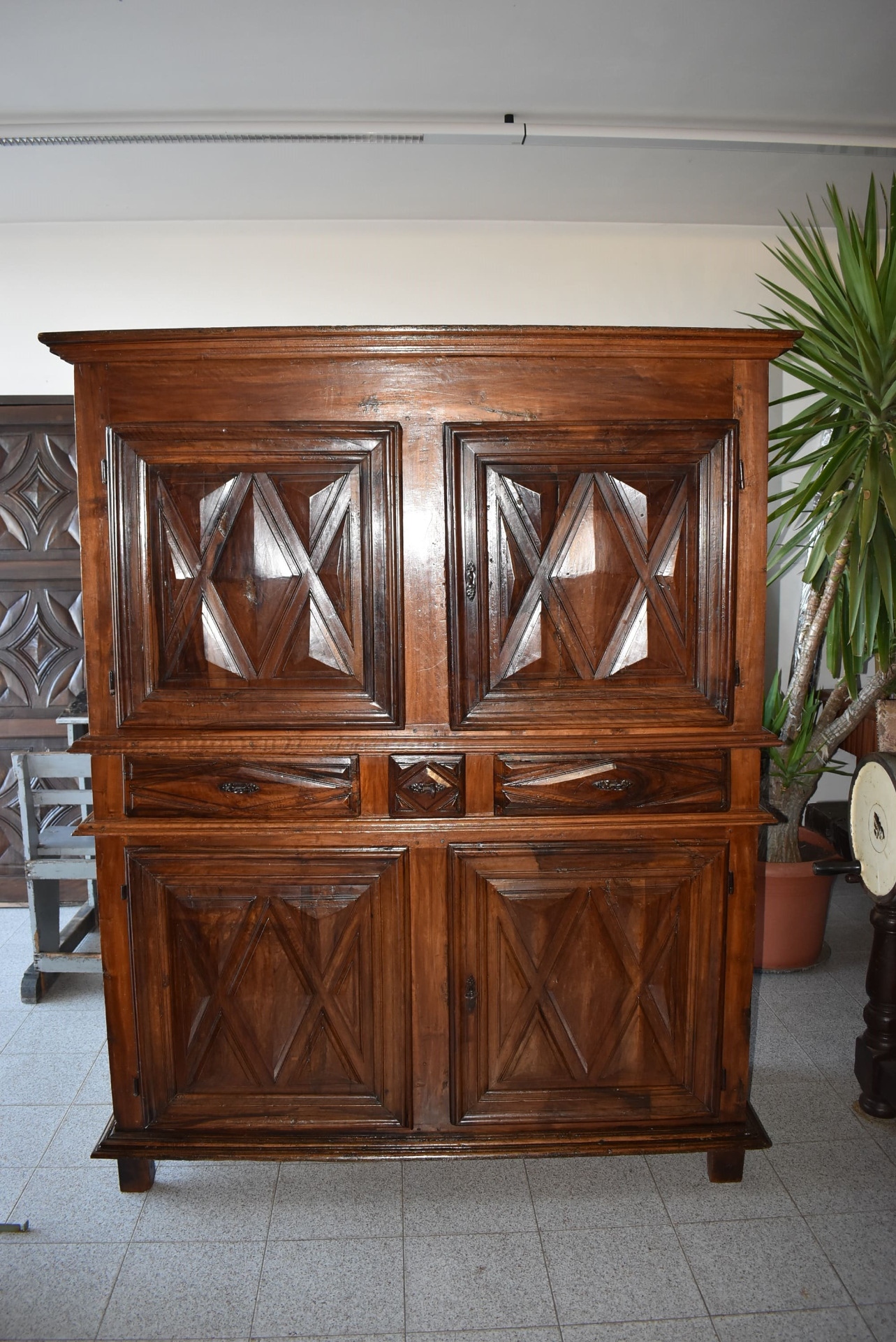 Credenza doppio corpo in noce, con tre cassetti e 4 ante a punta di diamante, serramenti originali, restaurato