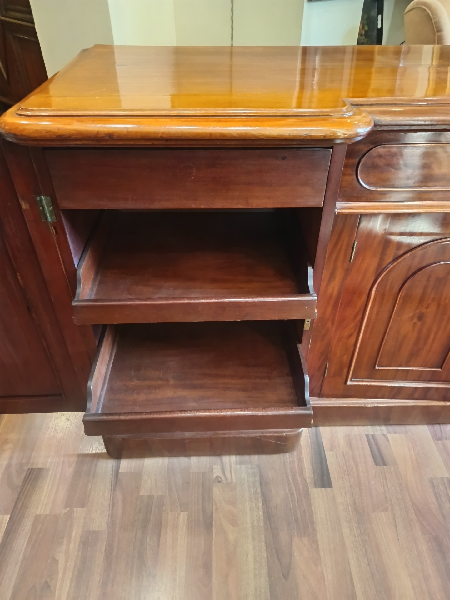 Credenza inglese in legno di mogano. Misure: cm 215 x 55 x 92 di altezza