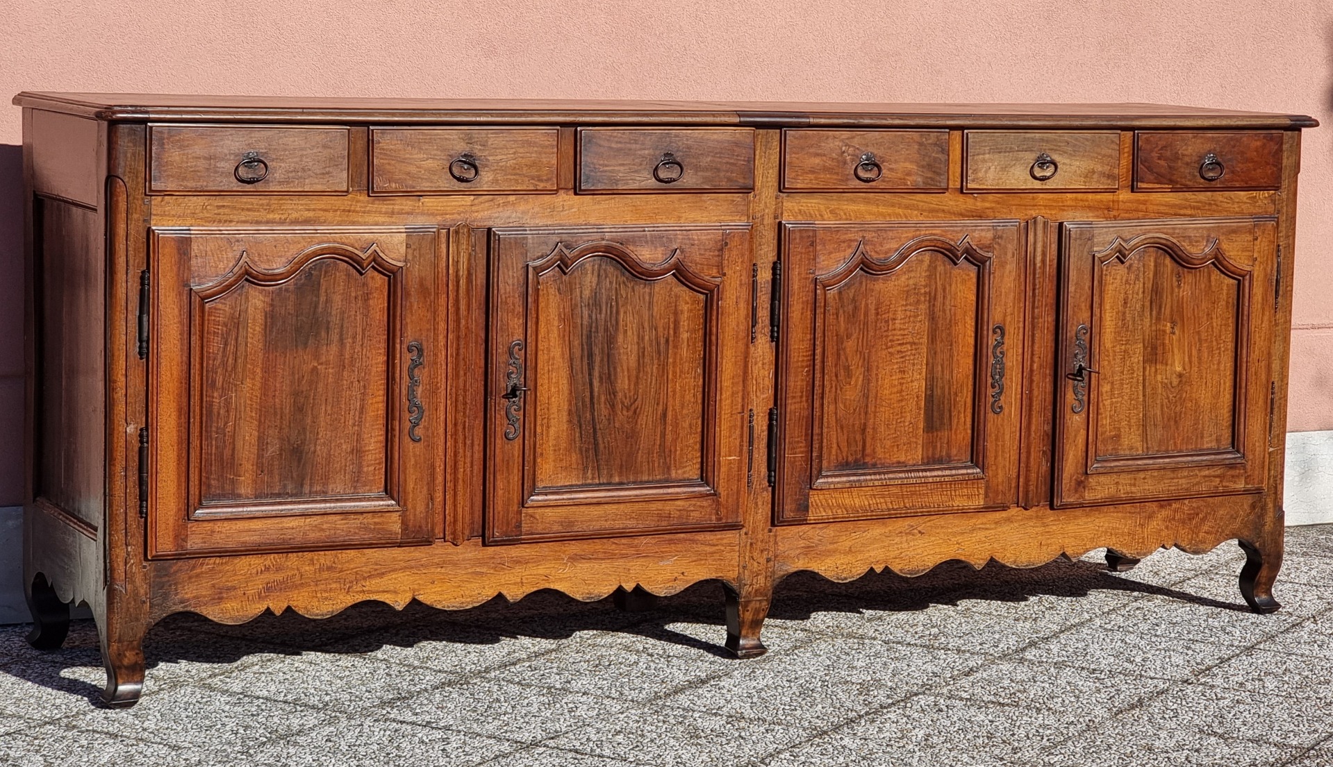 Imponente credenza in noce massello, manifattura provenzale, databile alla seconda metà del Settecento. Linea mossa di gusto Luigi XV regionale, proporzioni importanti e bella uniformità della patina. Il fronte è organizzato in quattro sportelli pannellati con profili sagomati e in sei cassetti nel registro superiore, disposti tre e tre, con maniglie ad anello in ferro lavorato. Bocchette e serrature in ferro battuto, lavorazione artigianale coeva. Grembiulina inferiore riccamente sagomata che alleggerisce l’impianto, fianchi a cornice. Interno ampio con ripiani in legno massello. Il retro evidenzia la costruzione antica con assi originali e chiodature d’epoca. Stato di conservazione:Molto buono, con patina storica ben conservata. Si segnala come unico intervento rilevante la sostituzione di tutte le gambe in epoca successiva, eseguita con attenzione all’estetica generale. Pezzo di grande presenza, adatto ad ambienti di rappresentanza, cucine d’autore e contesti country-chic che valorizzino l’autenticità del XVIII secolo provenzale. Misure:Larghezza 279 cmProfondità 64 cmAltezza 115 cm Nota finale:Per ulteriori informazioni, altre fotografie o dettagli tecnici, non esitate a contattarci. Spedizioni disponibili in tutto il mondo con imballaggio professionale.