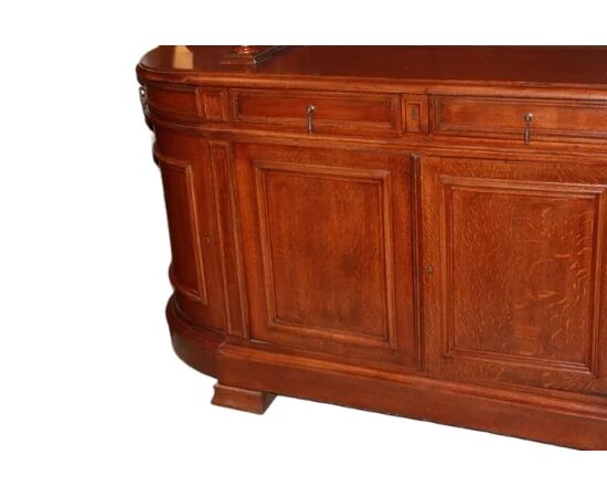 Grande credenza della seconda metà del 1800 stile Luigi Filippo francese in legno di rovere. Presenta alzata con ante a vetrina, corpo inferiore con 2 ante chiuse e 2 ante curve laterali. 2 cassetti.