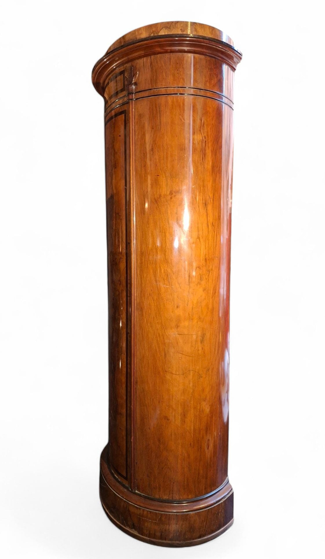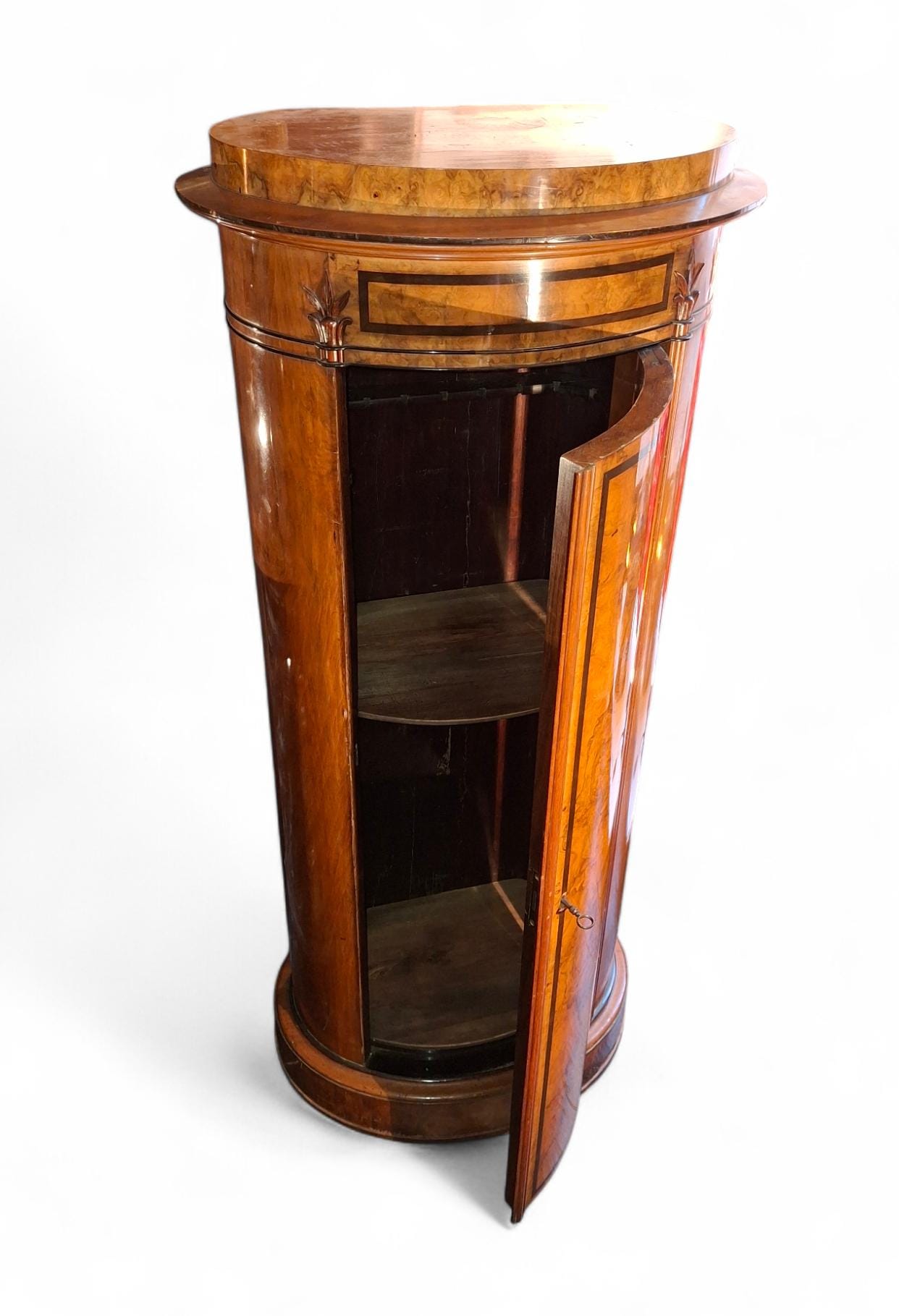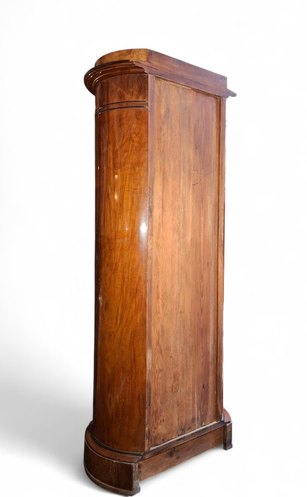 Mobile bar ovale vittoriano in radica di noce, terzo quarto del XIX secolo, unica anta cetrale con serratura funzionante, intaglie ed intarsi, altezza 144 cm, ingombro massimo 60x35 cm.