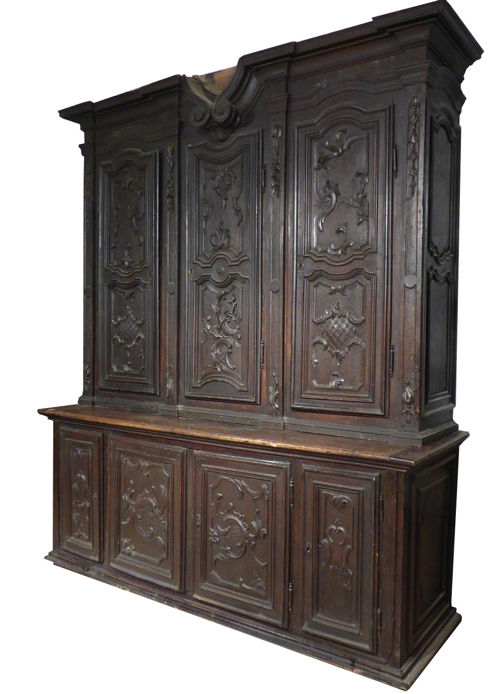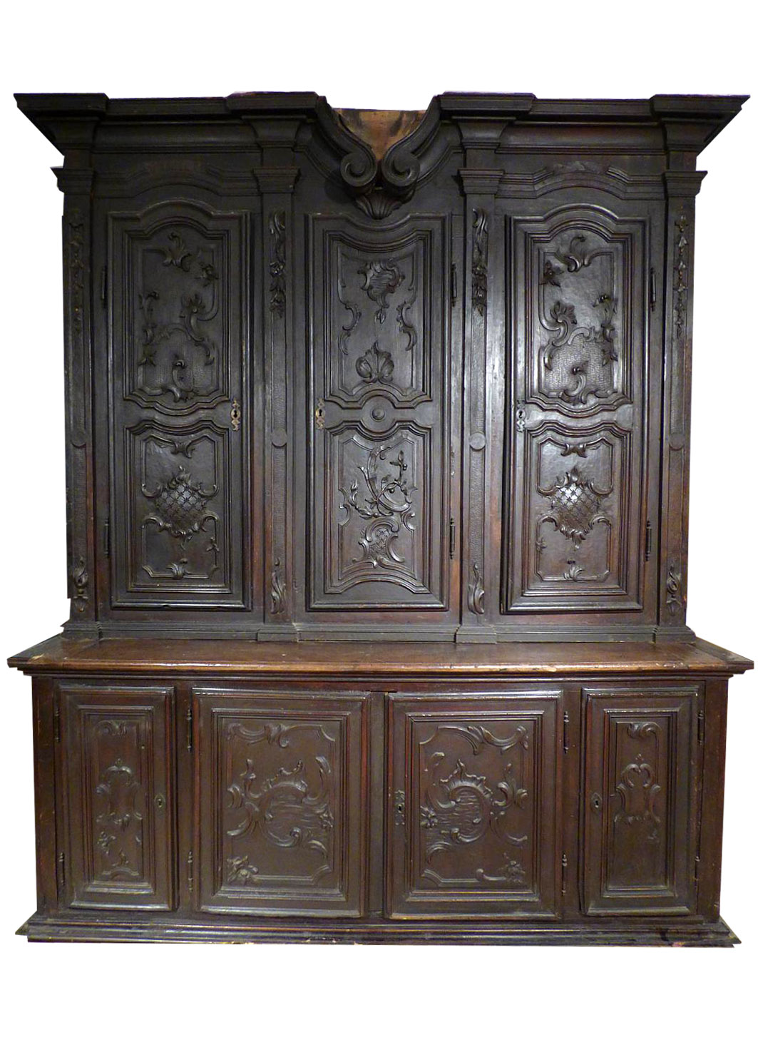 La parte inferiore si compone di quattro sportelli: i laterali sono di dimensioni inferiori e gli intagli che decorano tutti gli sportelli sono speculari tra loro.