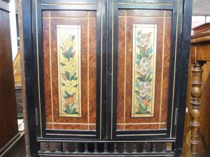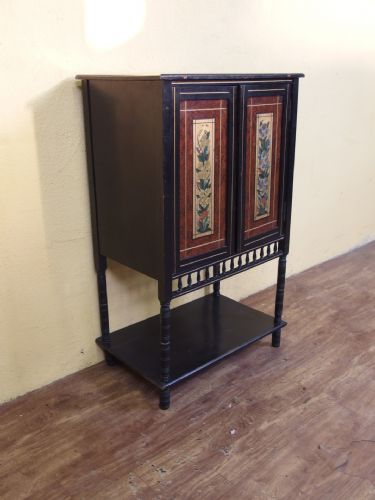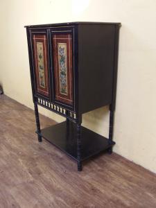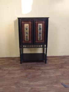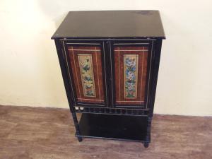 Bellissimo credenzino a due porte laccato nero di piccole dimensioni con pitture due porte, di stile orientale.Il mobiletto è completamente originale necessita solo di pulizia generale(VEDI FOTO)