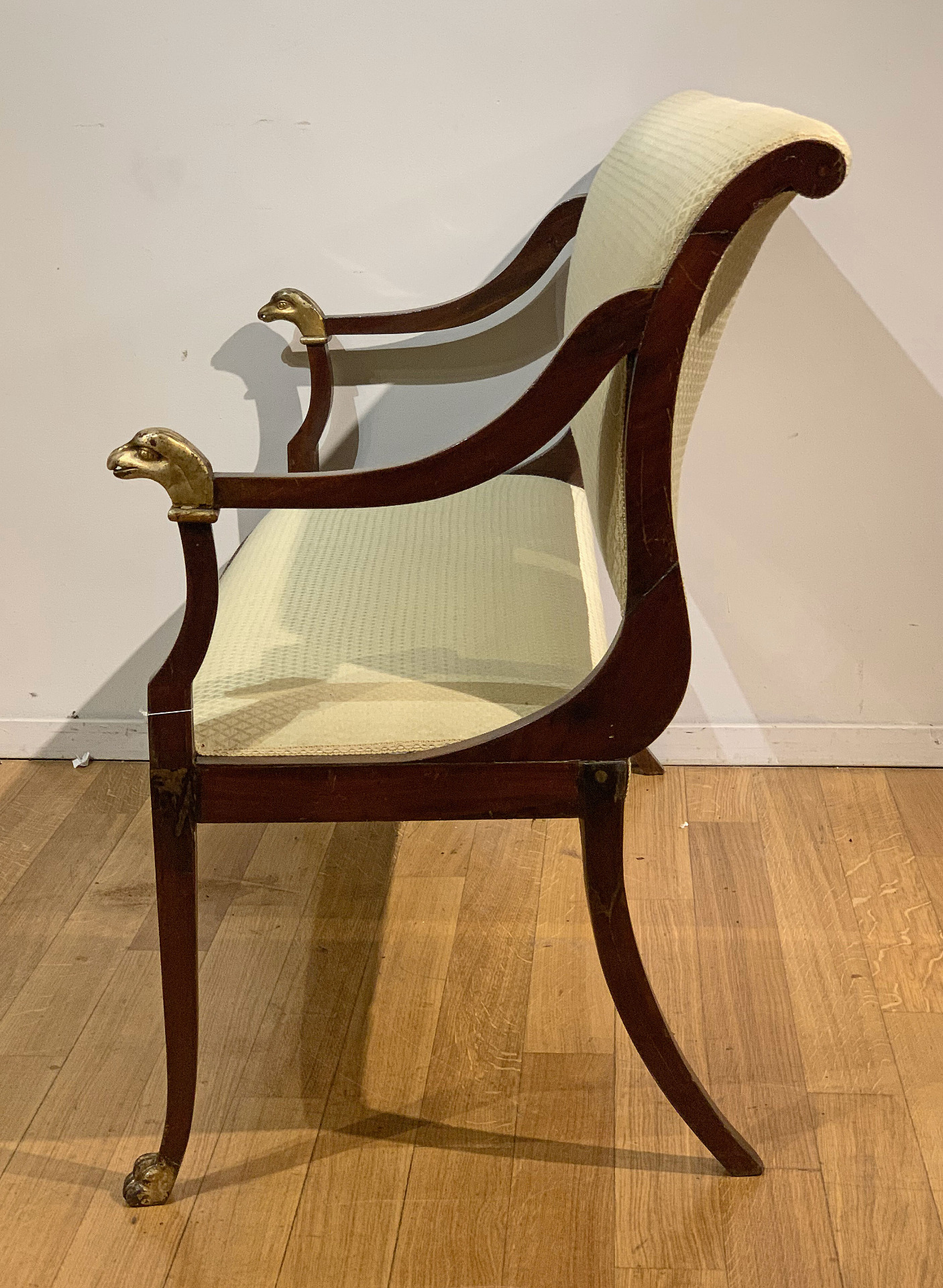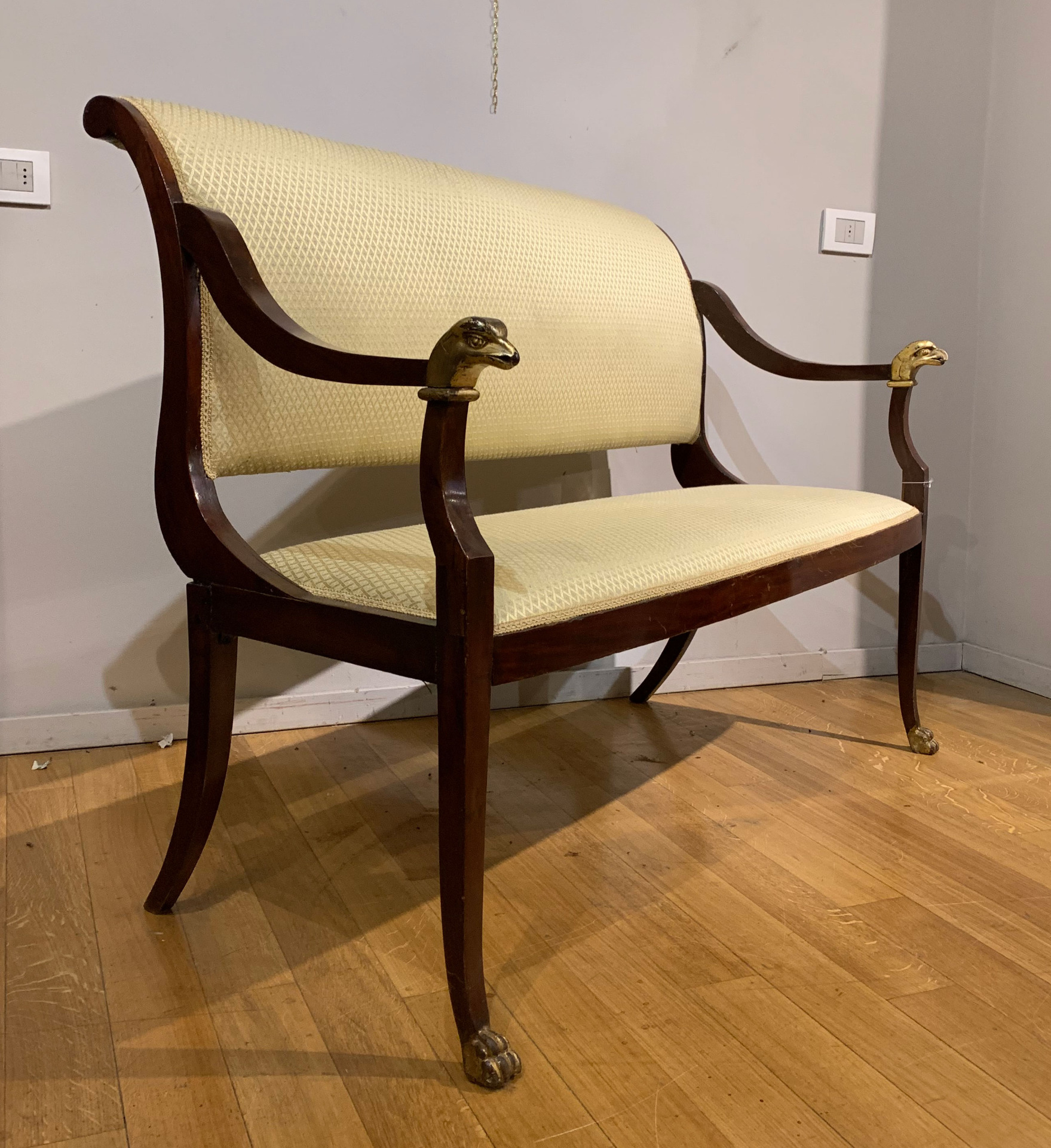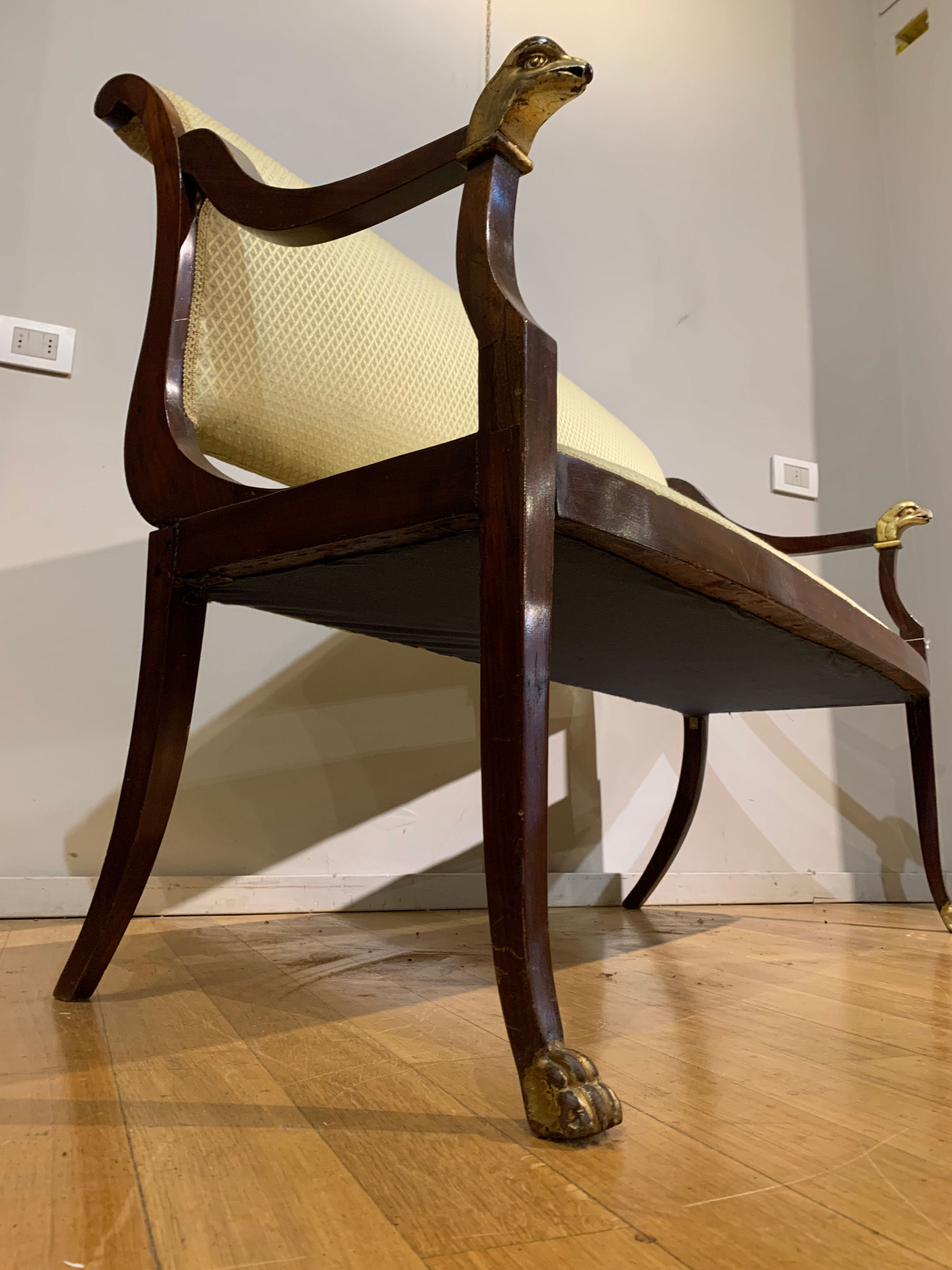 Elegante divanetto direttorio in massello di mogano con quattro gambe a sciabola e braccioli ricurvi con piedi ferini e finali in legno intagliato e dorato a oro zecchino realizzati a forma di testa di acquila.