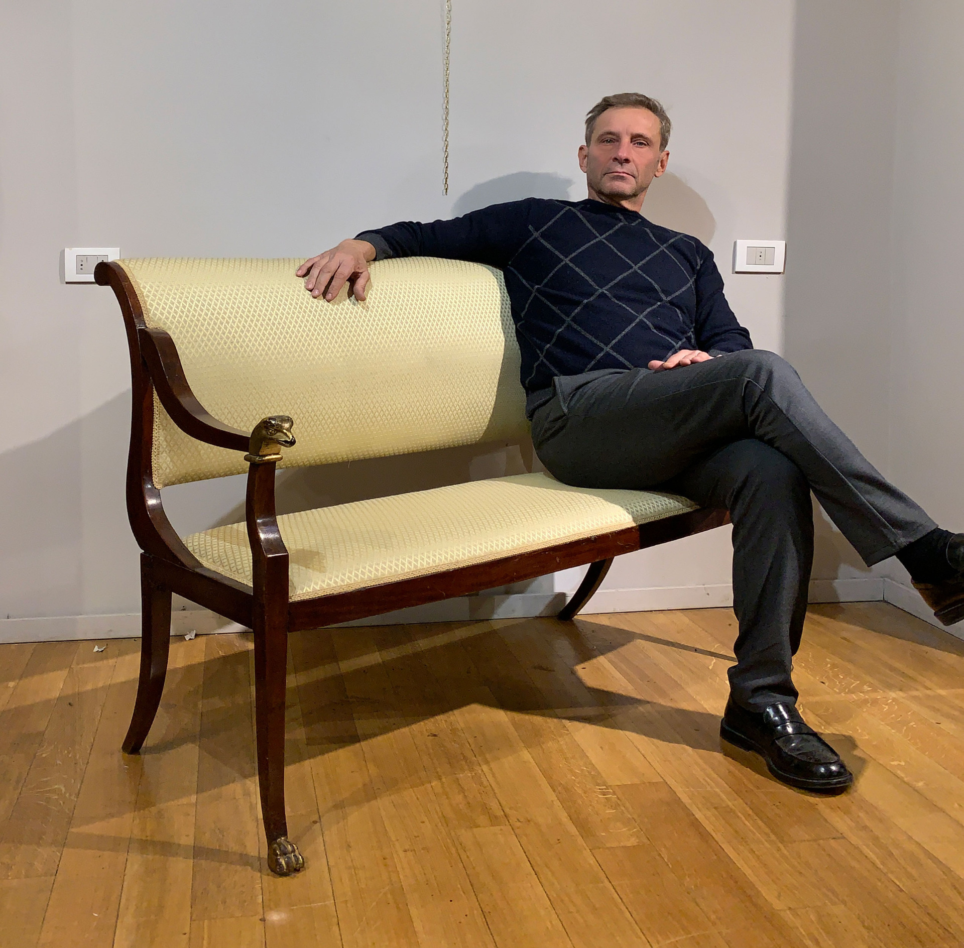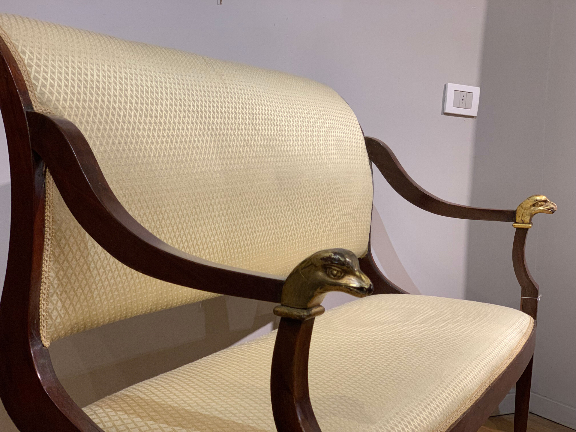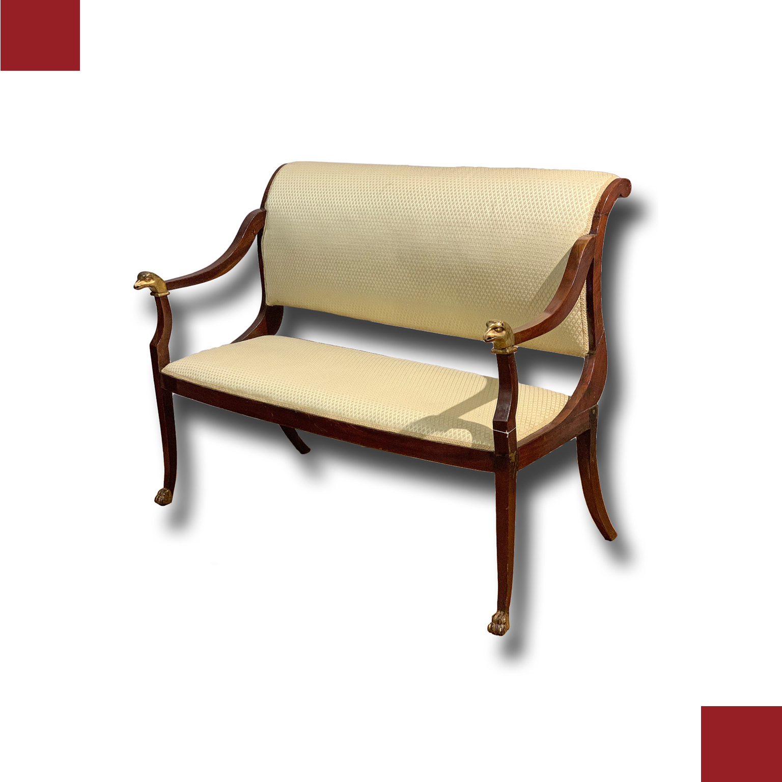 Elegante divanetto direttorio in massello di mogano con quattro gambe a sciabola e braccioli ricurvi con piedi ferini e finali in legno intagliato e dorato a oro zecchino realizzati a forma di testa di acquila.