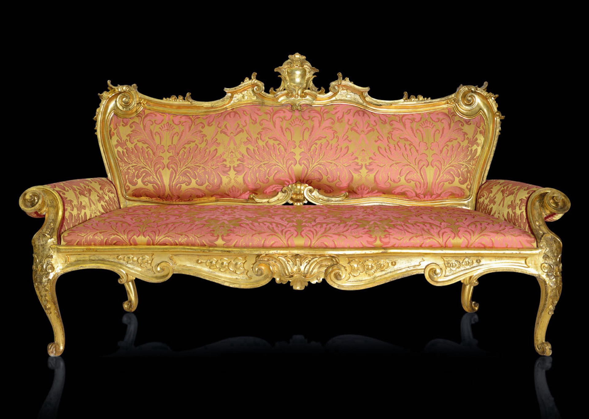 Prestigioso divano da parata, riccamente scolpito e dorato, notevole esempio del repertorio decorativo tipico del Luigi XIV, con elementi di particolare sontuosità per la risoluzione scultorea dell’intaglio: si inserisce nel periodo Barocco come esemplare dell’ebanisteria romana, con una lavorazione composta da rigogliose volute intrecciate a ghirlande.