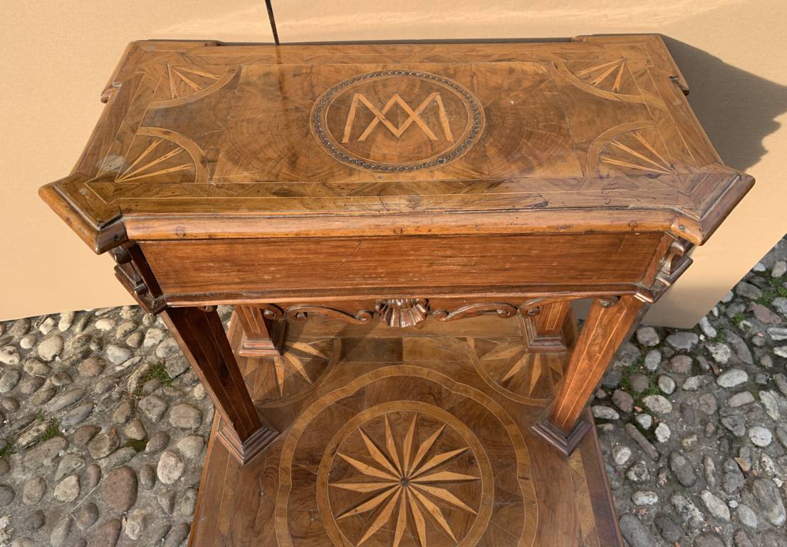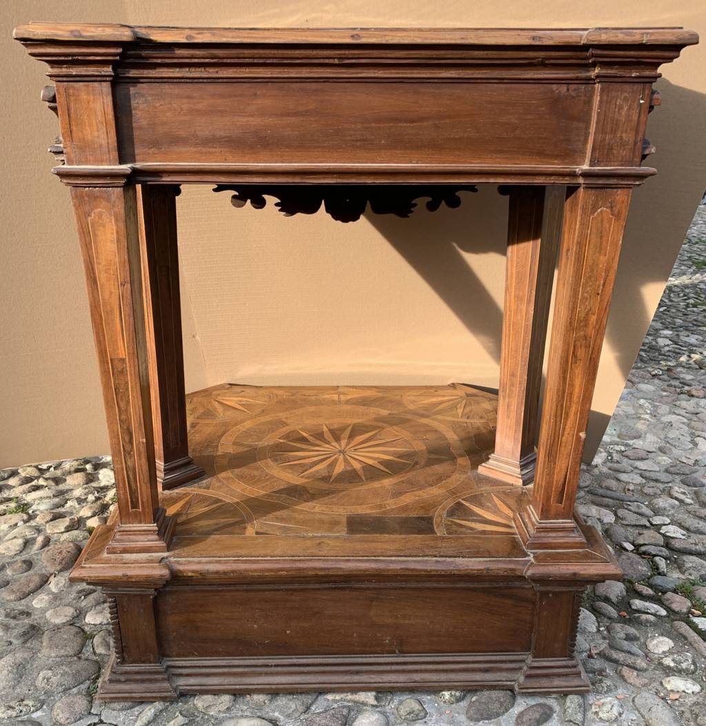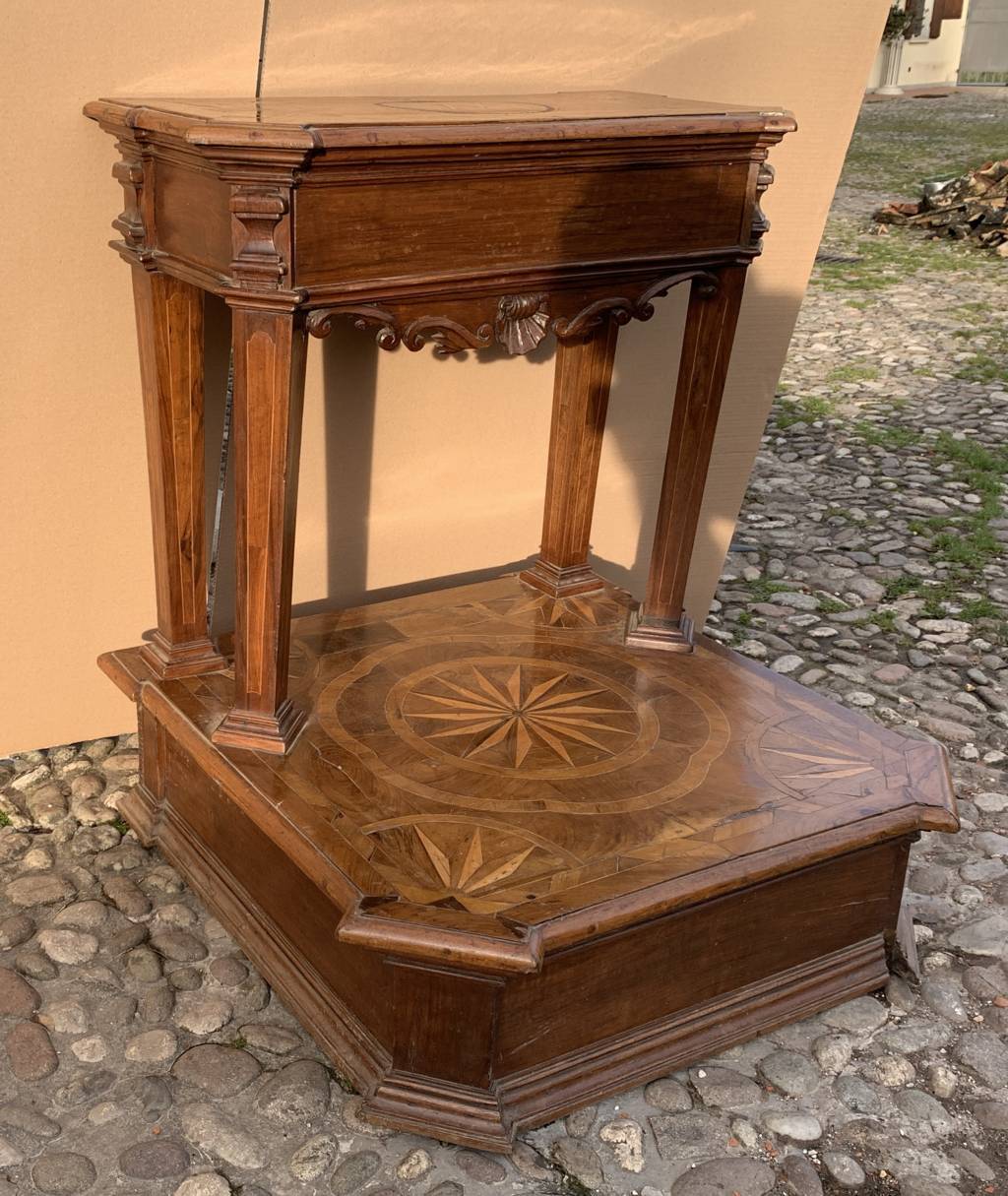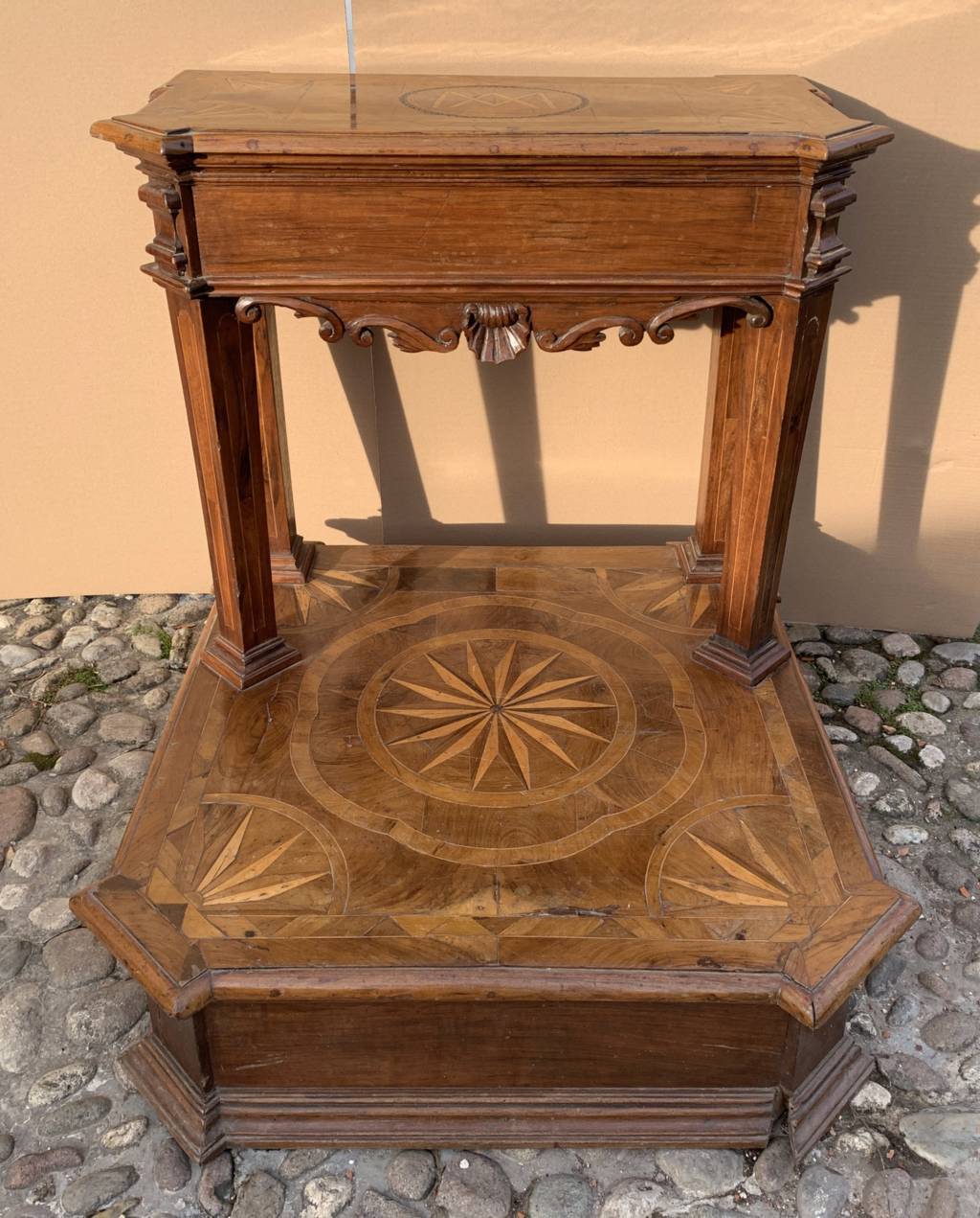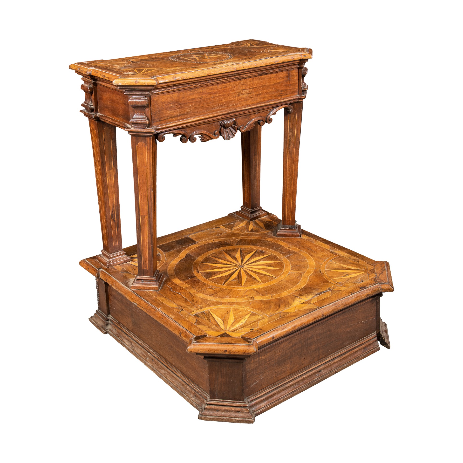 Inginocchiatoio in legno intagliato e intarsiato. Roma, XVIII secolo.