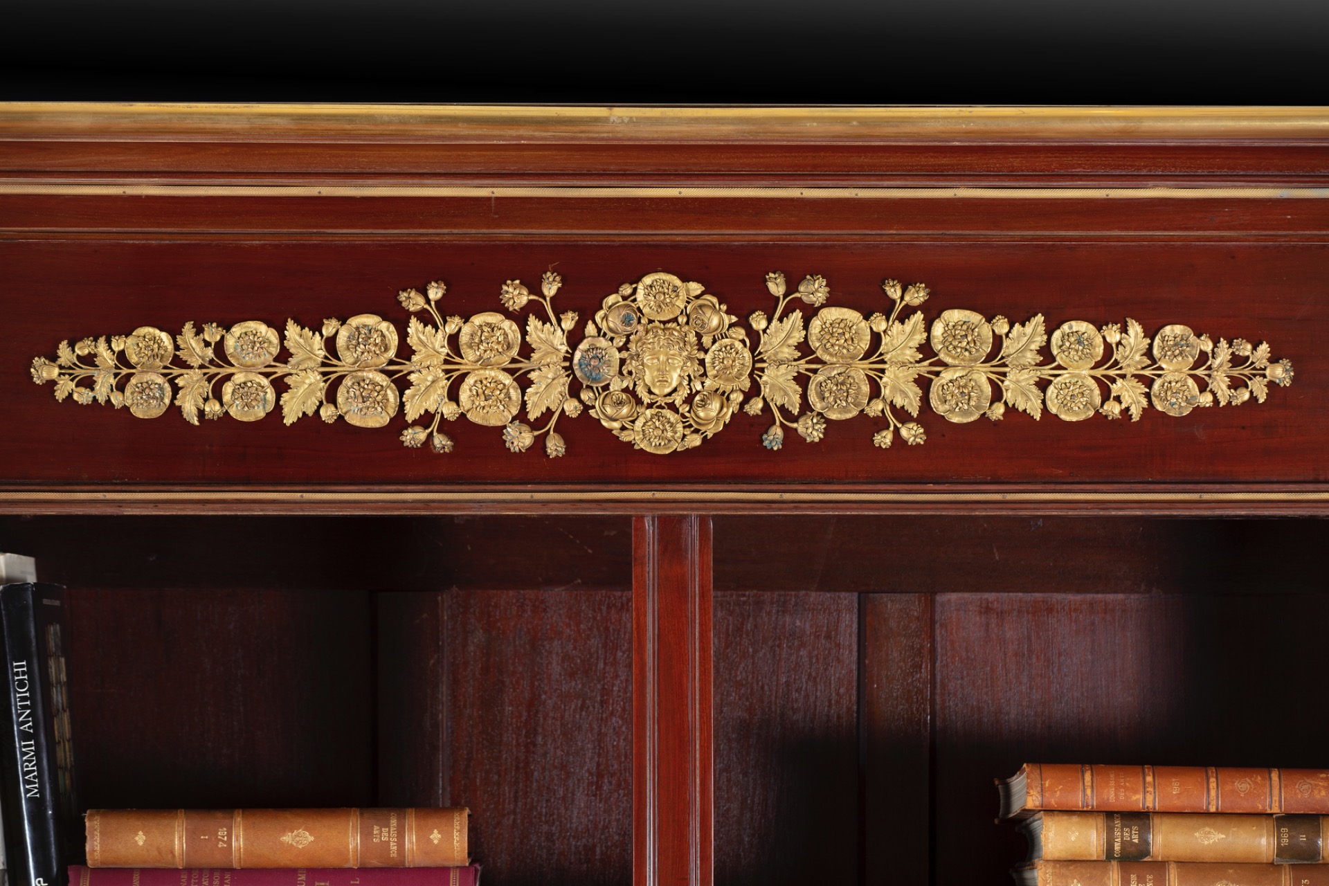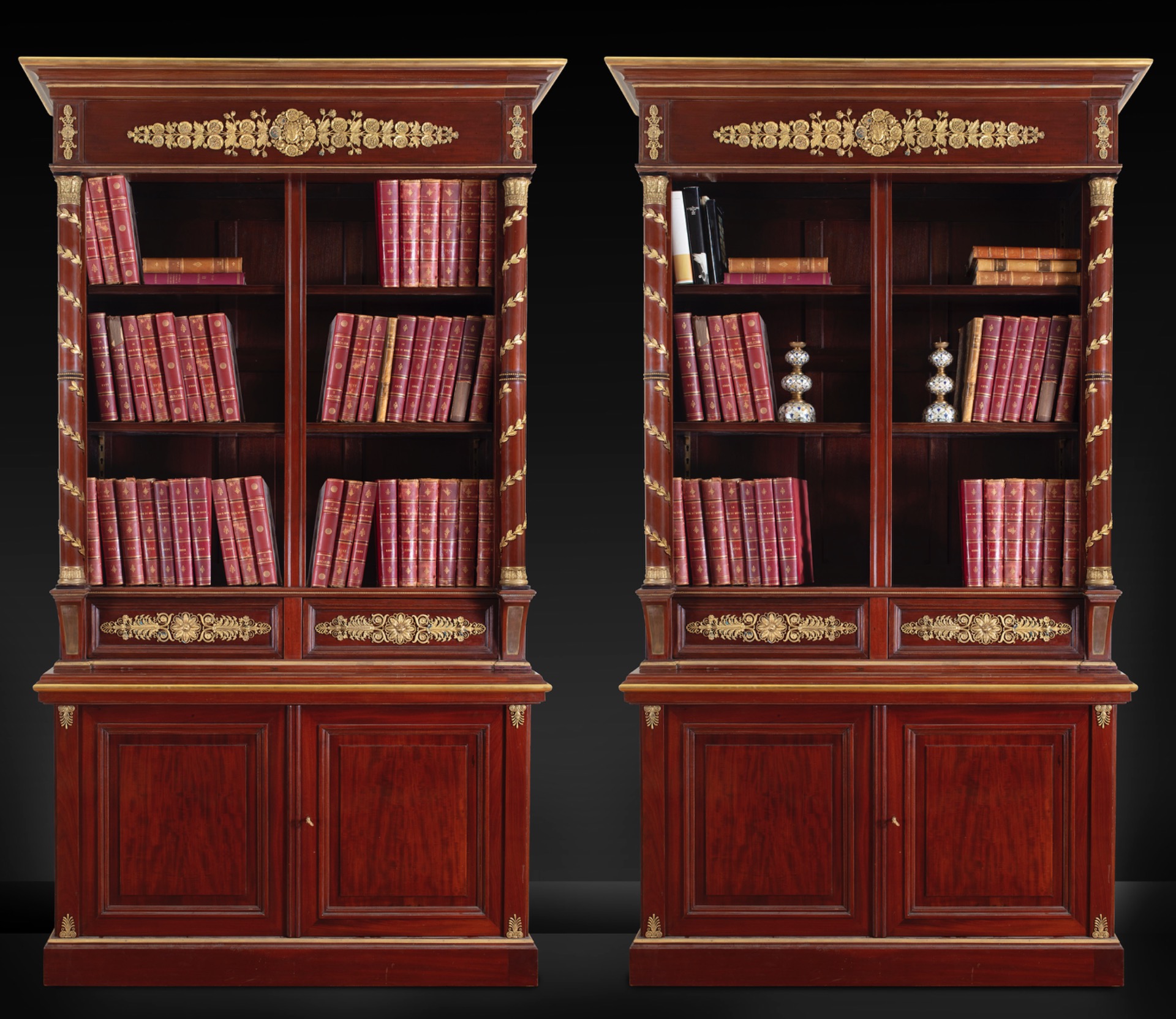 La coppia di mobili è ornata da numerose decorazioni in bronzo dorato e finemente cesellato con palmette e fregi a motivo vegetale nella parte superiore e inferiore agli scaffali e altri decori in bronzo sugli angoli della facciata. L’elaborata decorazione in alto presenta al centro una maschera e ai lati decori floreali e vegetali estremamente dettagliati.