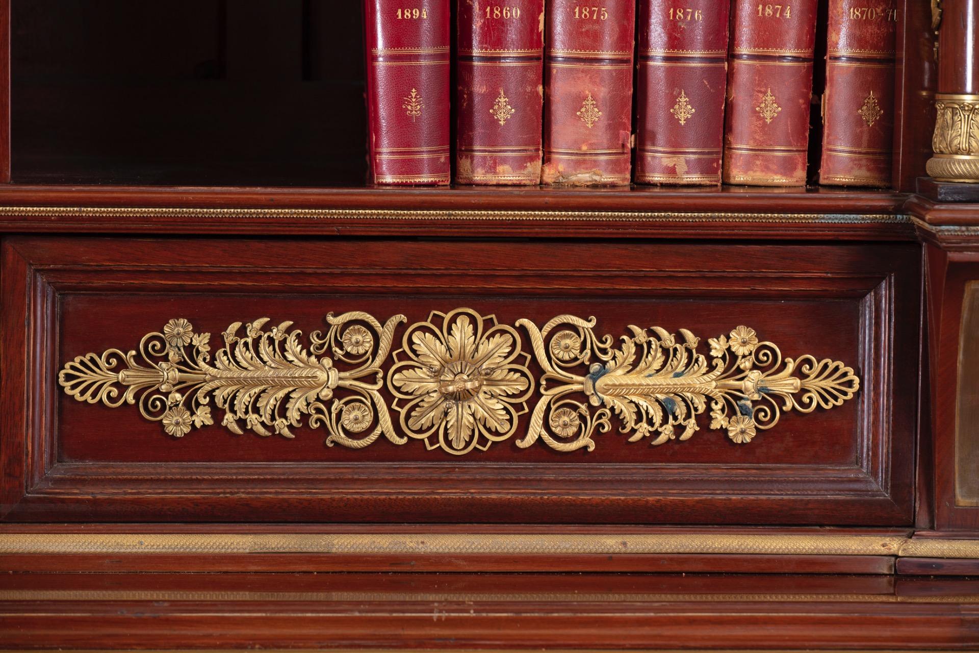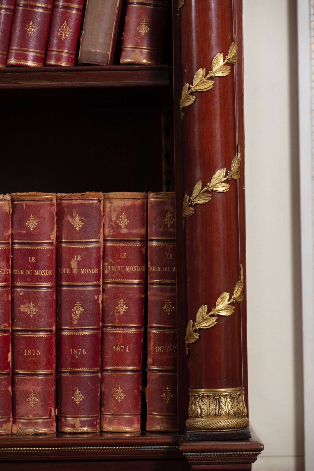 Inoltre, le librerie recano due colonne ai lati decorate da festoni in bronzo a forma di foglie d’alloro attorcigliati per tutta la lunghezza e terminanti nella parte superiore della colonna con un capitello dorato. I capitelli superiori, minuziosamente lavorati, sono caratterizzati da un motivo vegetale che ricorda i capitelli egizi palmiformi, formati da foglie strette al fusto da un triplice laccio.