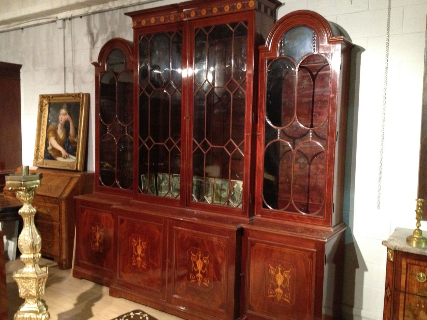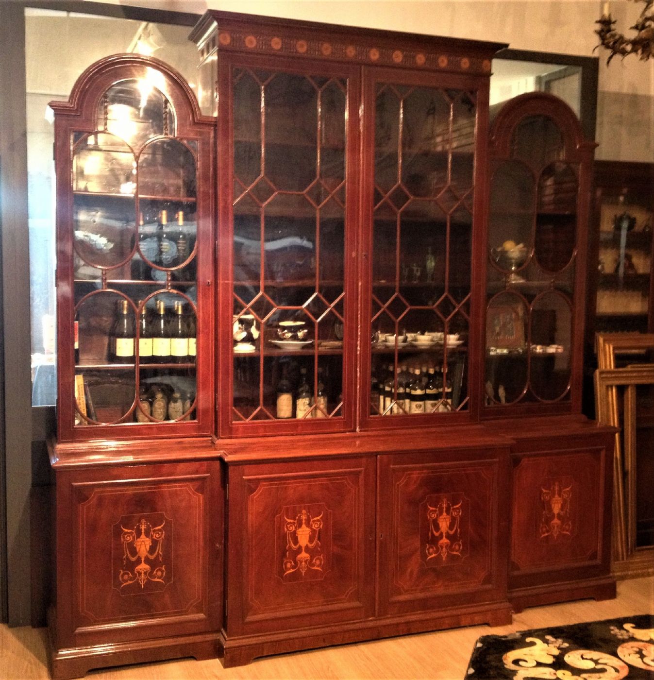 Questa grande e importante libreria, realizzata in Inghilterra nei primi anni dell’Ottocento, è interamente lastronata in piuma di mogano e finemente intarsiata sul fronte delle ante inferiori, con decori neoclassici quali vasi, ghirlande e girali.
