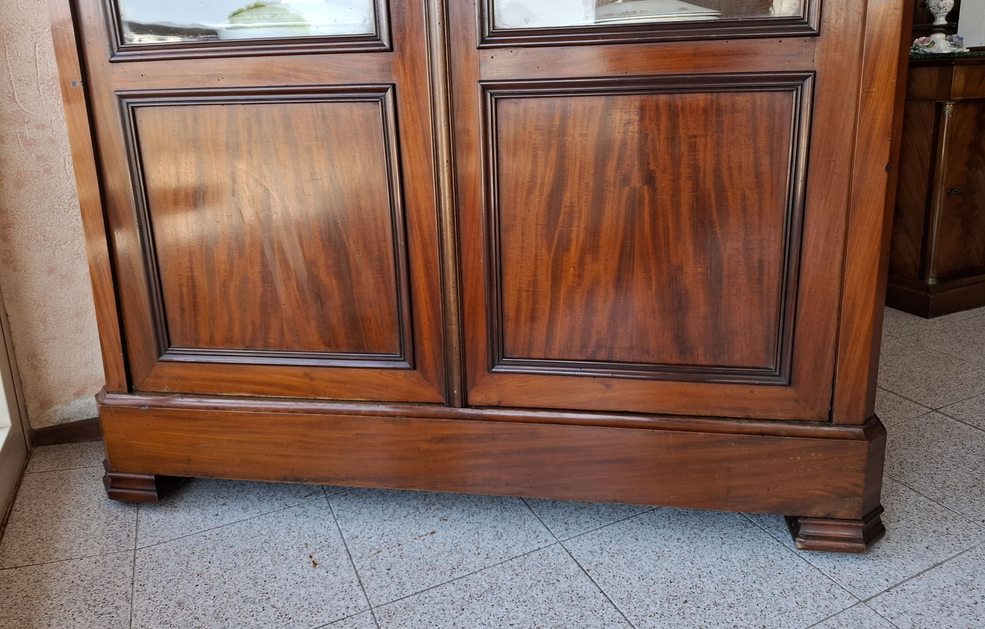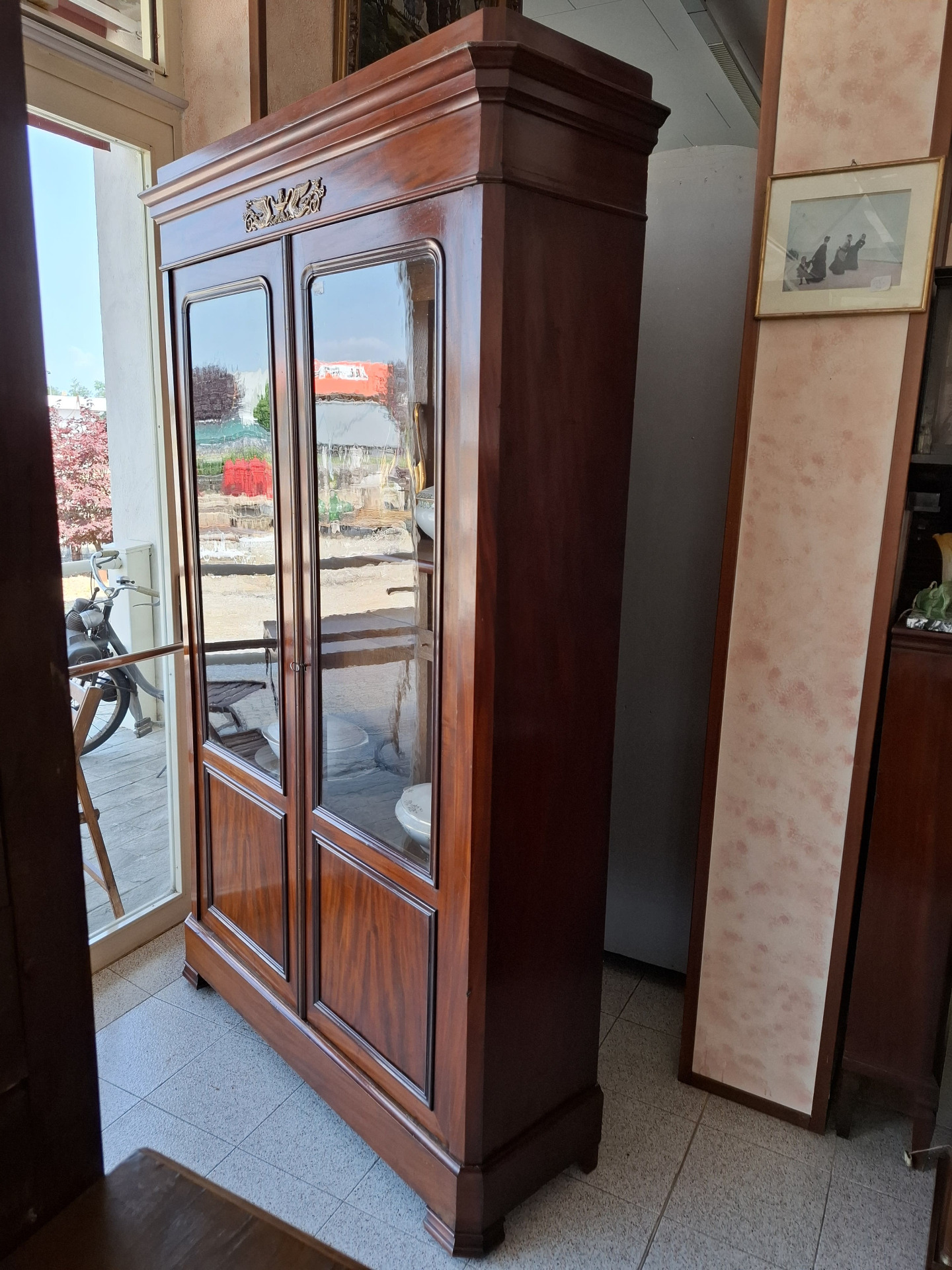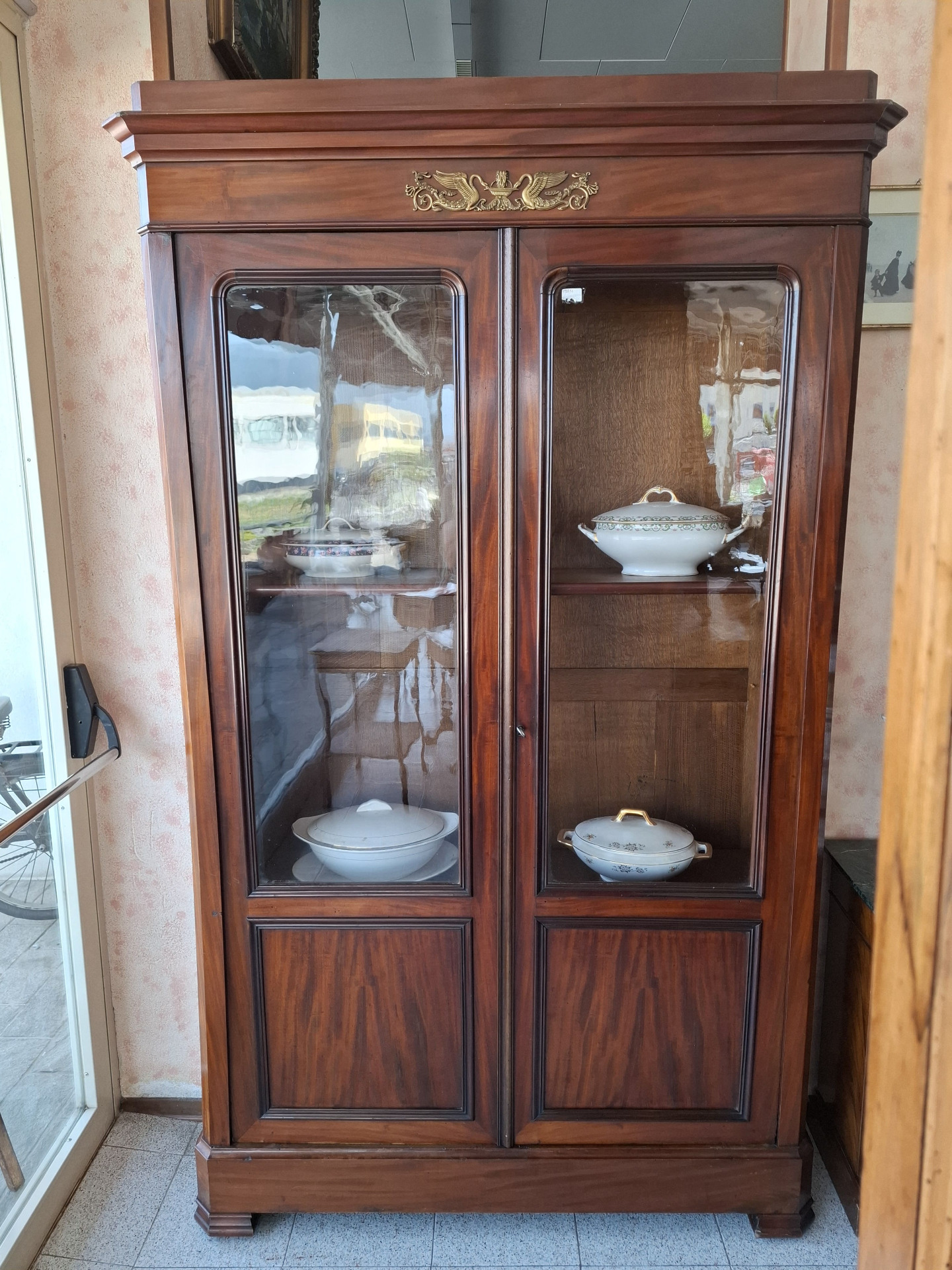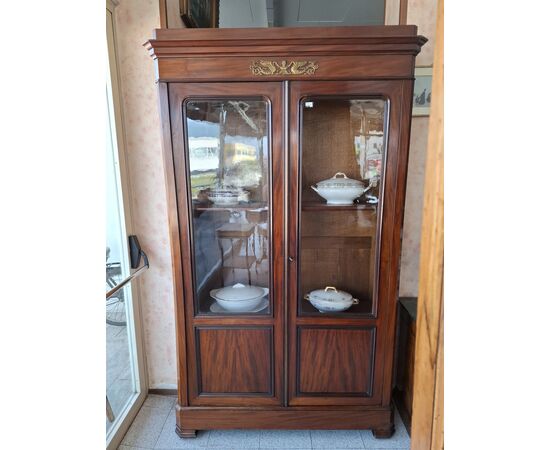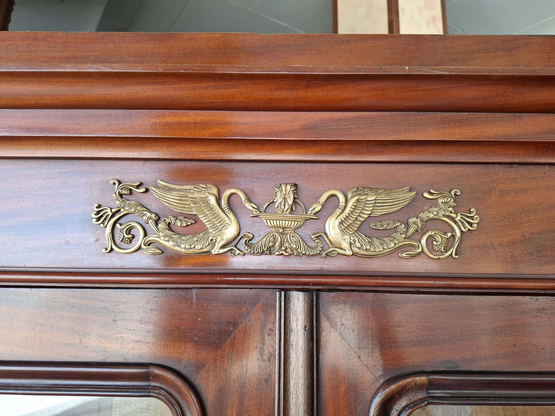in mogano con apertura a due ante parzialmente vetrate - ornamenti in bronzo decorati con cigni.