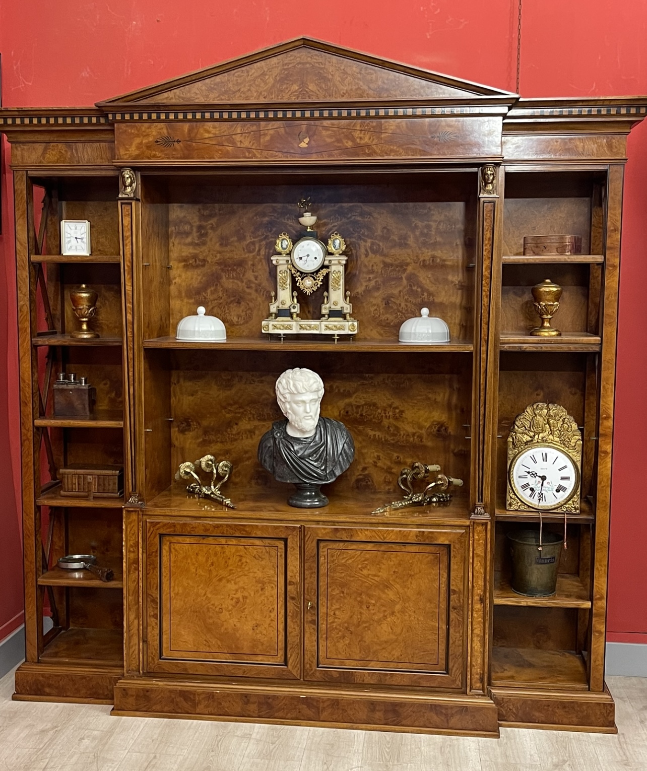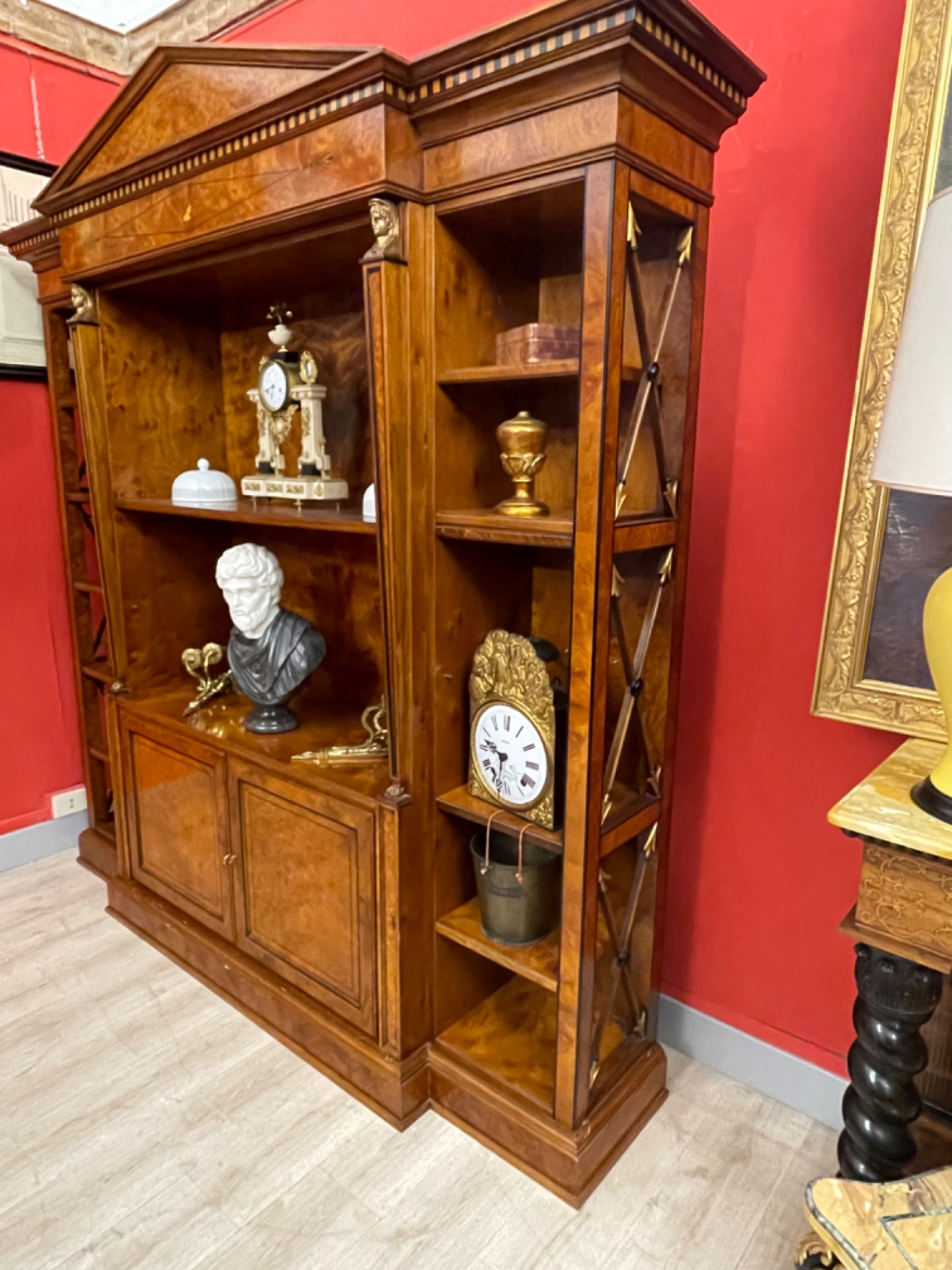 Libreria di stile neoclassico di eccezionale manifattura in radica di betulla olmo ebano con bronzi nei volti e piedi delle cariatidi . Manifattura italiana epoca anni 60