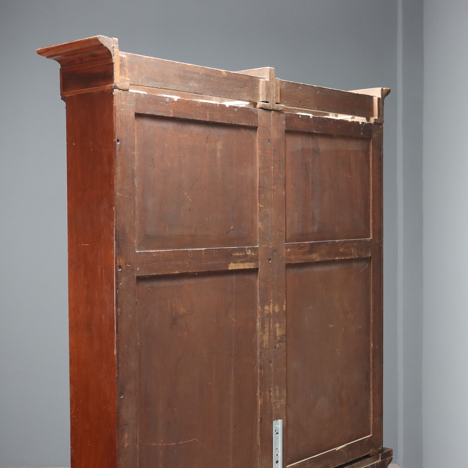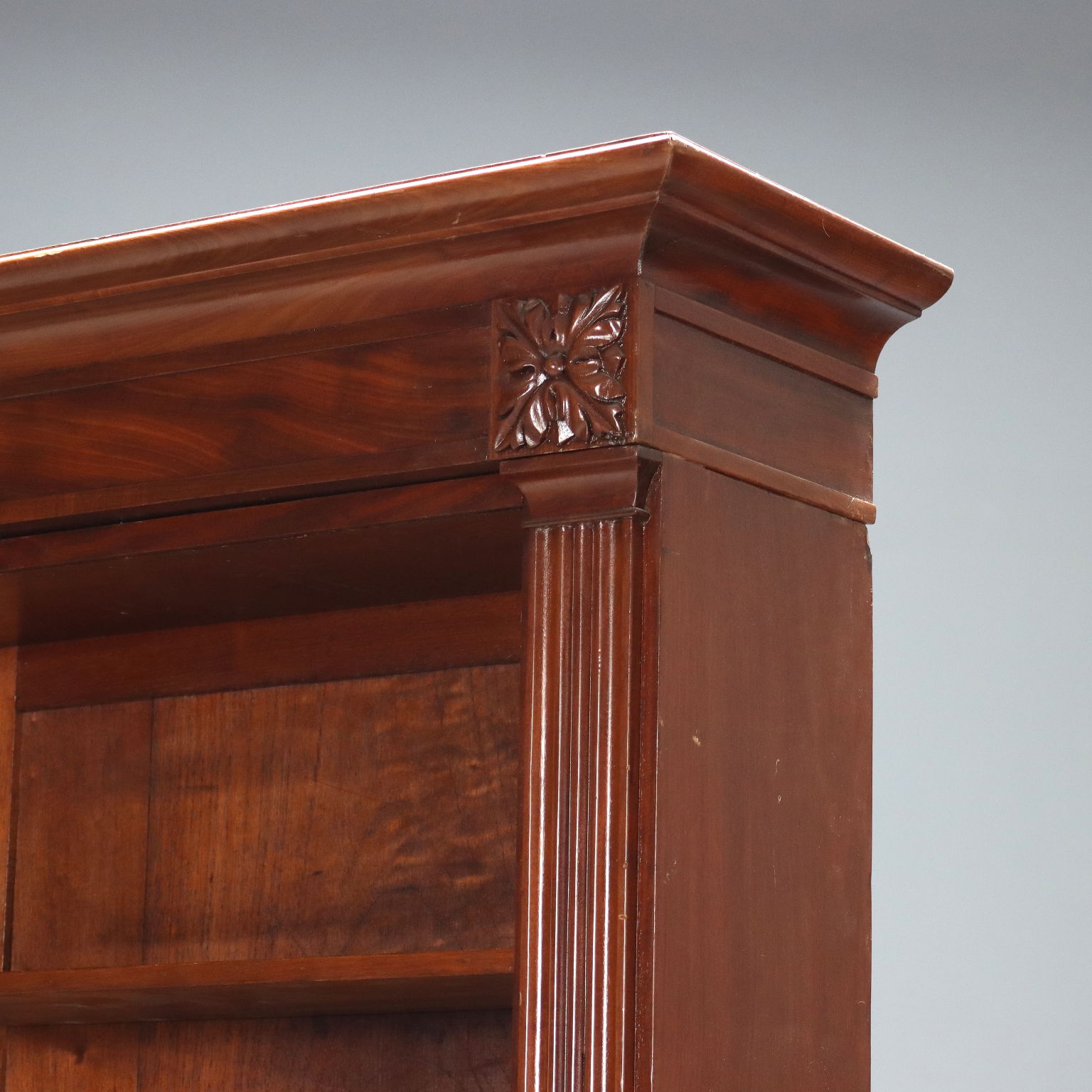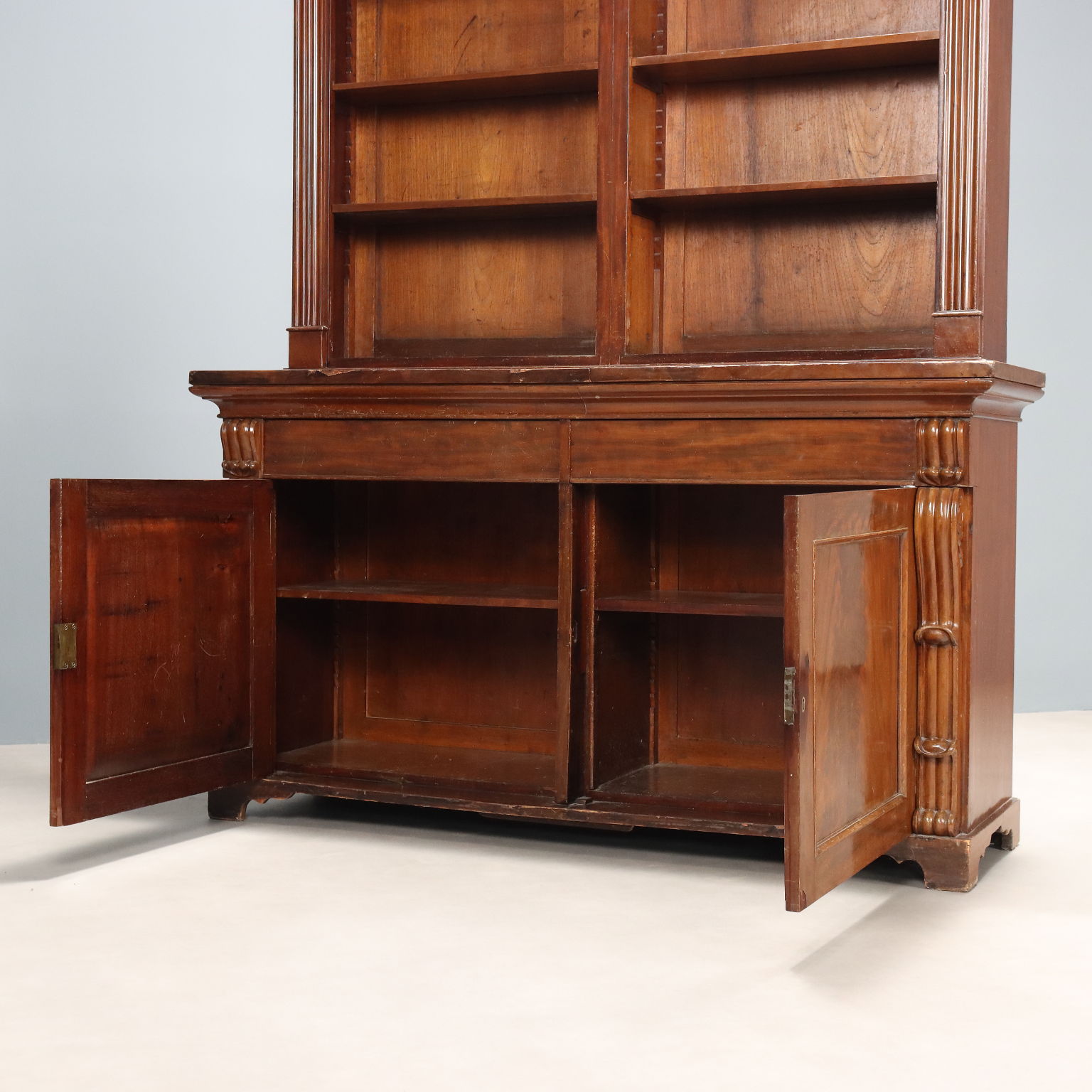 Libreria Vittoriana in mogano e piuma di mogano. Base con coppia di ante pannellate sormontate da cassetti mossi, montanti con intagli a ricciolo. Base inferiore con piedi a mensola non coeva. Alzata composta da due elementi a giorno con quattro ripiani. Modifiche. Inghilterra, fine XIX Secolo.