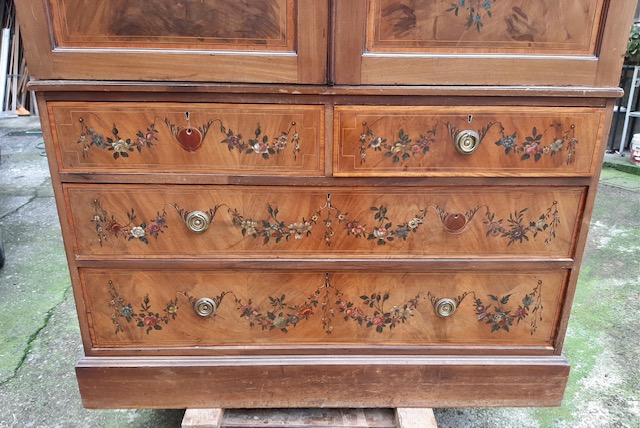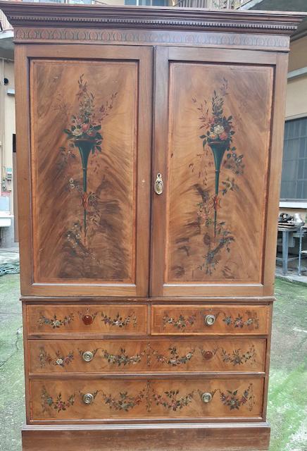 Curioso cassettone con alzata dipinto con base floreale. Il mobile inglese viene consegnato restaurato. Misure: cm.125 x 53 x 210 di altezza.