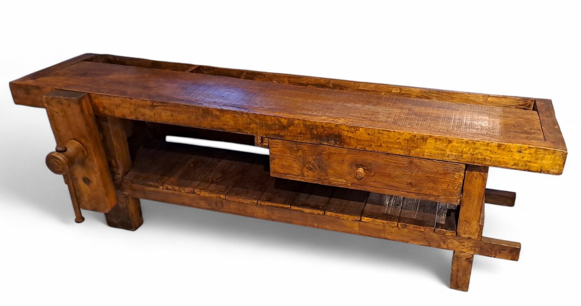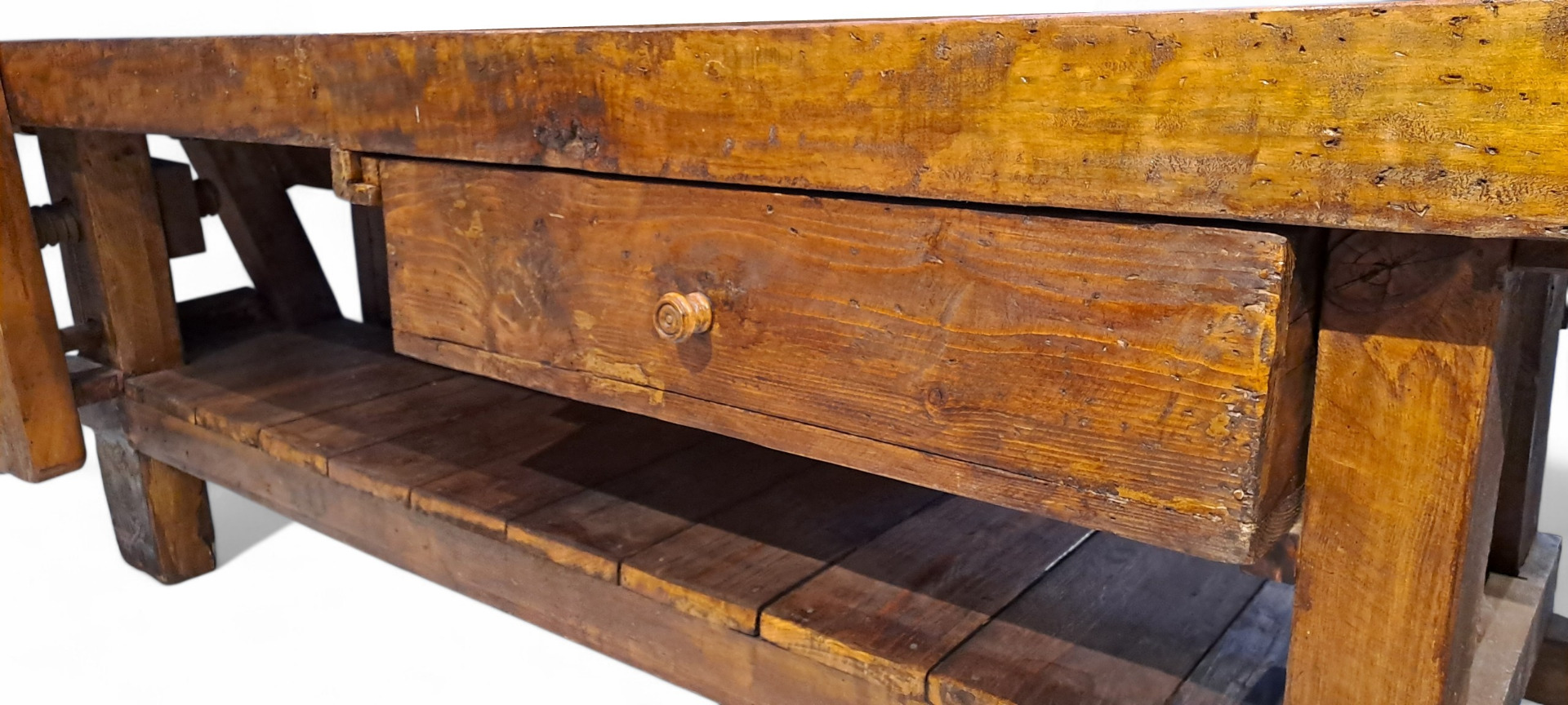 Questo bancone da lavoro è stato sapientemente realizzato in legno massello di pioppo all'inizio del XX secolo.