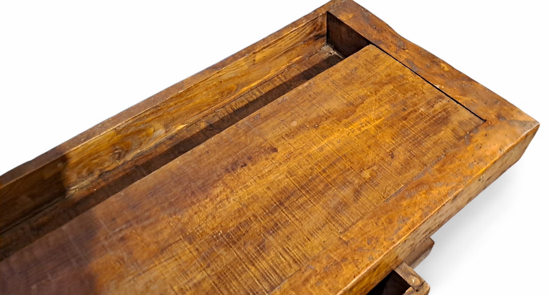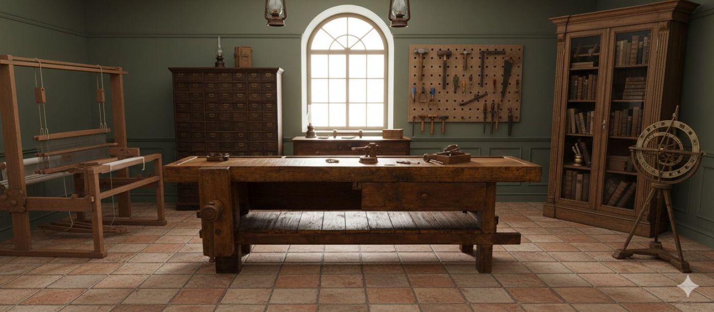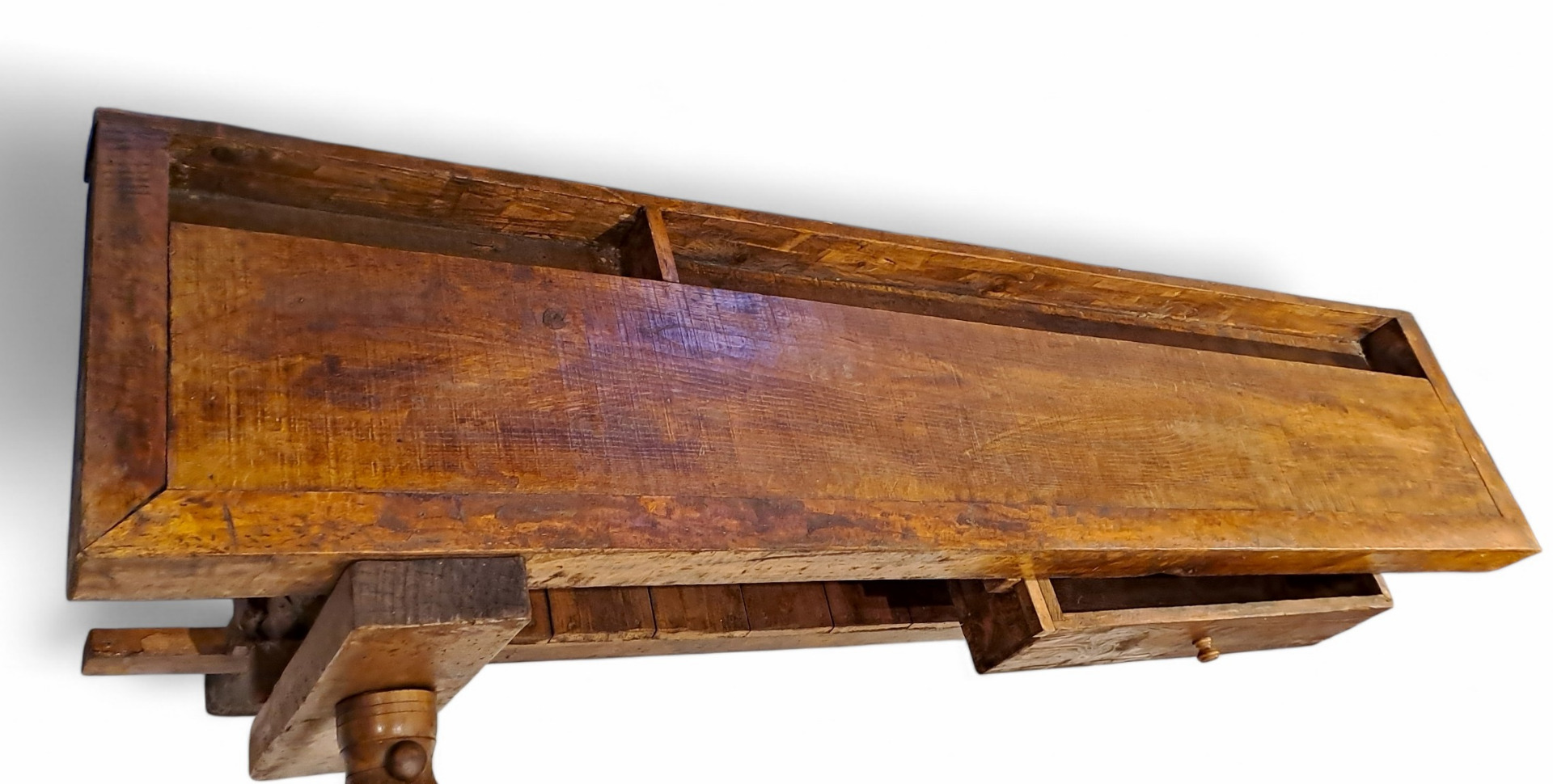 Piano di Lavoro: Il piano superiore ha una profonda vasca per la raccolta di attrezzi o materiali, tipica dei banchi da lavoro tradizionali.