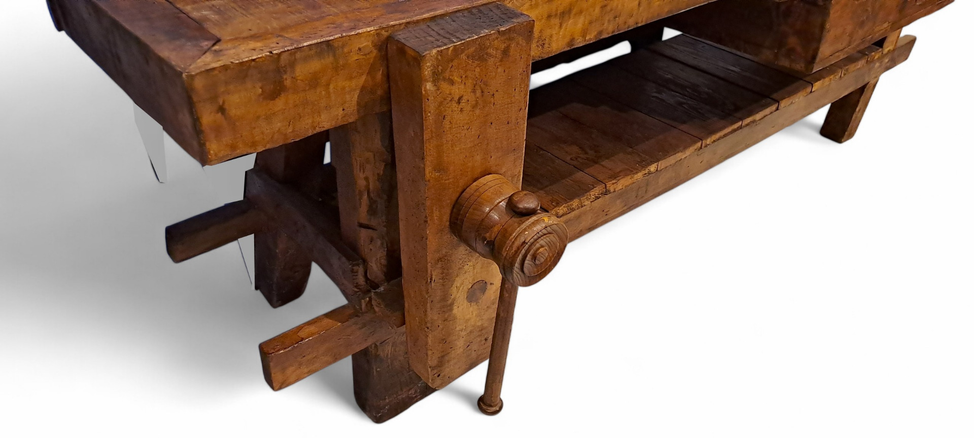 Morsa Originale: Presenta la morsa da falegname laterale in legno, completa di manovella e vite, pienamente funzionante e dal grande fascino estetico.