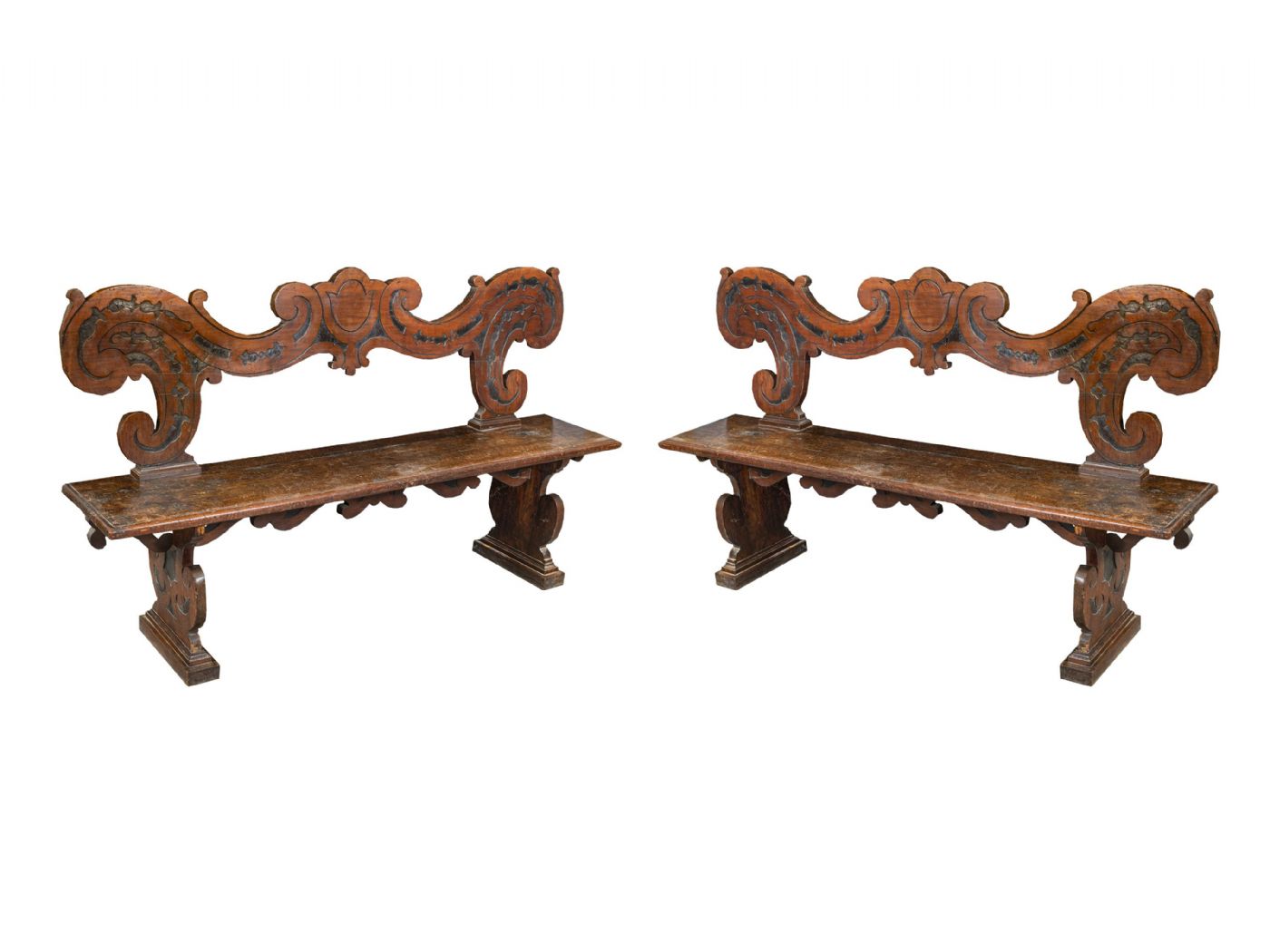 Coppia di panche nobiliari in massello di noce scolpito. Italia settentrionale, XVII secolo.