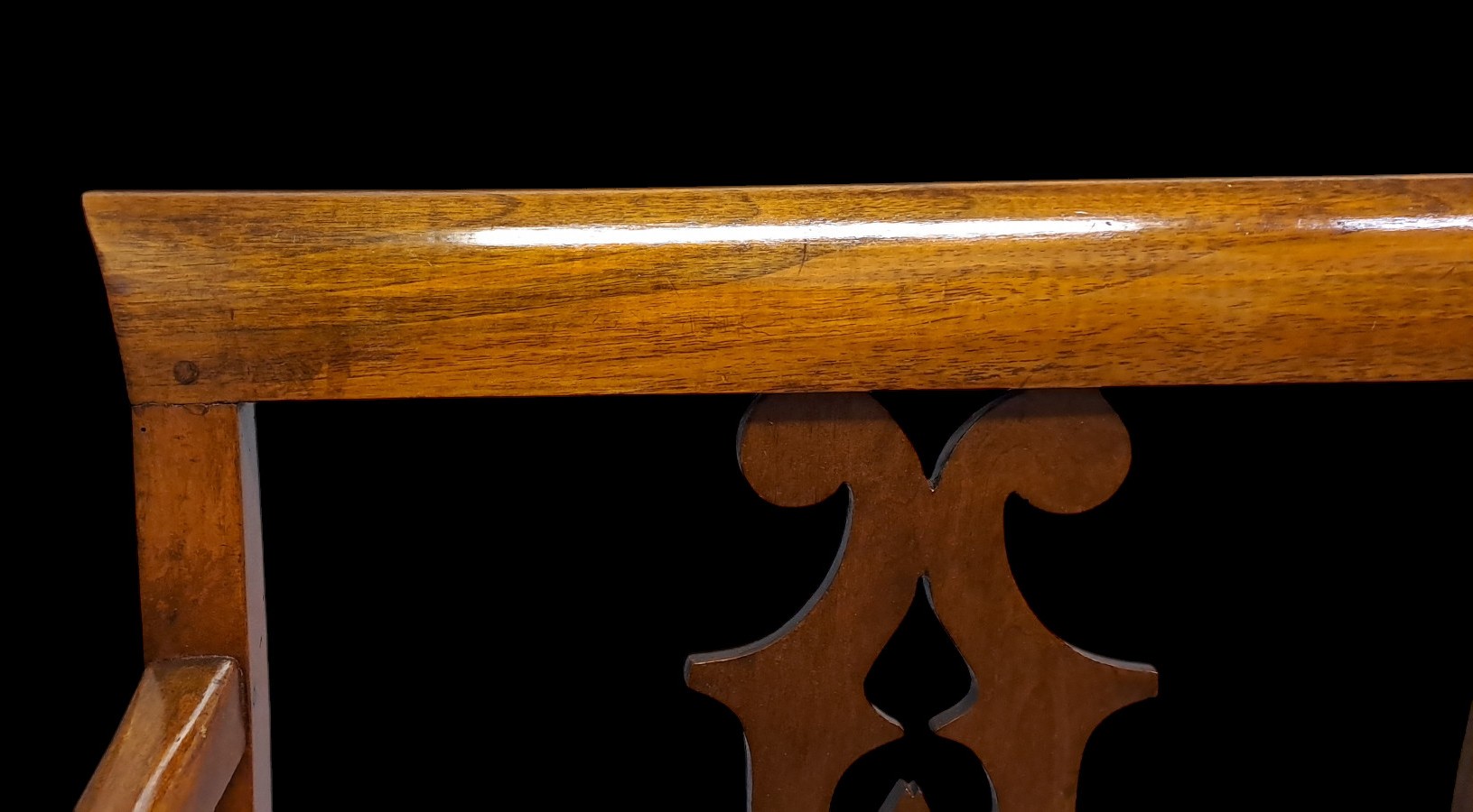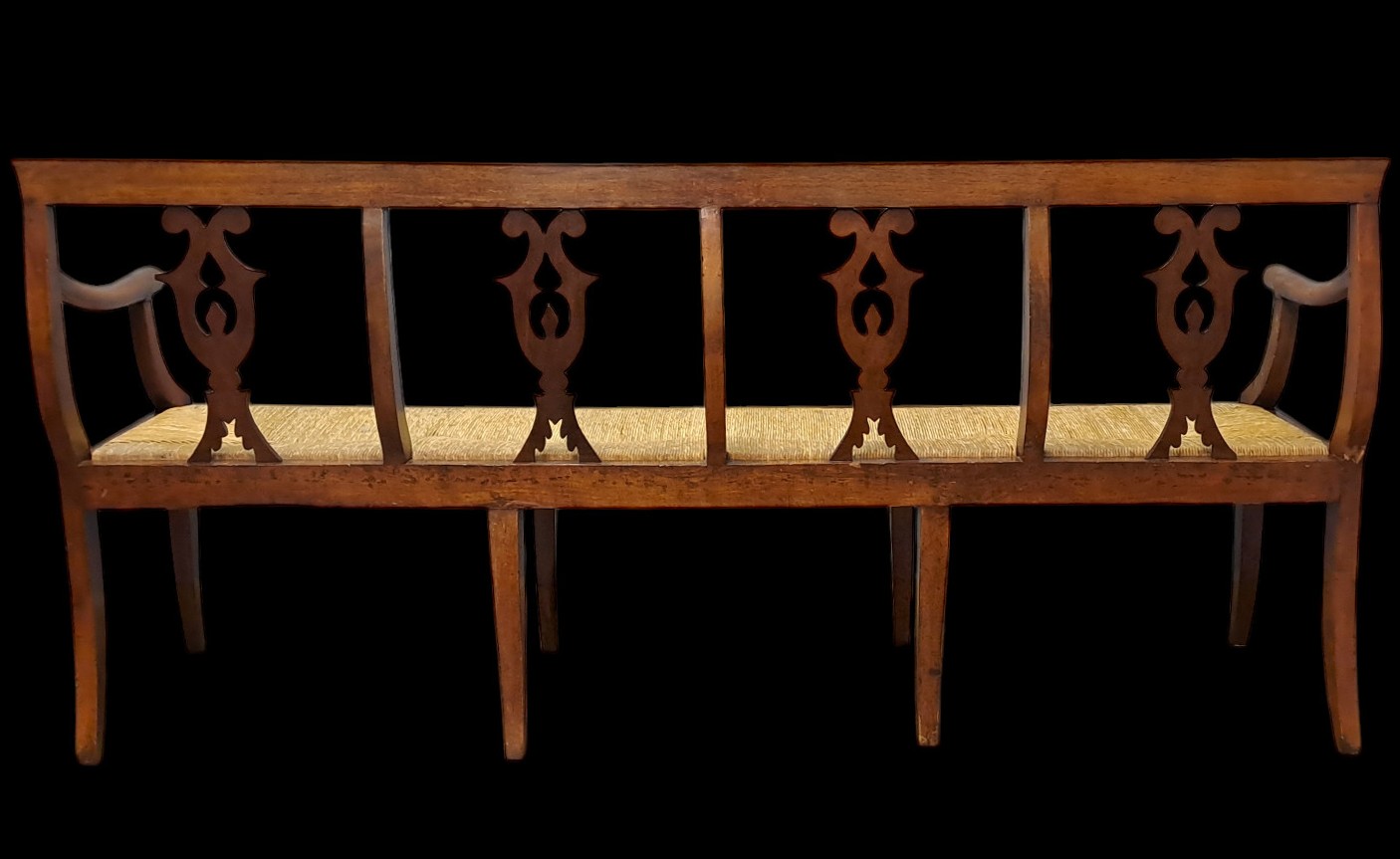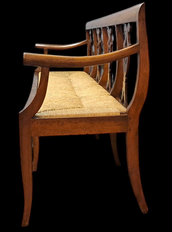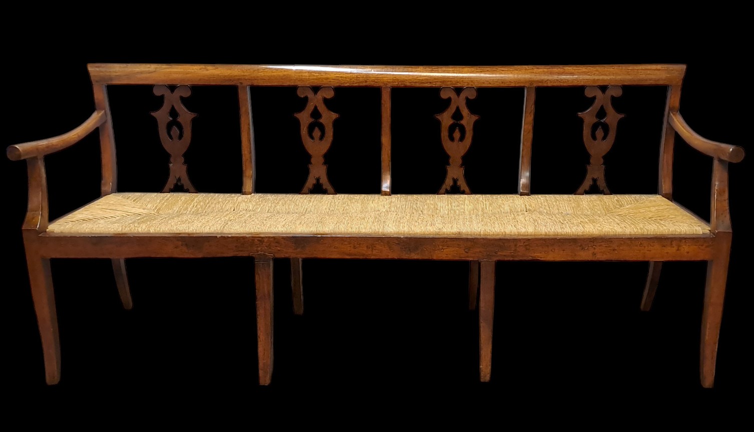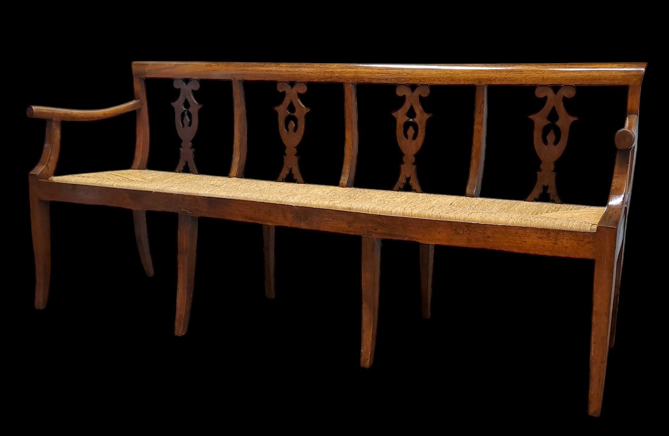 Panca in legno di noce.Schienale a giorno con cartelle traforate con motivo a soggetto fogliato, gambe a sciabola e braccioli curvilinei.