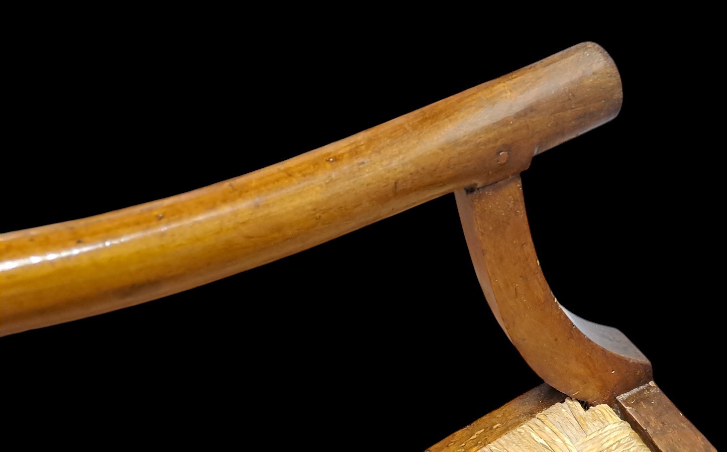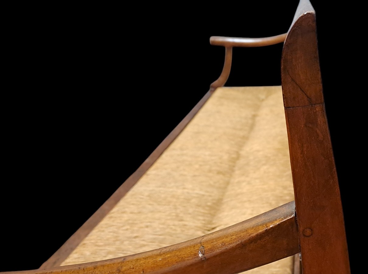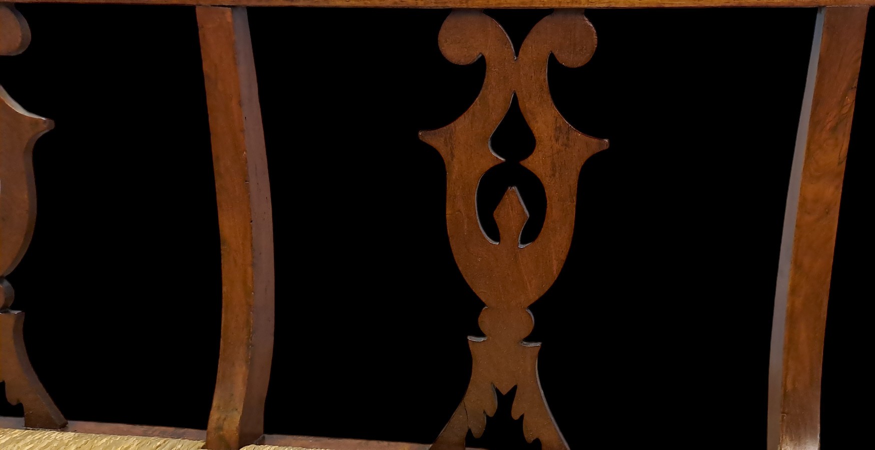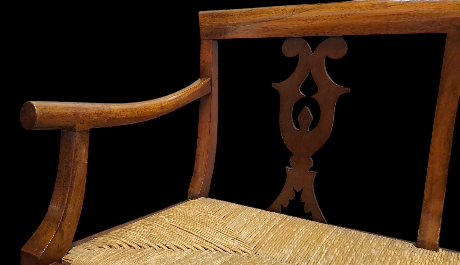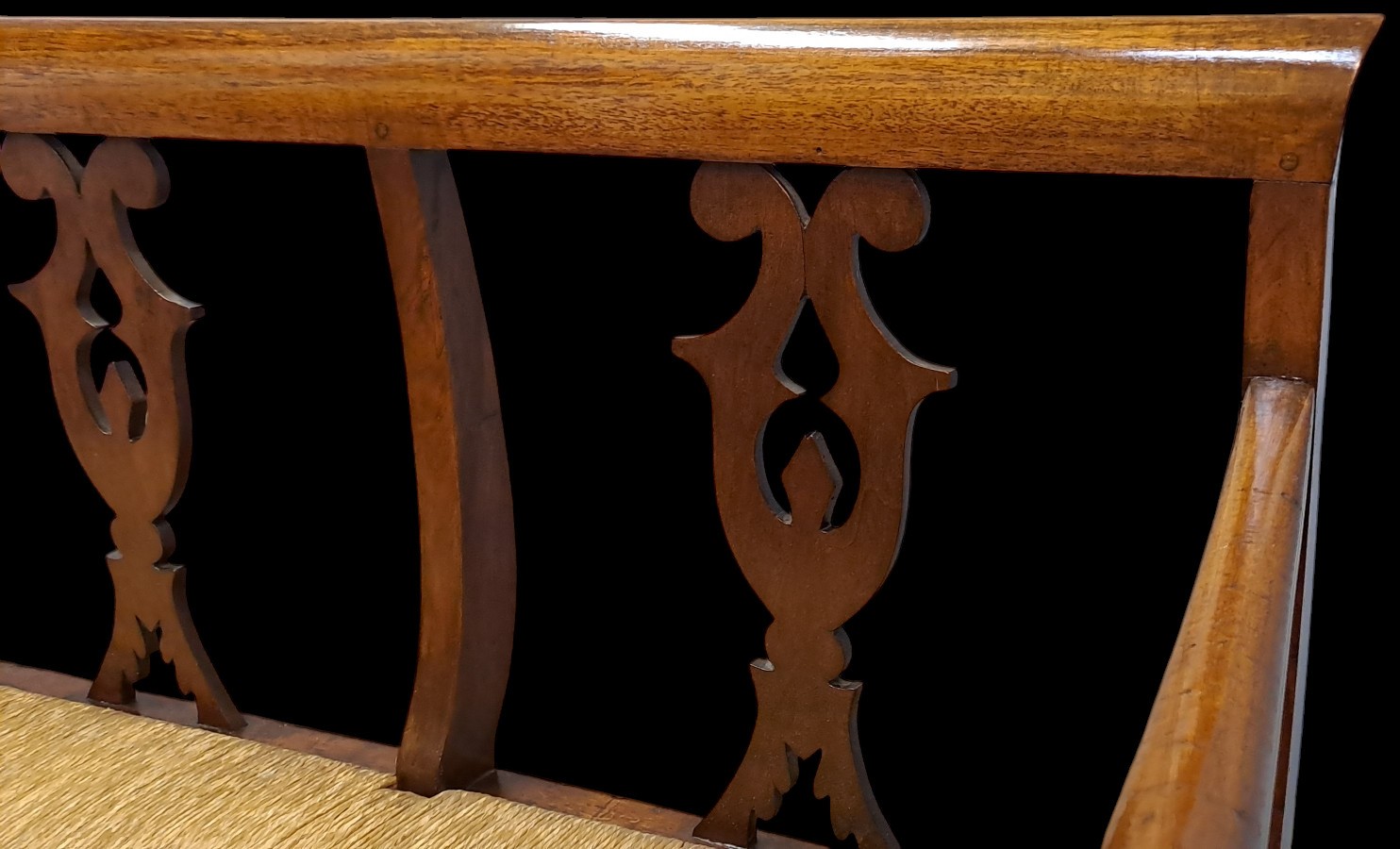 Panca in legno di noce.Schienale a giorno con cartelle traforate con motivo a soggetto fogliato, gambe a sciabola e braccioli curvilinei.
