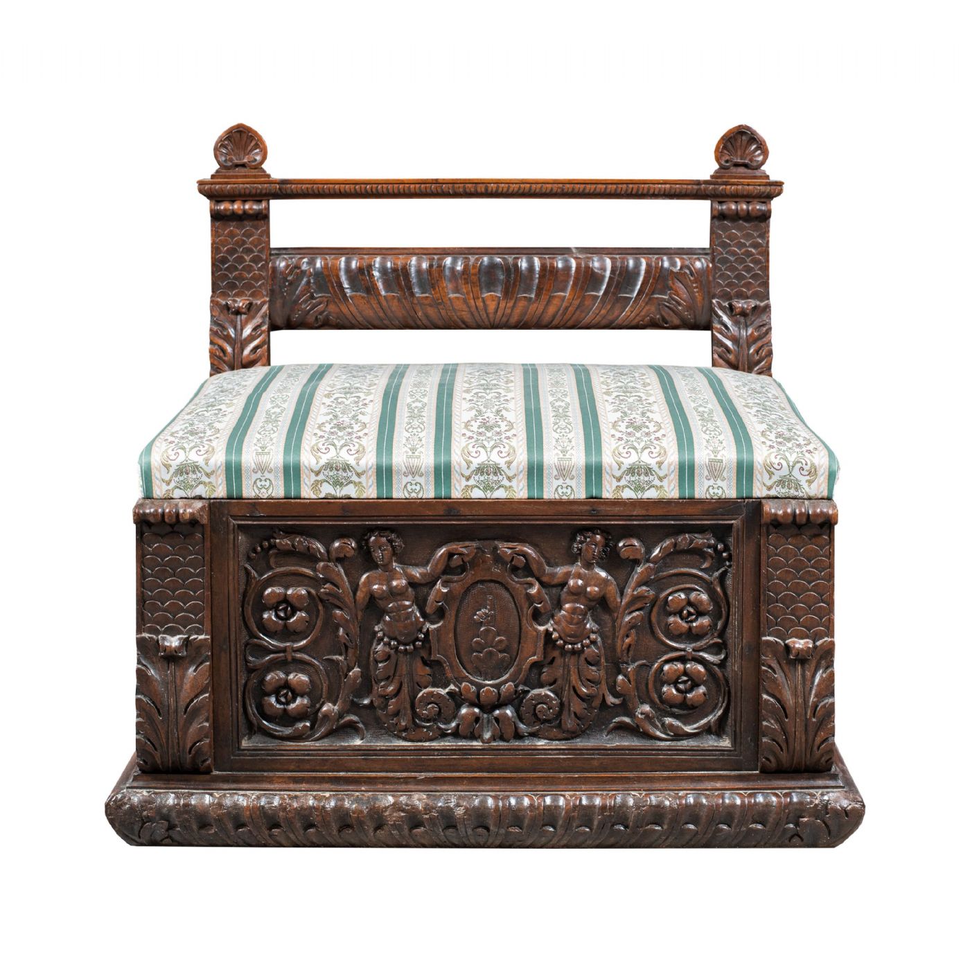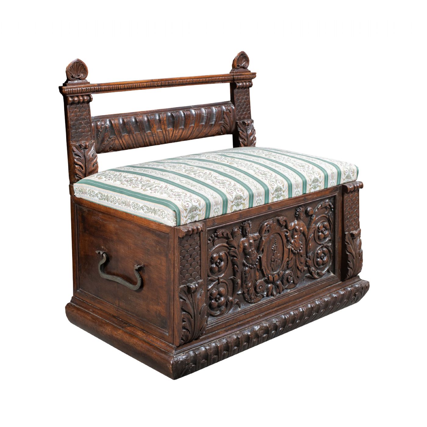 Interamente in legno di noce intagliato e scolpito. Originariamente una cassapanca, è stata adattata in epoca successiva.