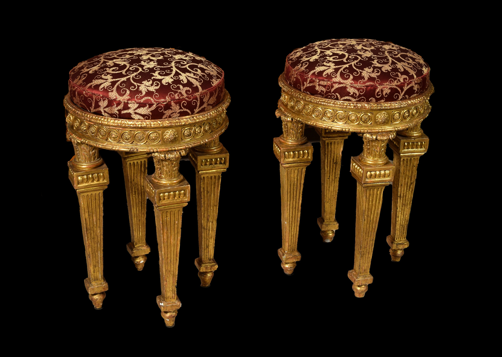 La pregevole coppia di sgabelli neoclassici, realizzata in Sicilia nella seconda metà del Settecento, si compone di una struttura lignea finemente intagliata e dorata. La seduta, foderata in seta bordeaux con motivi floreali dorati, poggia su una fascia circolare tripartita: la prima cornice è intagliata con piccole palmette; quella centrale presenta dei motivi geometrici circolari con all’interno degli elementi a forma di fiore; infine quella inferiore con motivi geometri tratto-punto-punto. Le quattro gambe, i cui piedi sono inscritti all’interno di uno spazio virtuale quadrangolare, sono molto ricche nella loro struttura. Originano da un capitello corinzio riccamente intagliato con foglie d’acanto che poggia su un elemento a sezione quadrangolare intagliato al suo interno. Da questo dipartono le gambe, a tronco di piramide rovesciata, scanalate e terminanti con piede composto da elementi geometrici quadrangolari e sferici.